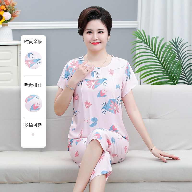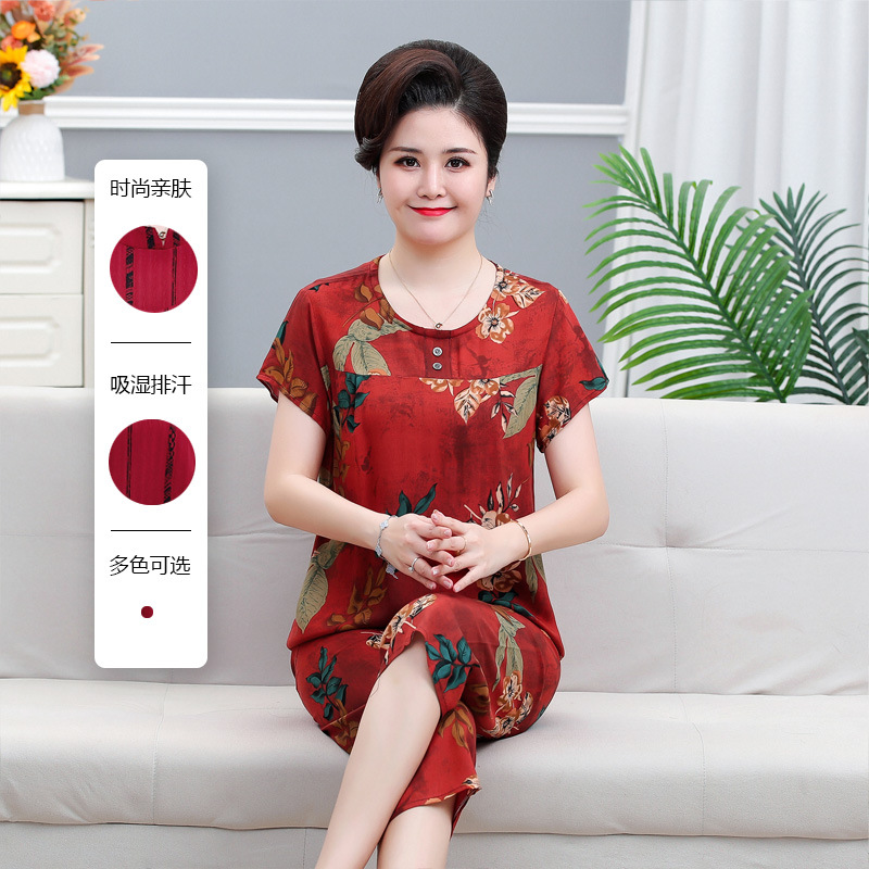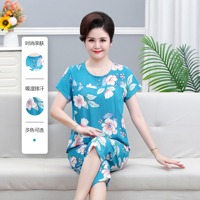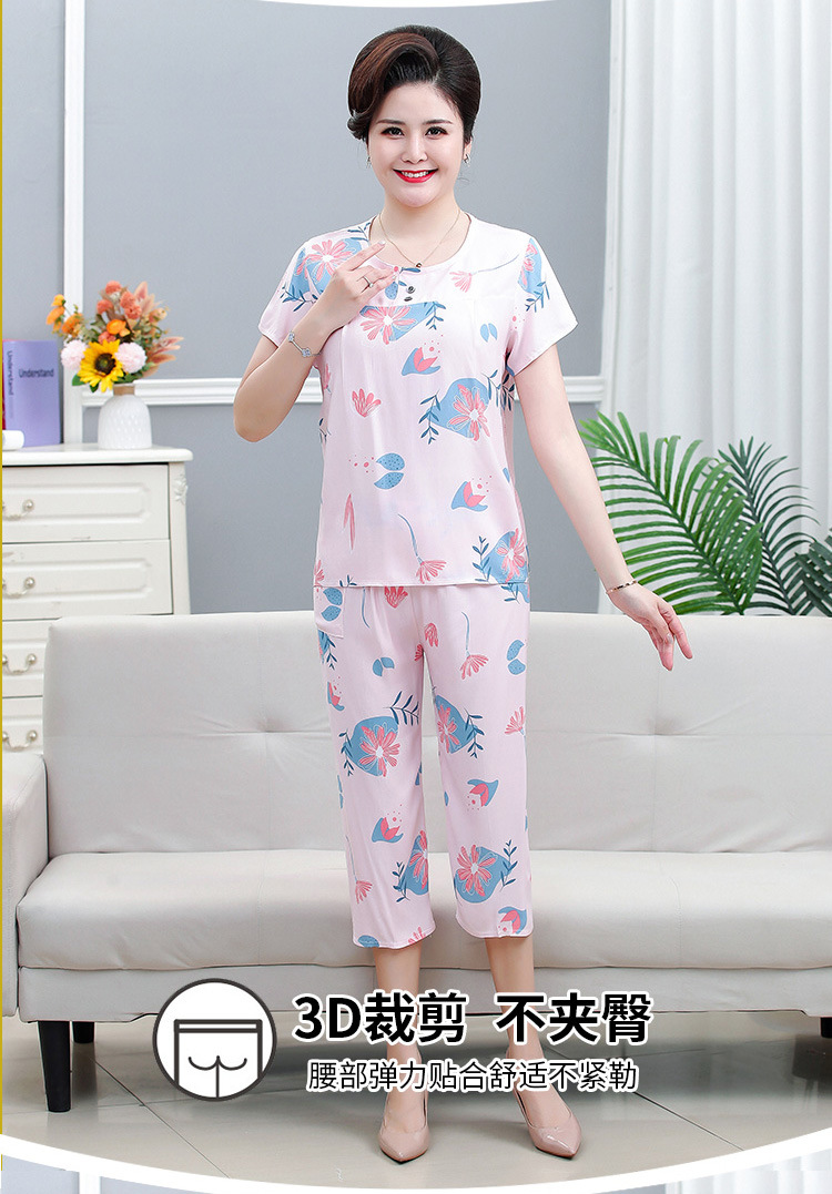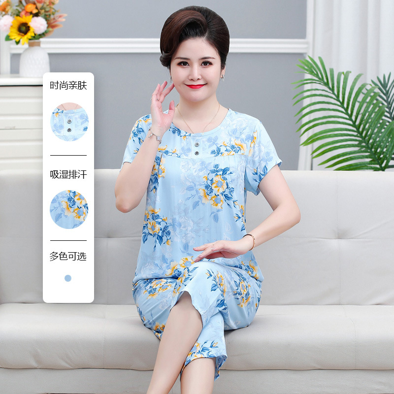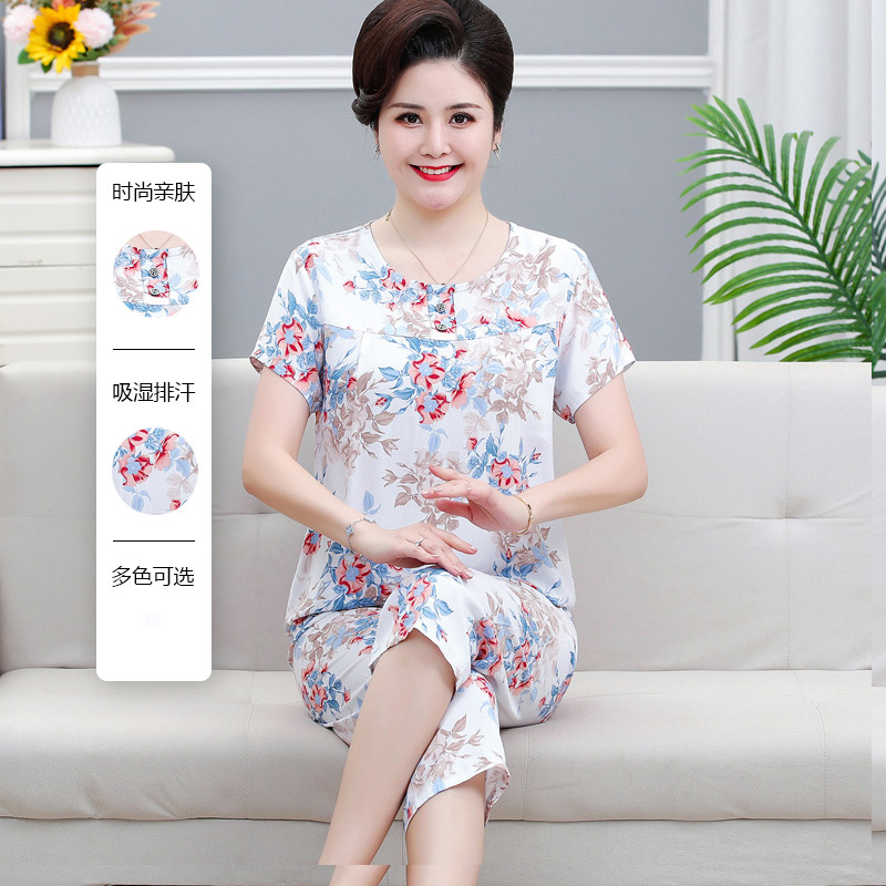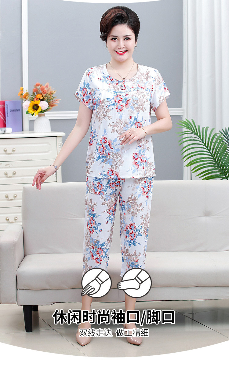면 실크 잠옷 세트 카프리 바지 여름 통기성 얇은 중년 및 노인 어머니 여성용 반팔 가정 의류