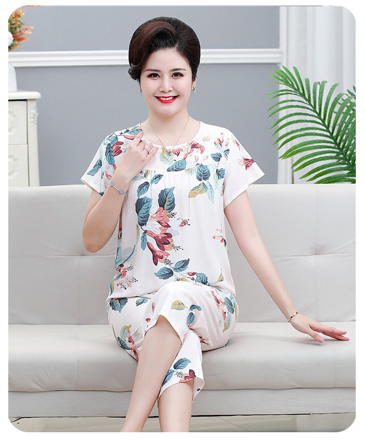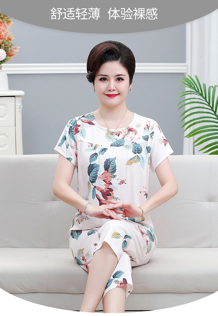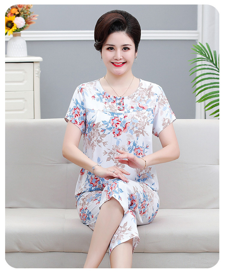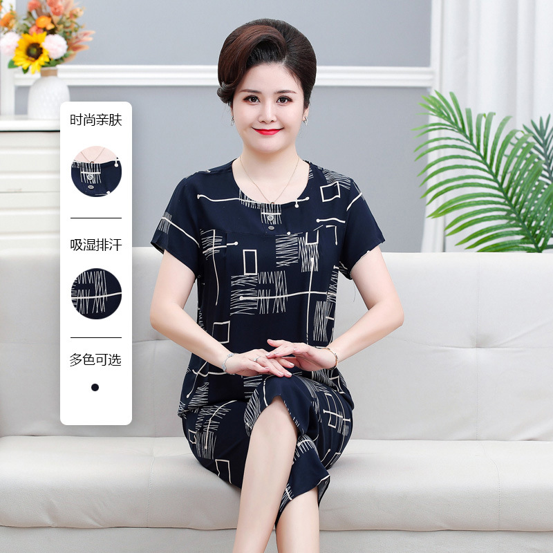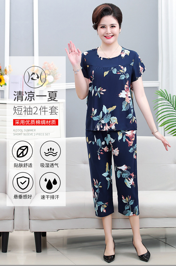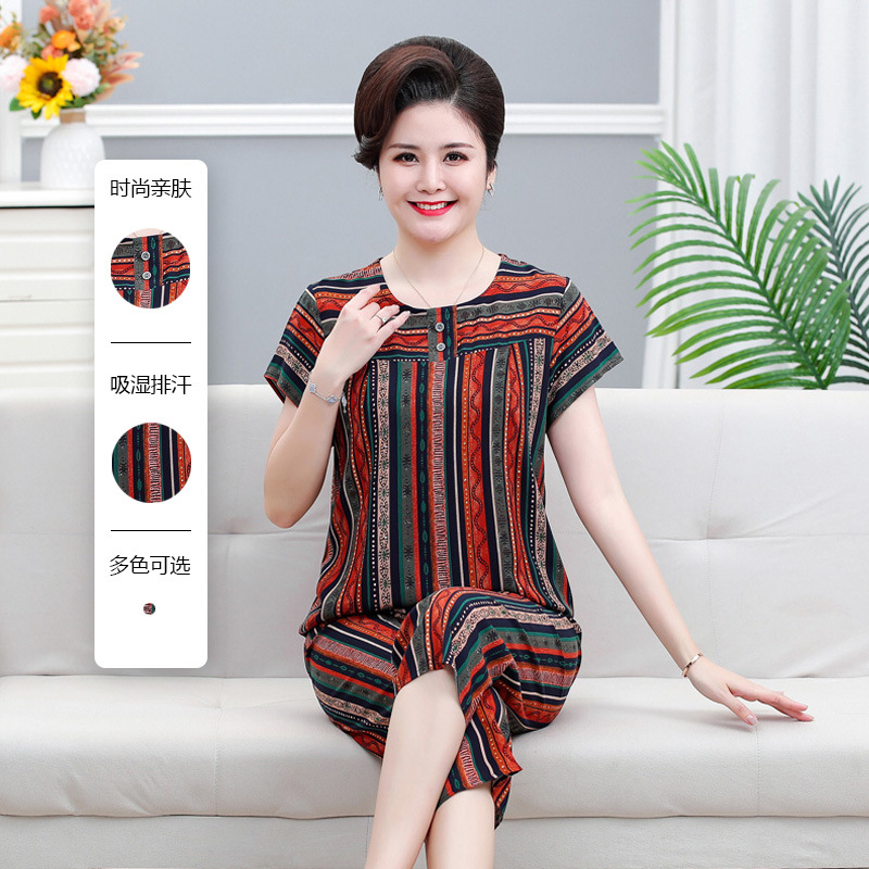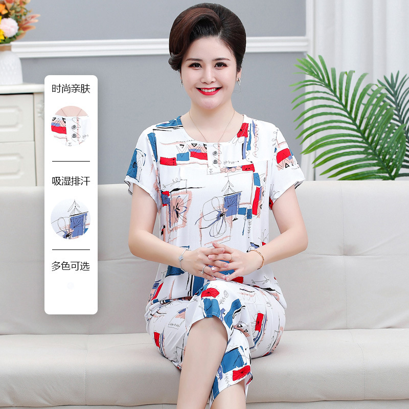 면 실크 잠옷 세트 카프리 바지 여름 통기성 얇은 중년 및 노인 어머니 여성용 반팔 가정 의류
