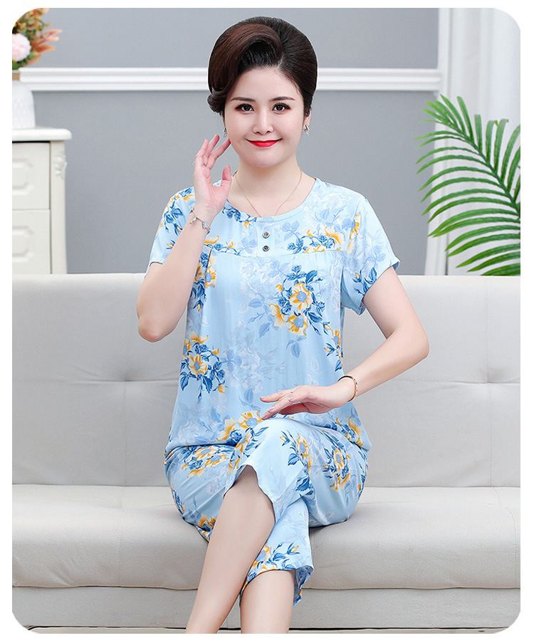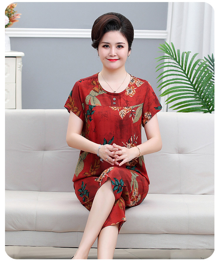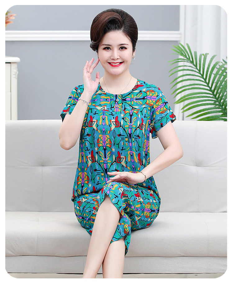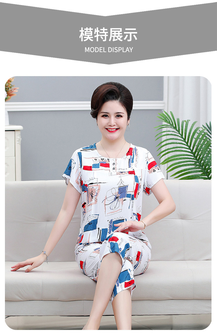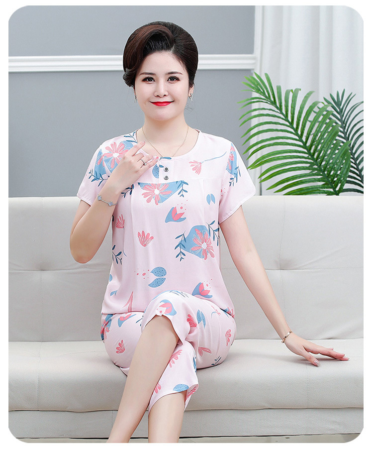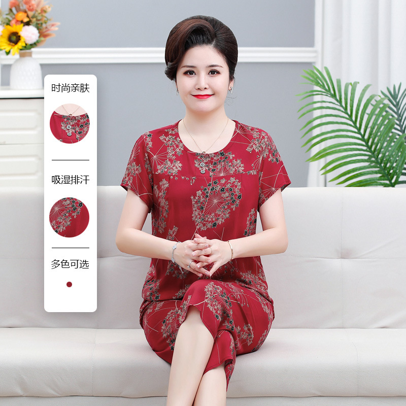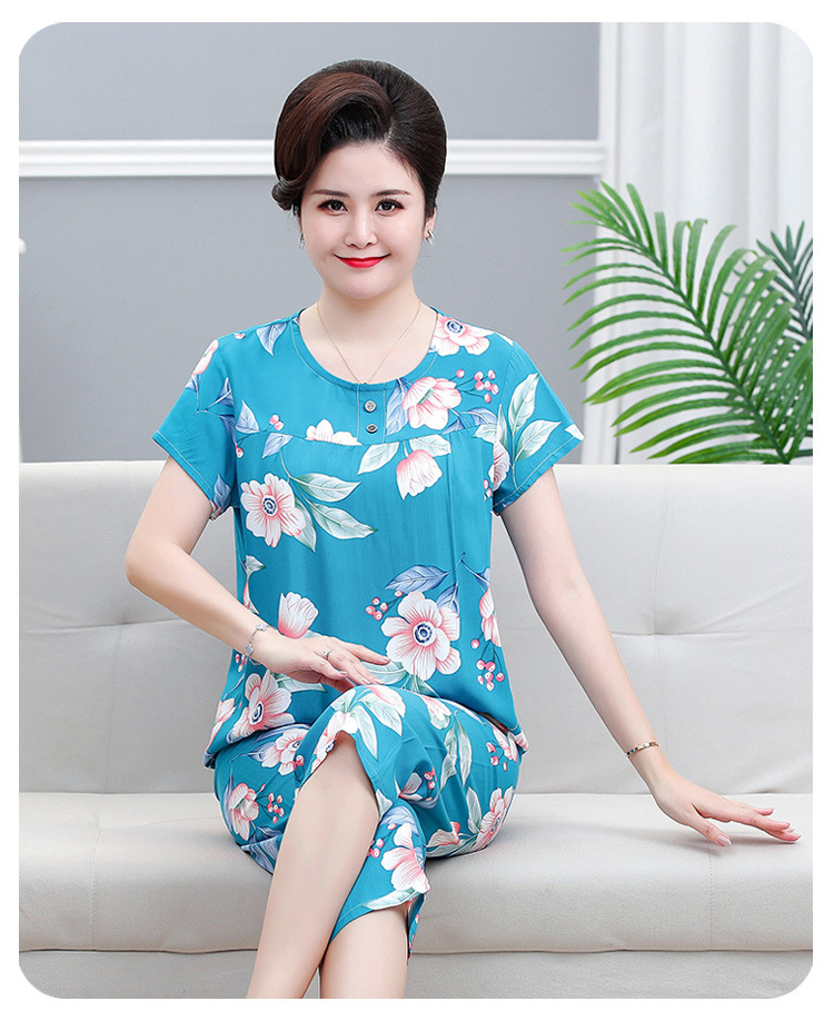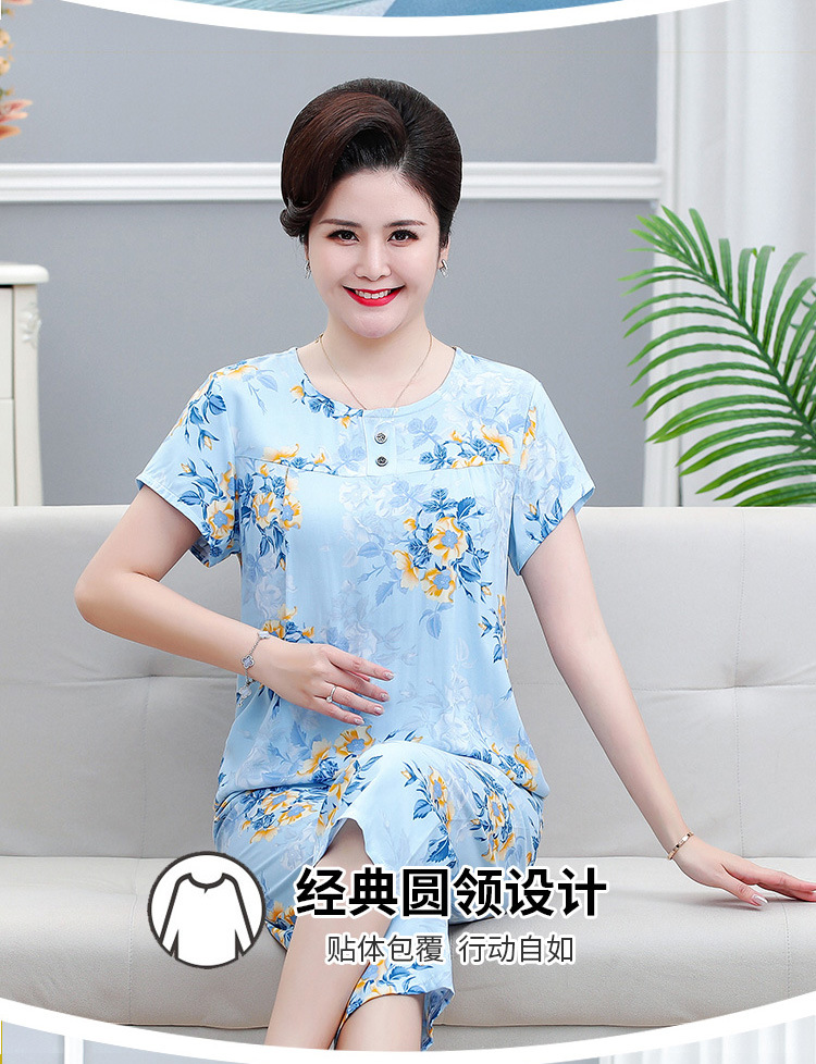 면 실크 잠옷 세트 카프리 바지 여름 통기성 얇은 중년 및 노인 어머니 여성용 반팔 가정 의류