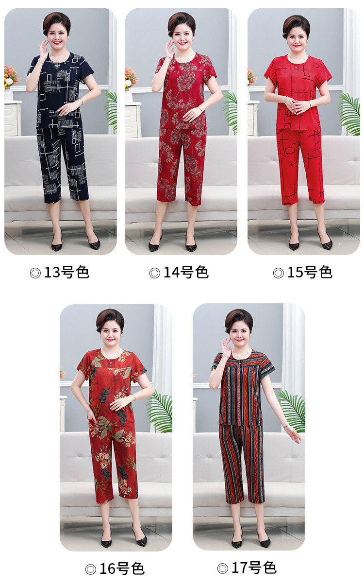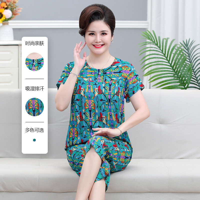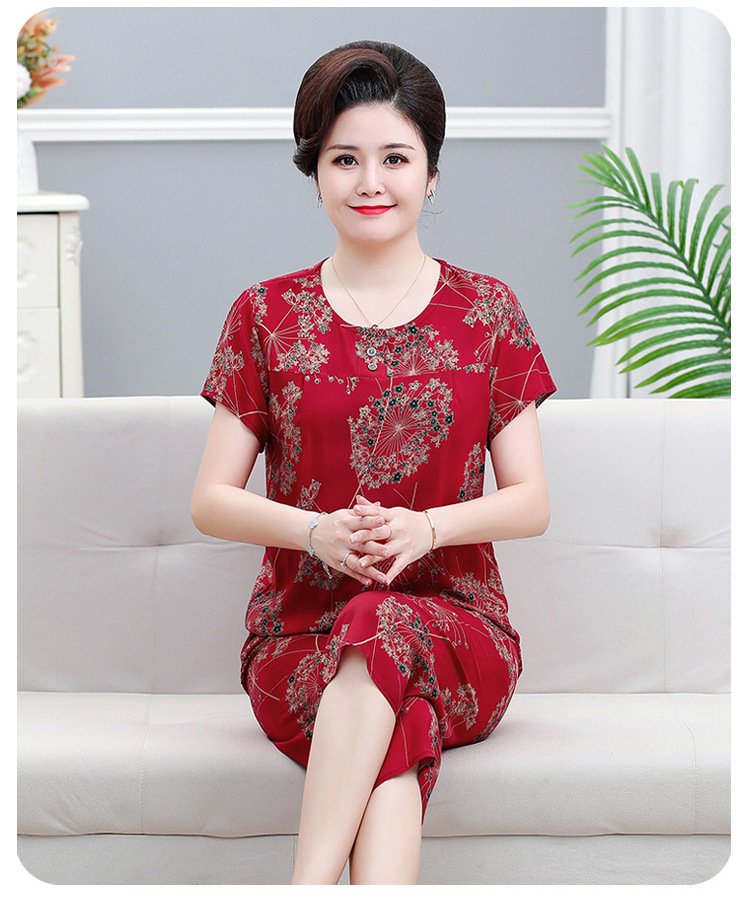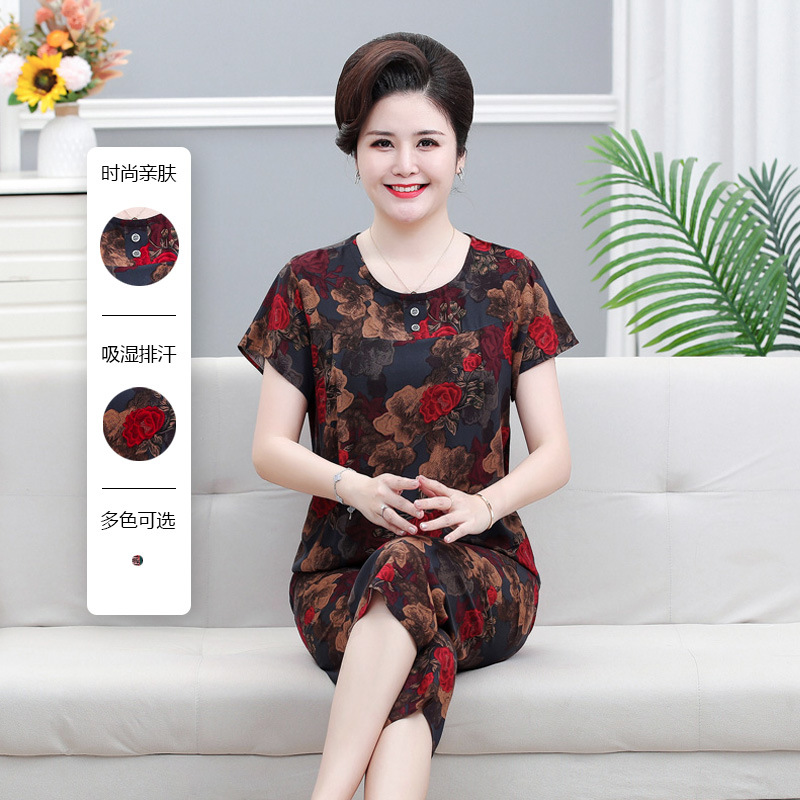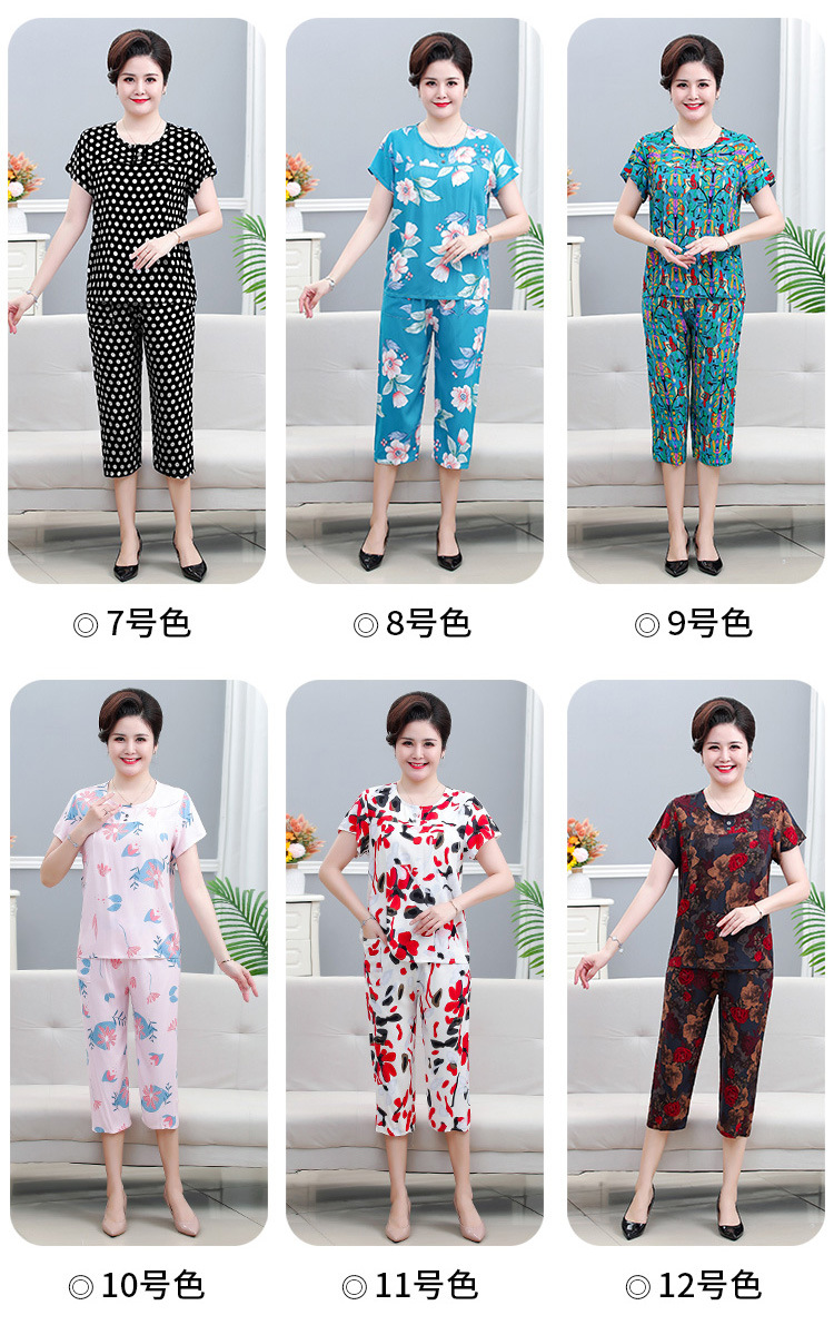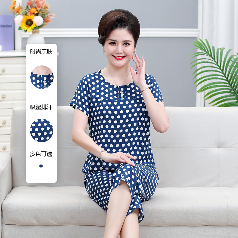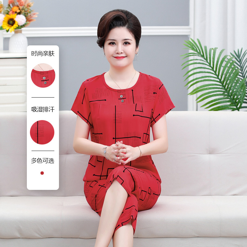 면 실크 잠옷 세트 카프리 바지 여름 통기성 얇은 중년 및 노인 어머니 여성용 반팔 가정 의류