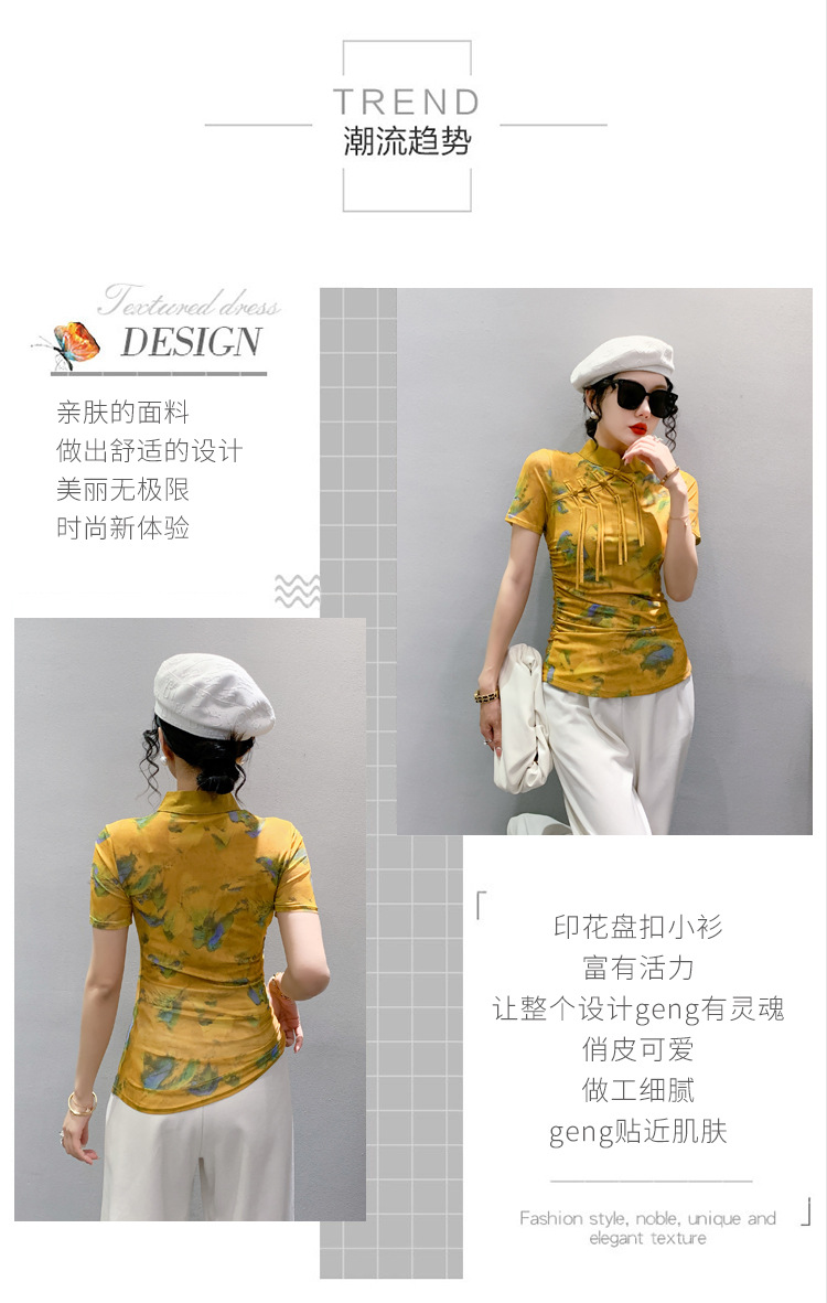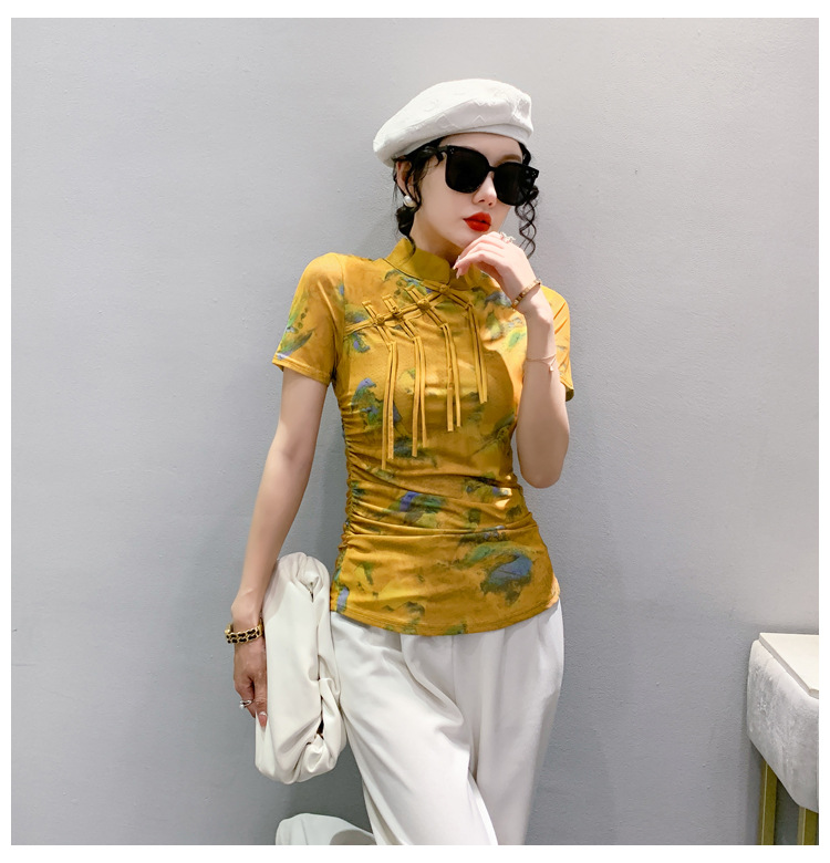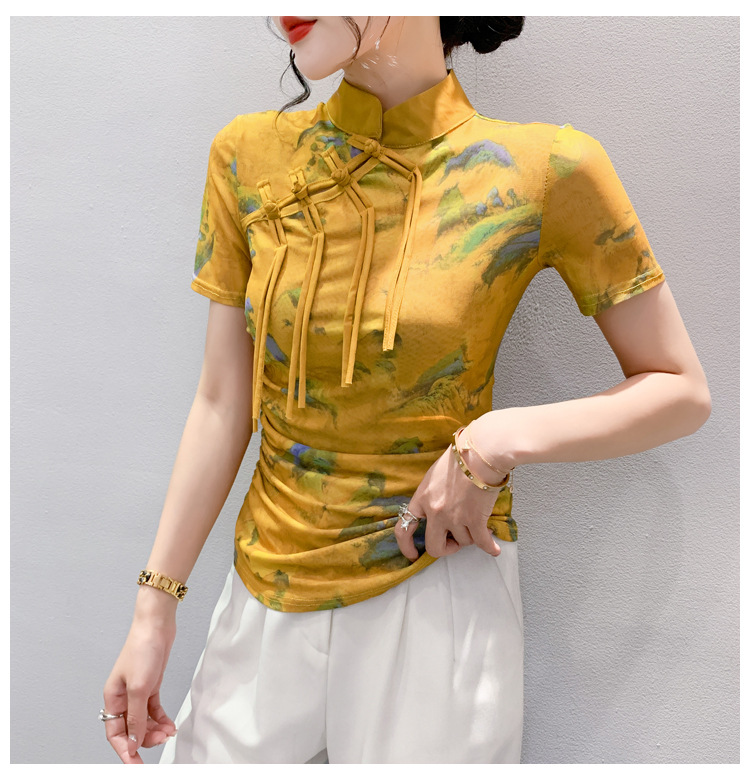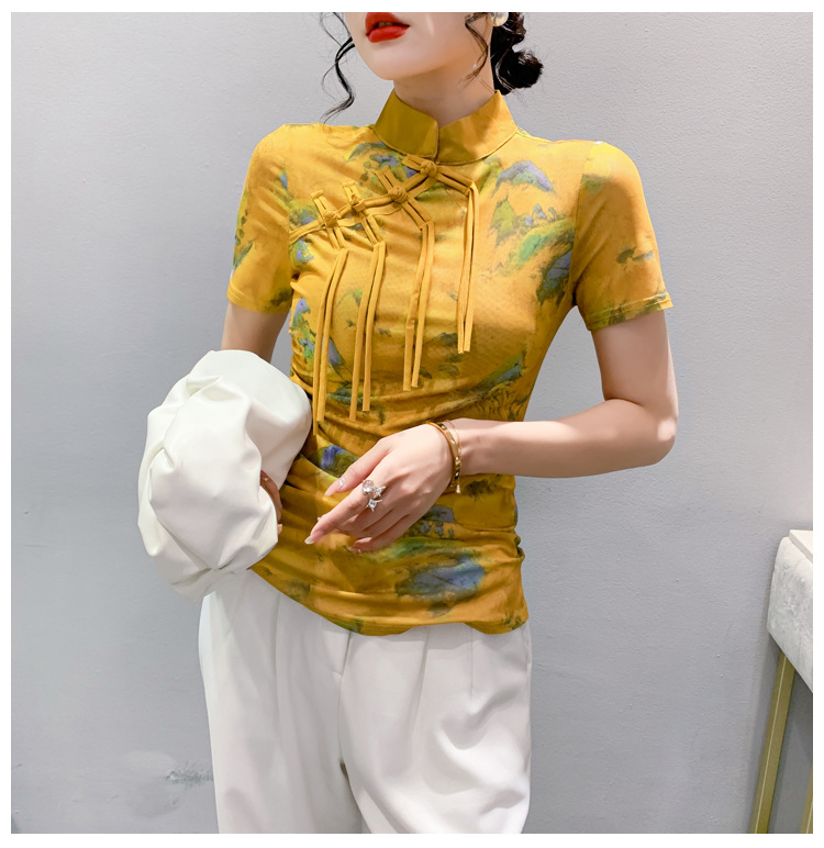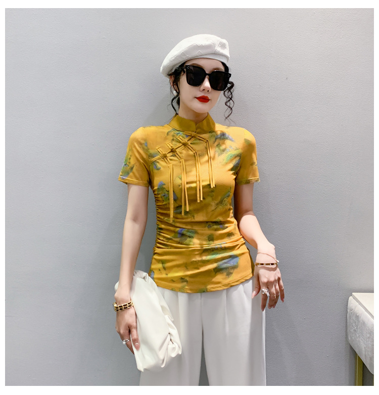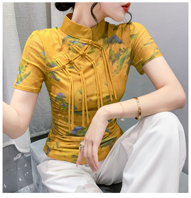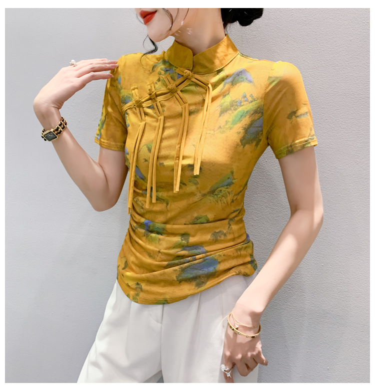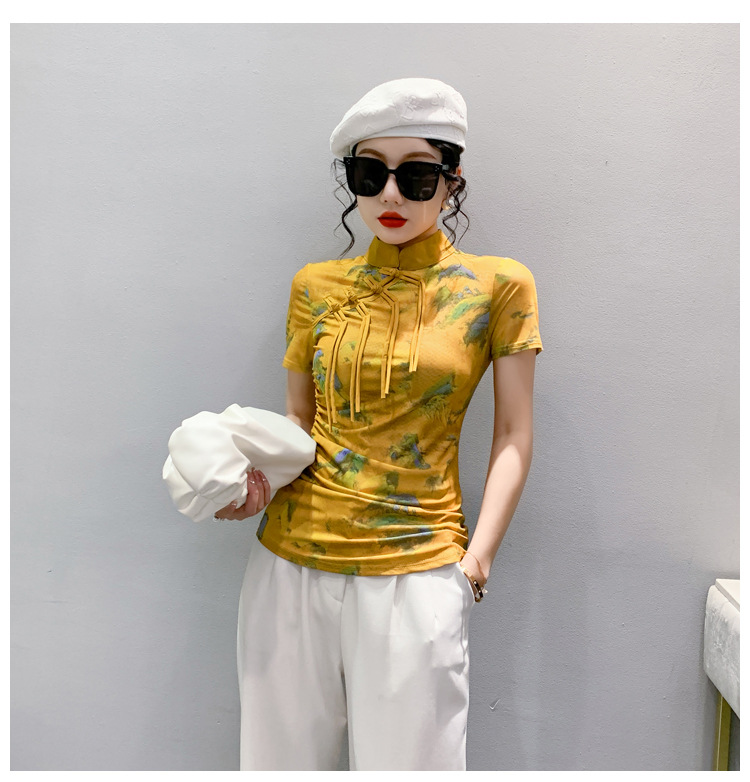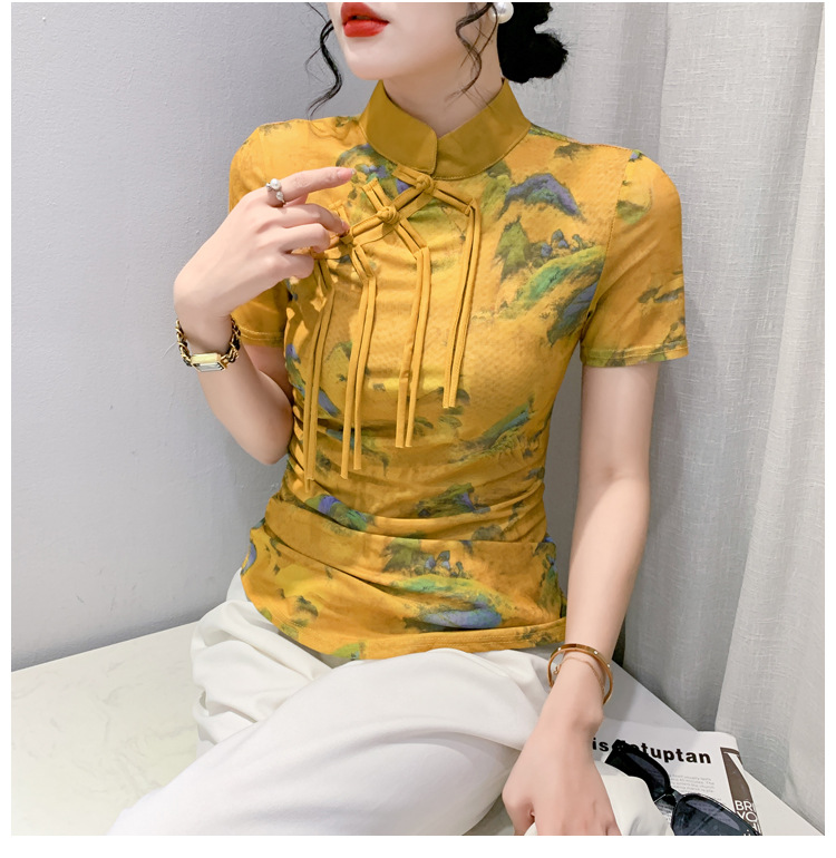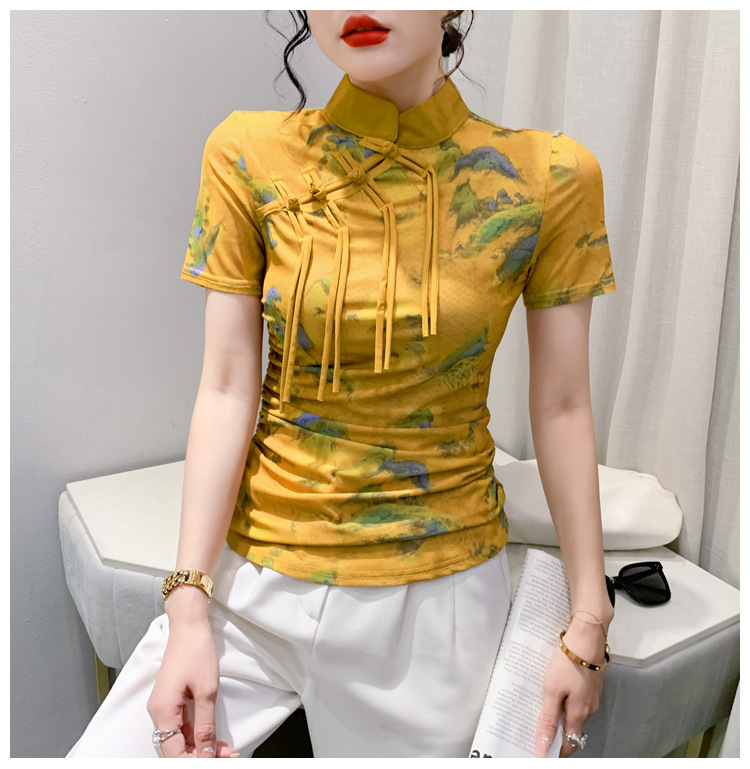 디자인 센스 중국 스타일 내셔널 패션 버튼 세로 칼라 반팔 프린트 티셔츠 여성베이스 셔츠 2023 봄과 여름 탑 패션스토어 가기