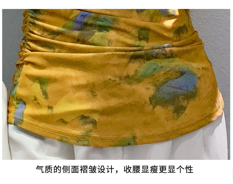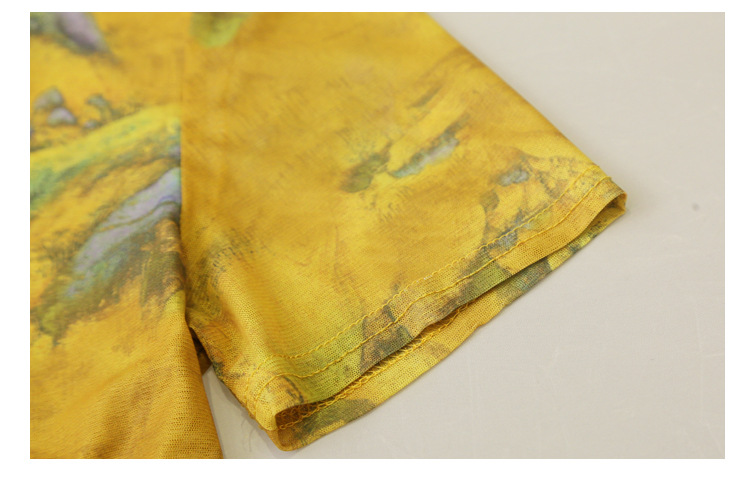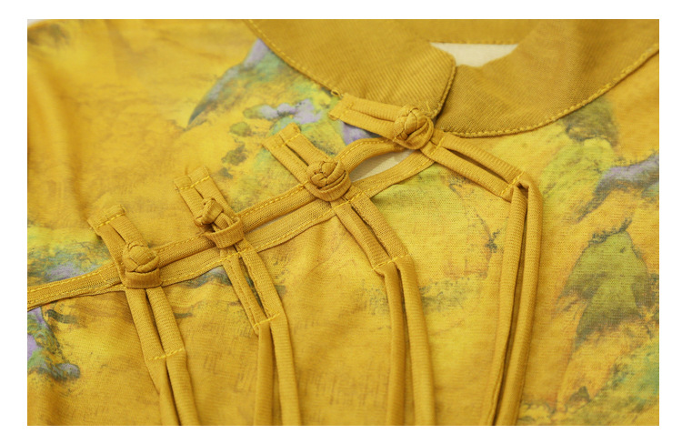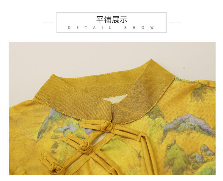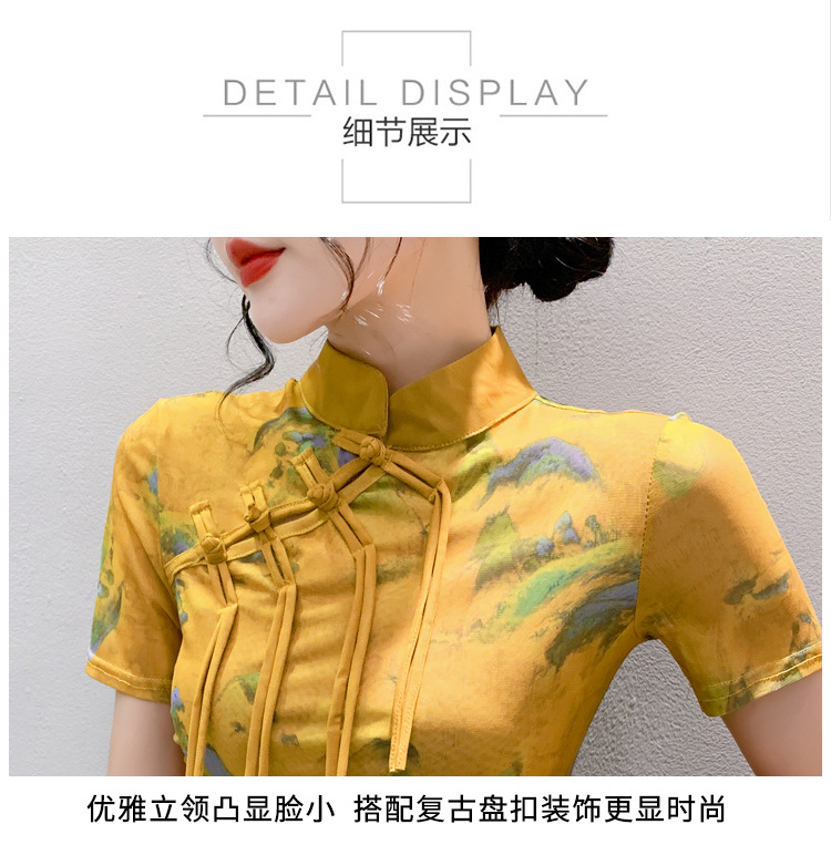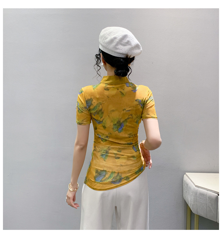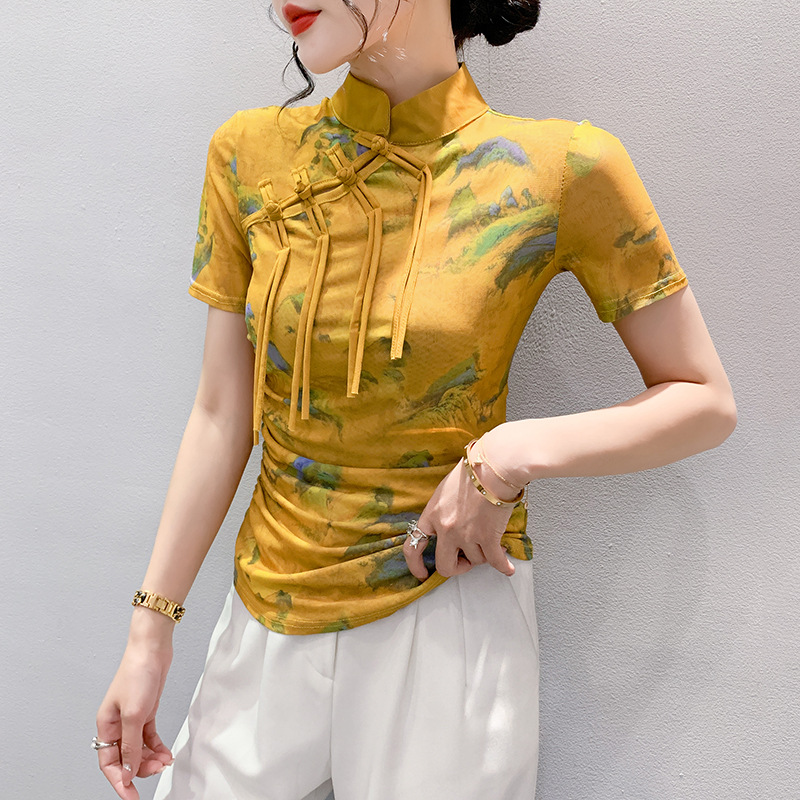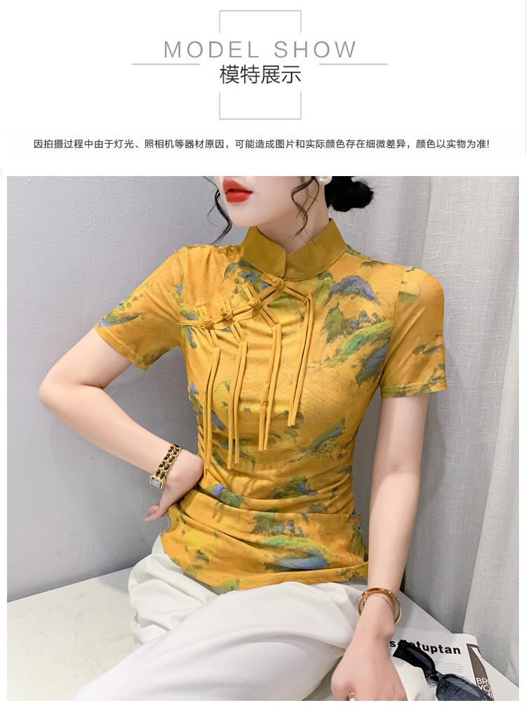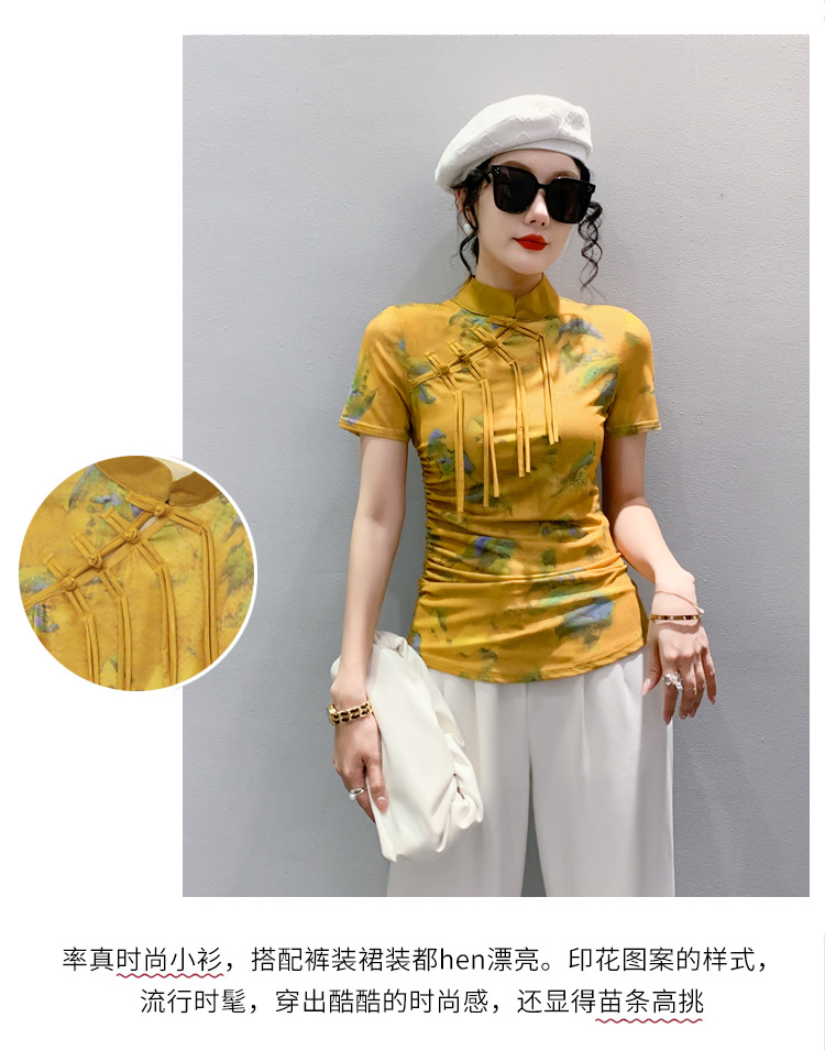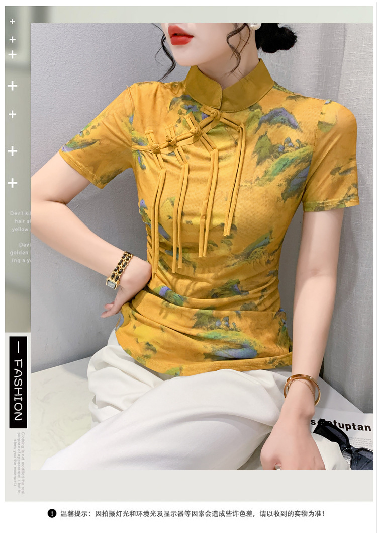디자인 센스 중국 스타일 내셔널 패션 버튼 세로 칼라 반팔 프린트 티셔츠 여성베이스 셔츠 2023 봄과 여름 탑 패션스토어 가기