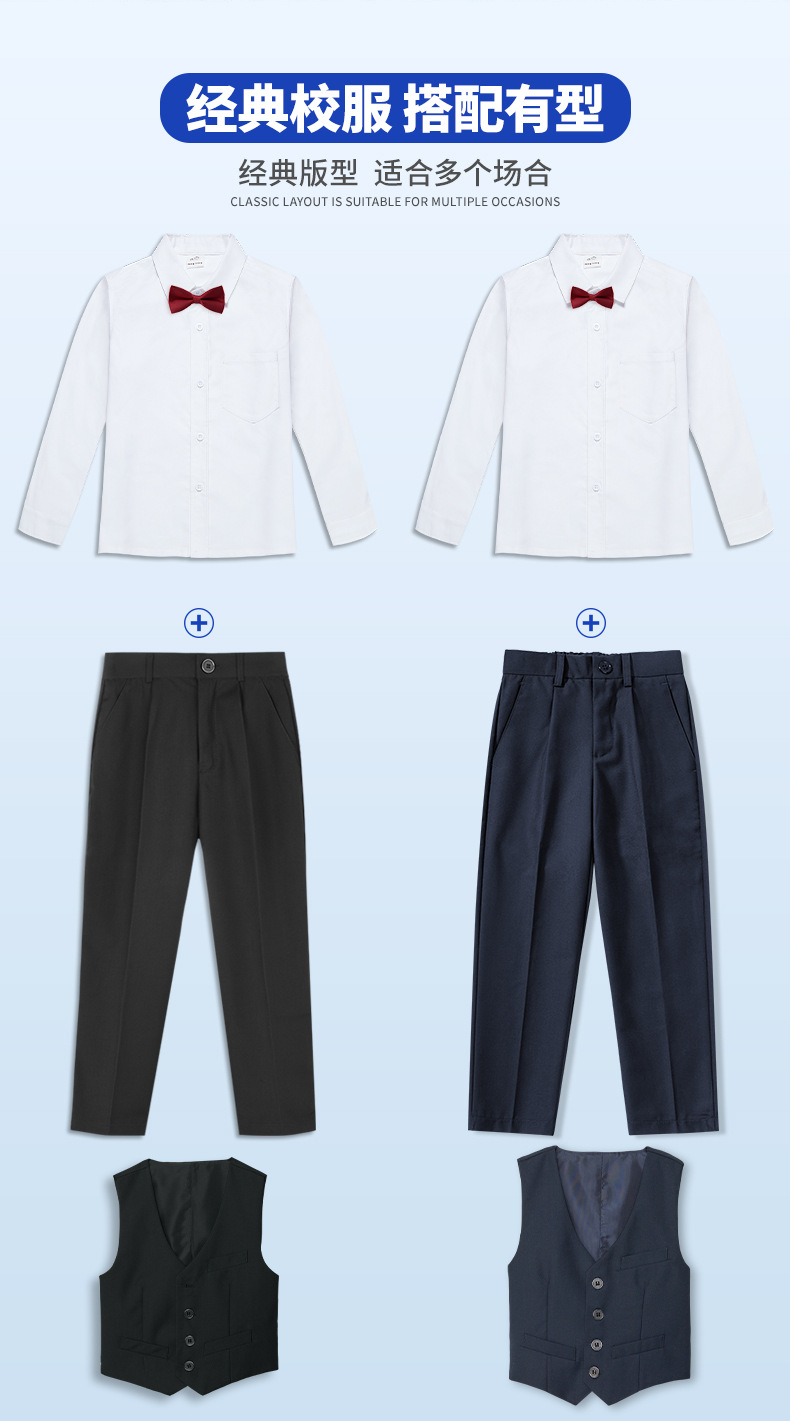 • 네이비 조끼 + 긴 소매 + 네이비 바지 + 나비 넥타이