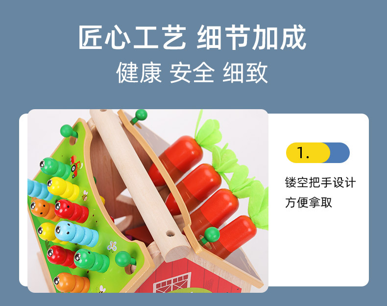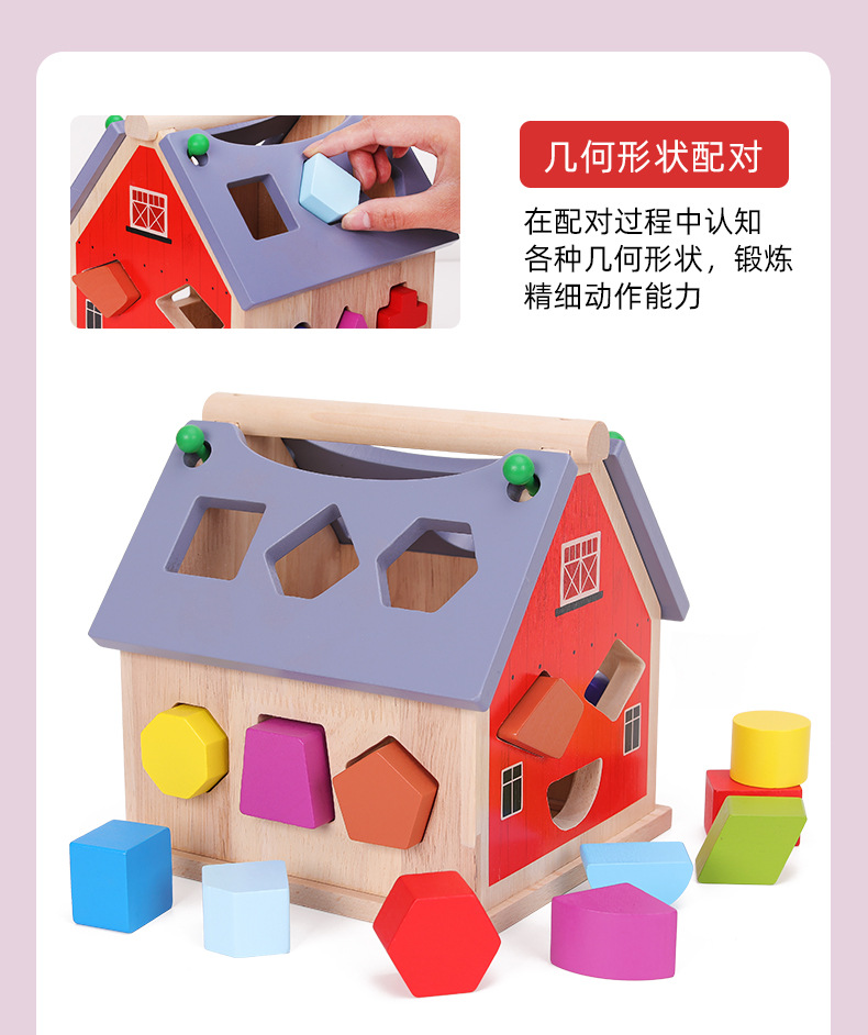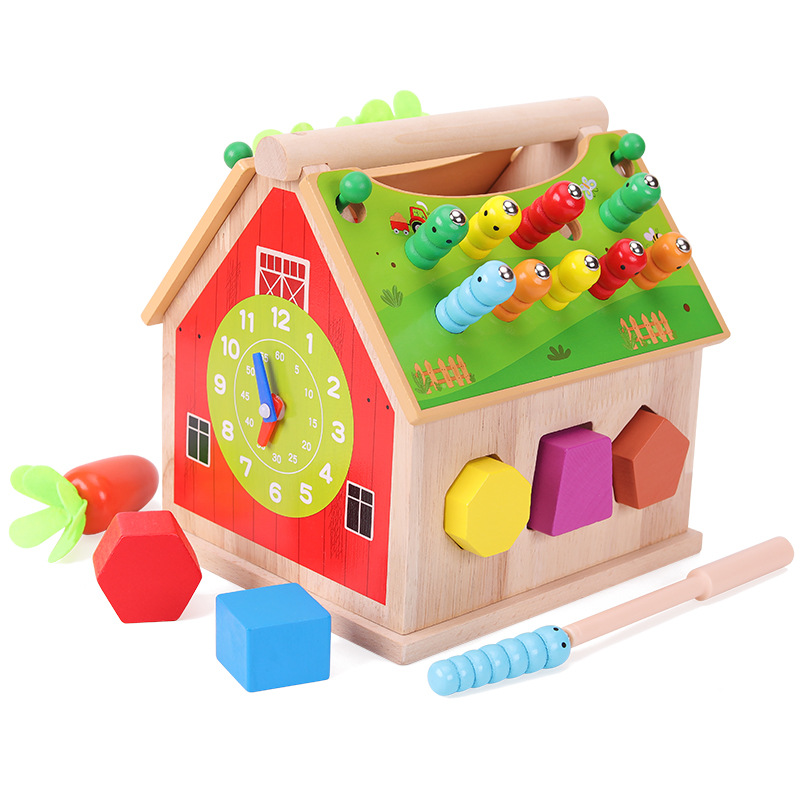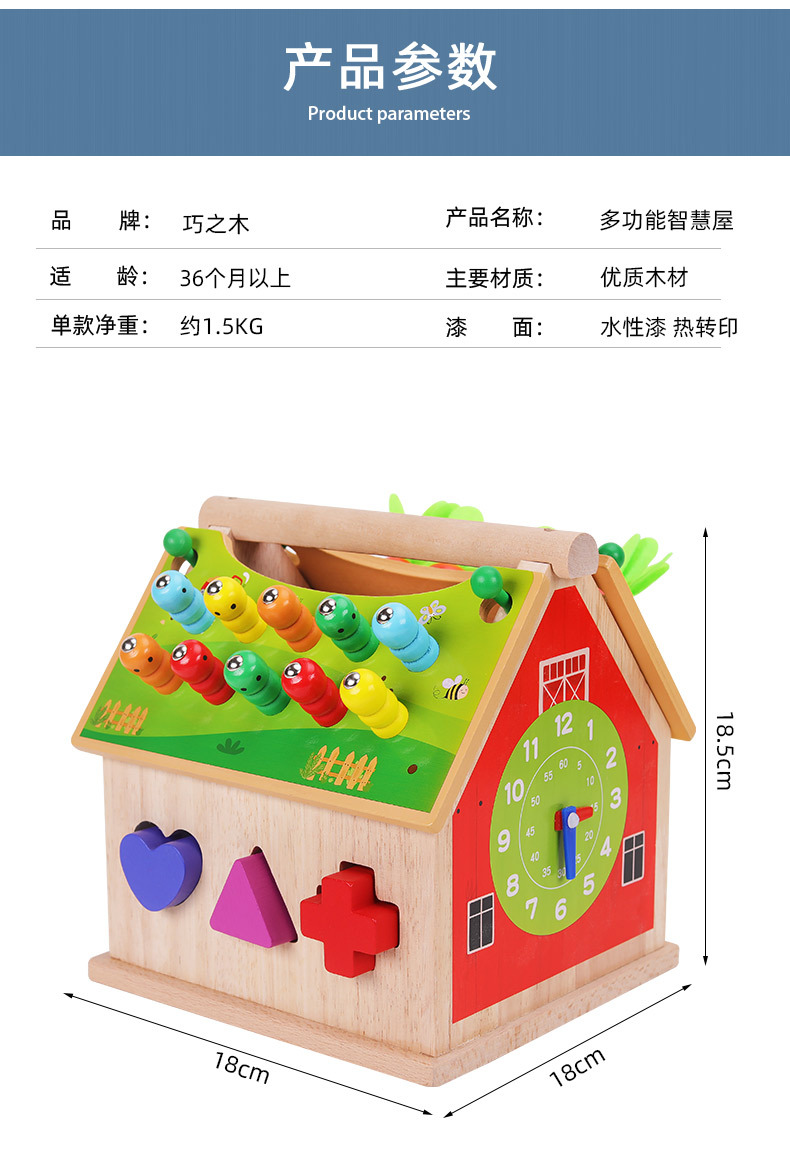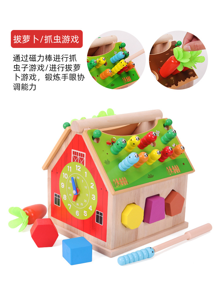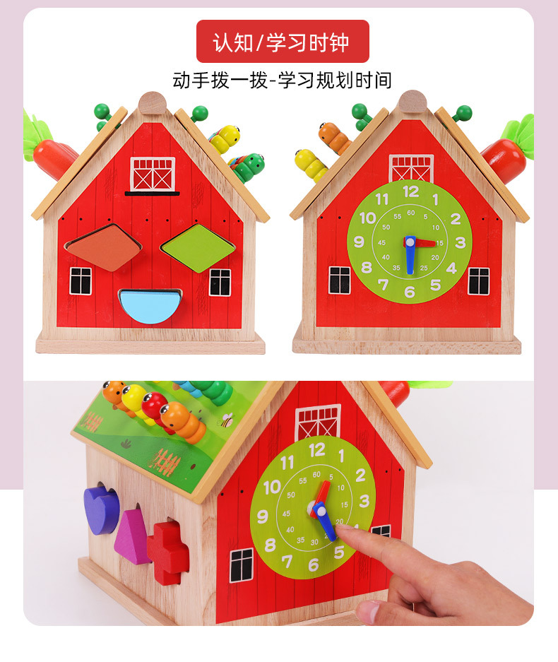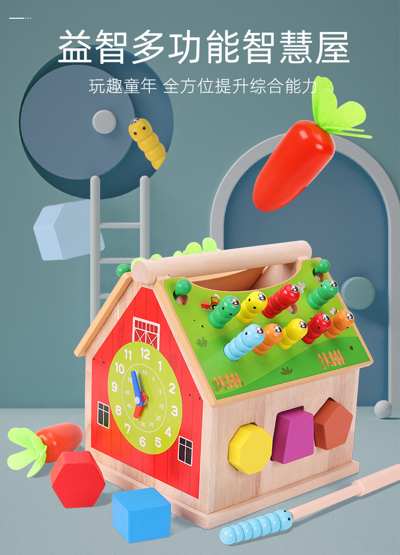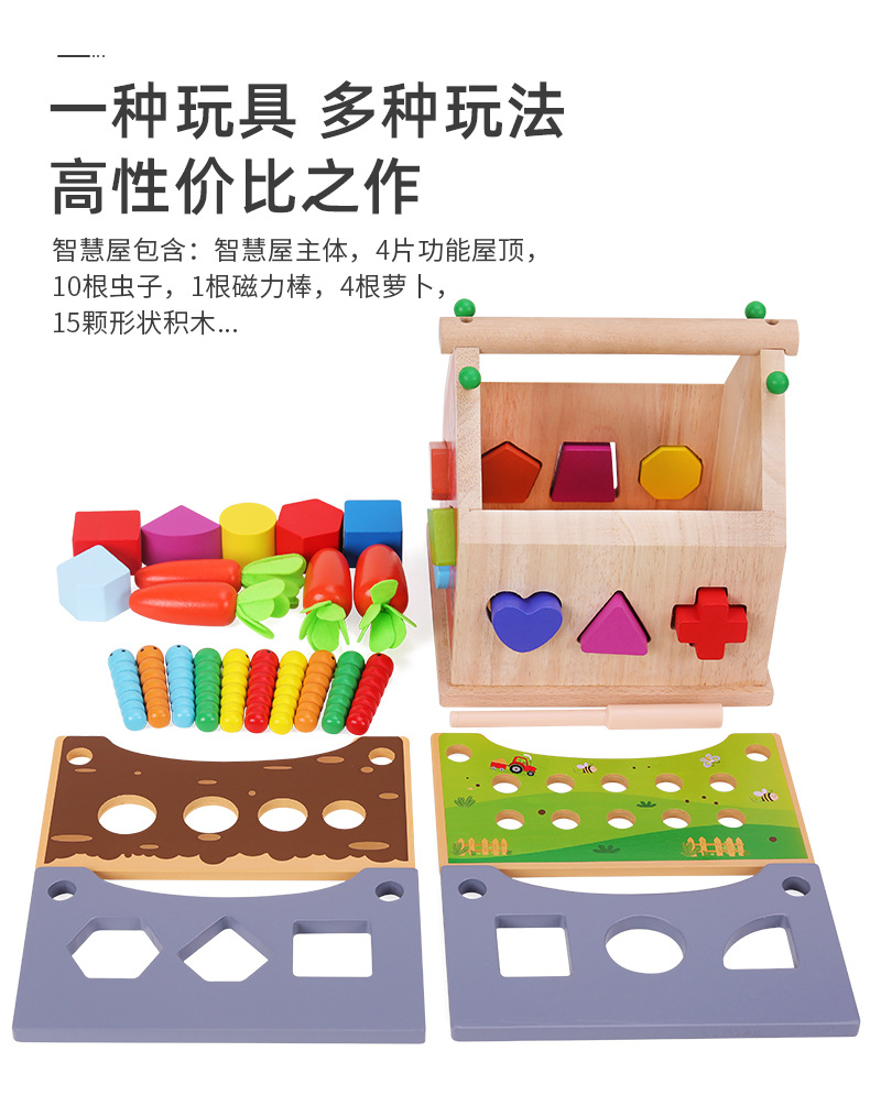 多功能智慧屋:15颗形状配对积木+4颗萝卜+10个磁性毛毛虫+一根吸铁棒。屋顶顶部手提设计,4片瓦盖,对应形状配对,种萝卜,钓毛毛虫,房子四面分别形状配对跟时间认知