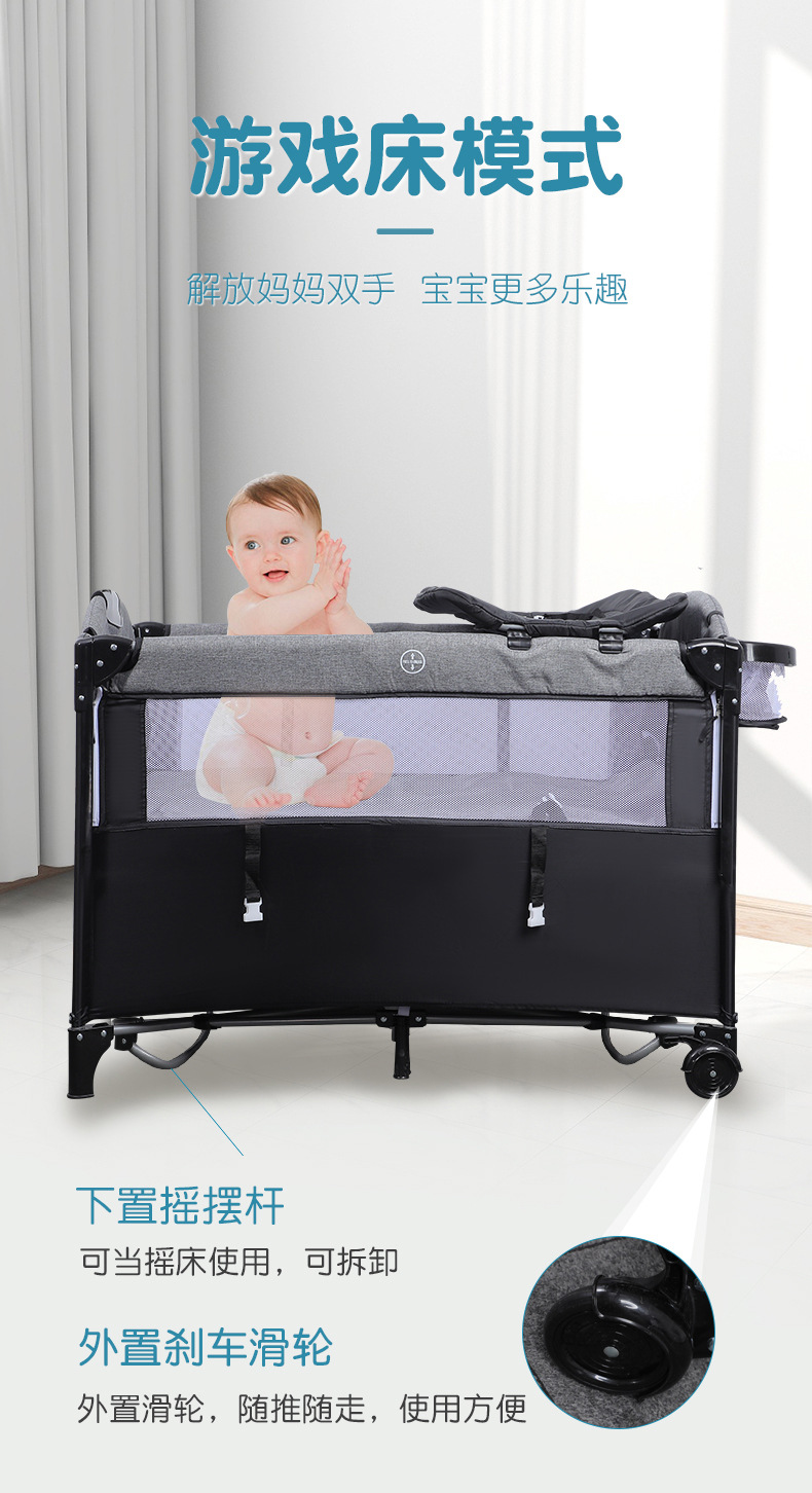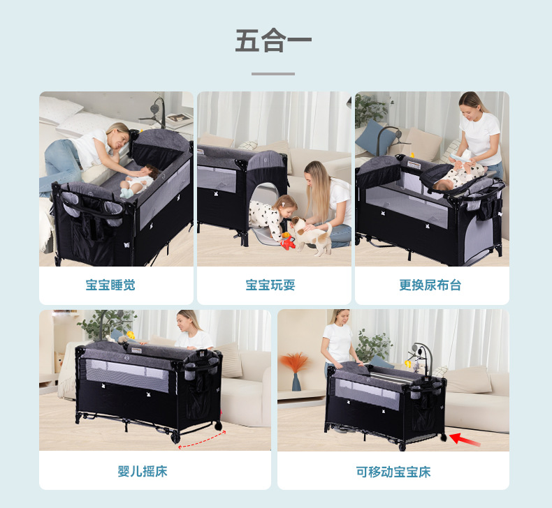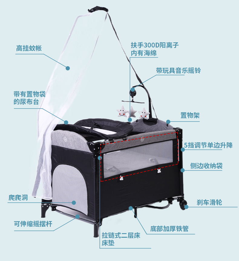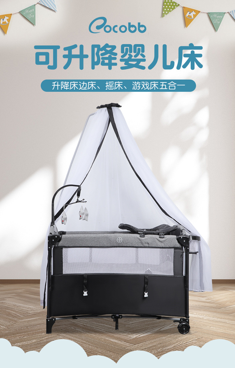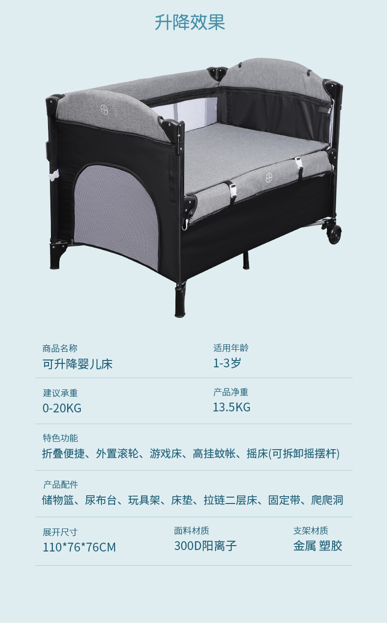 功能:可拼接大床,床边可五档升降,可移动,一键折叠,可收缩摇摆杆,游戏床、升降床边床、摇篮床三合一,360蚊帐包裹,收纳架,换洗尿布台
