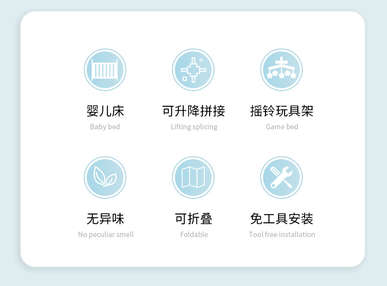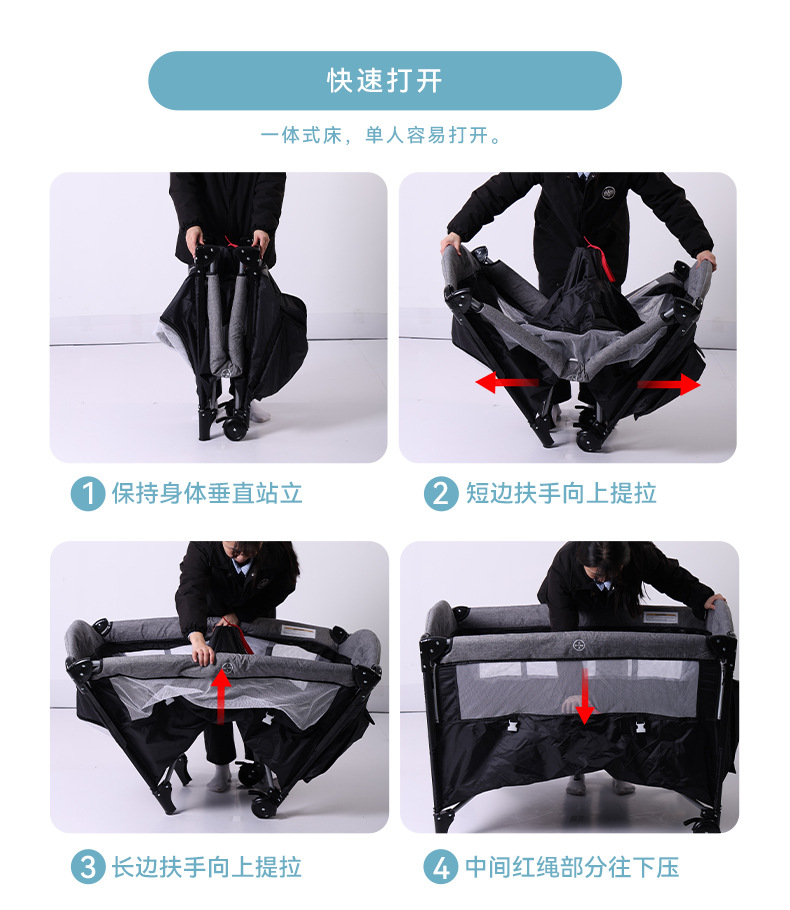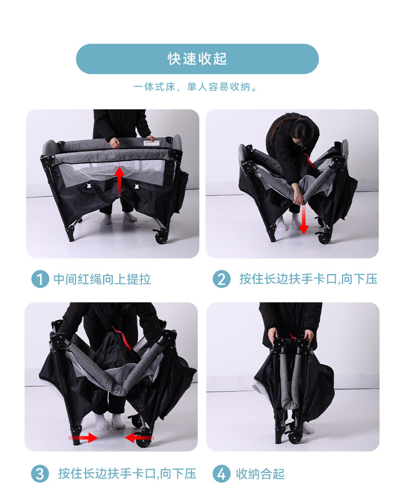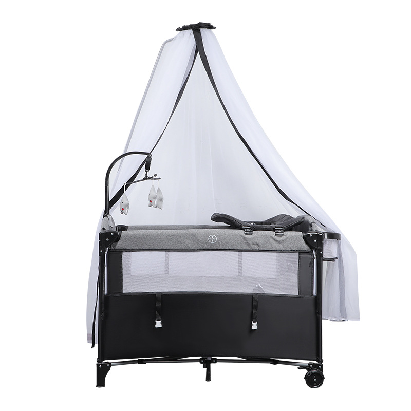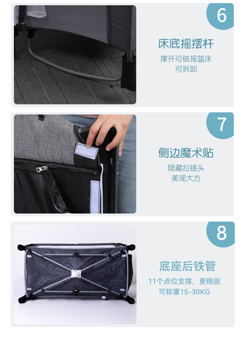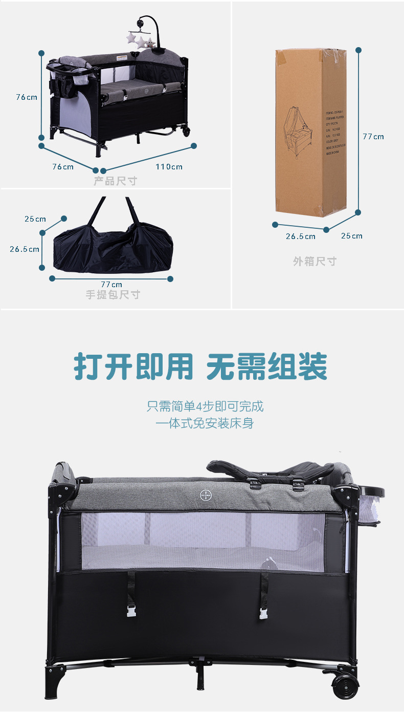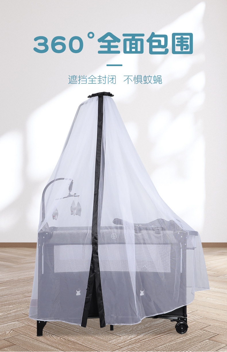 功能:可拼接大床,床边可五档升降,可移动,一键折叠,可收缩摇摆杆,游戏床、升降床边床、摇篮床三合一,360蚊帐包裹,收纳架,换洗尿布台