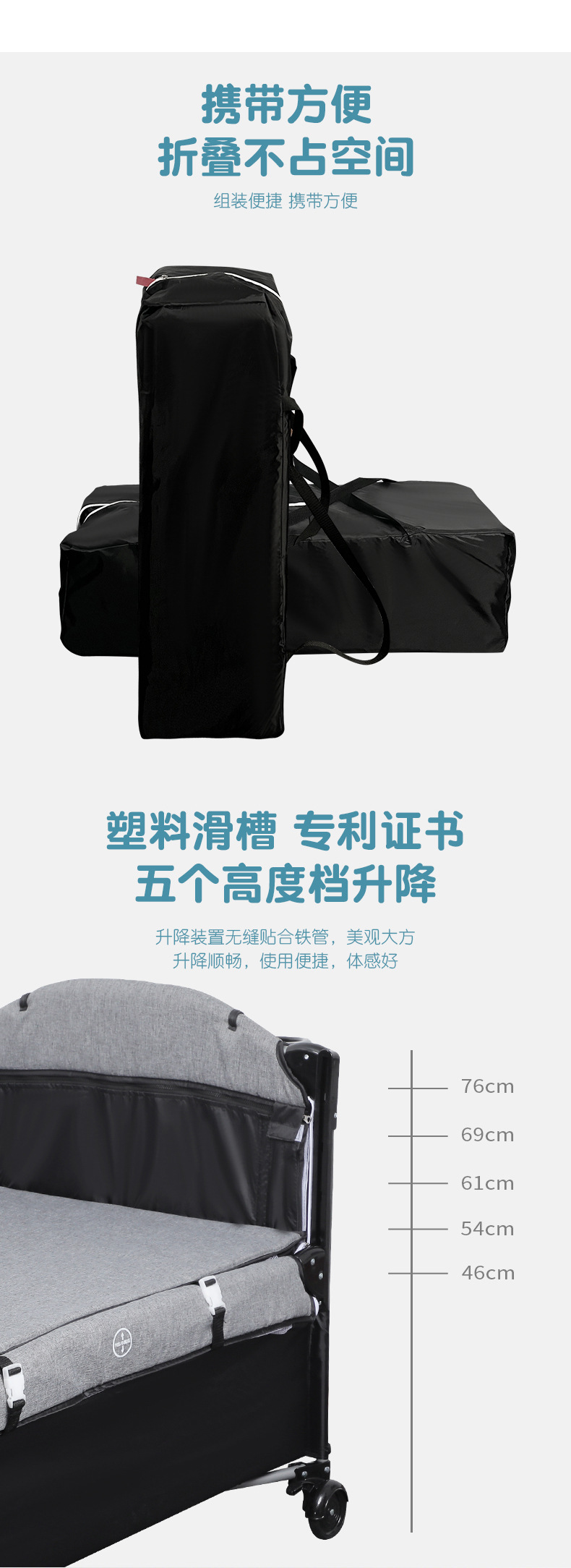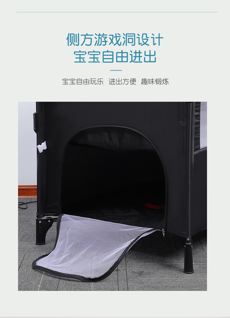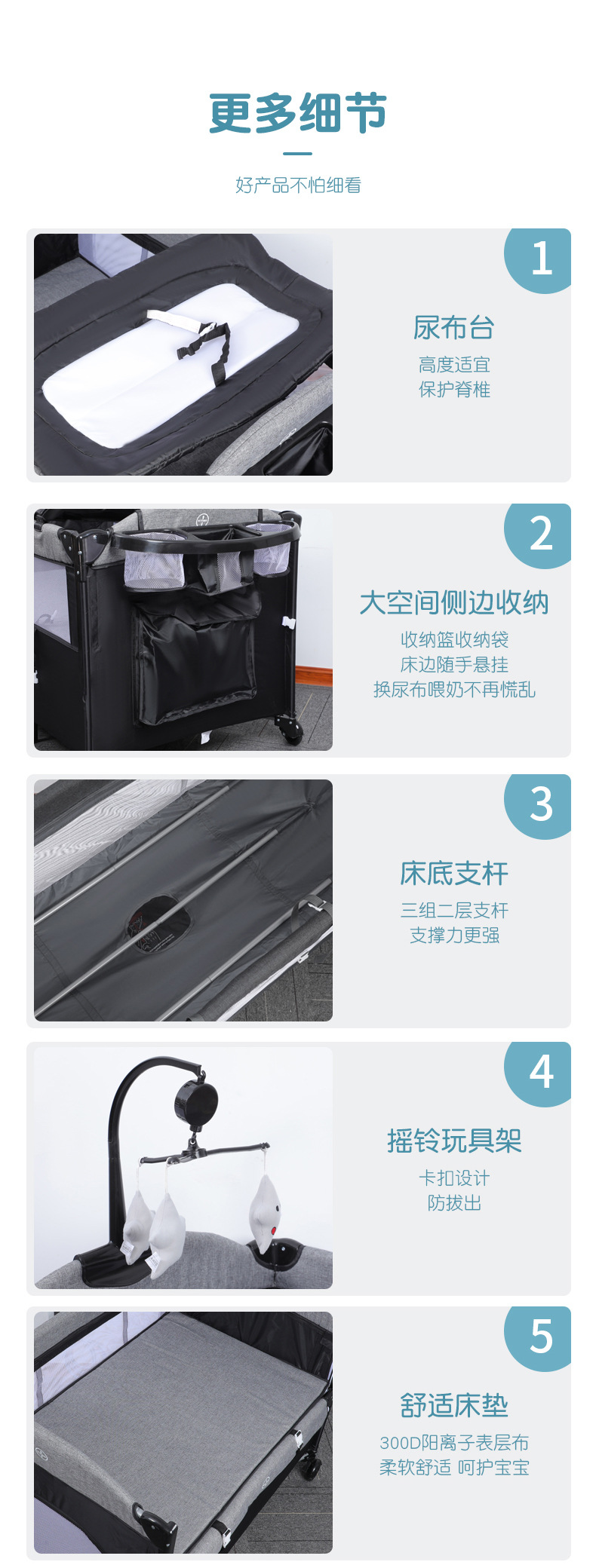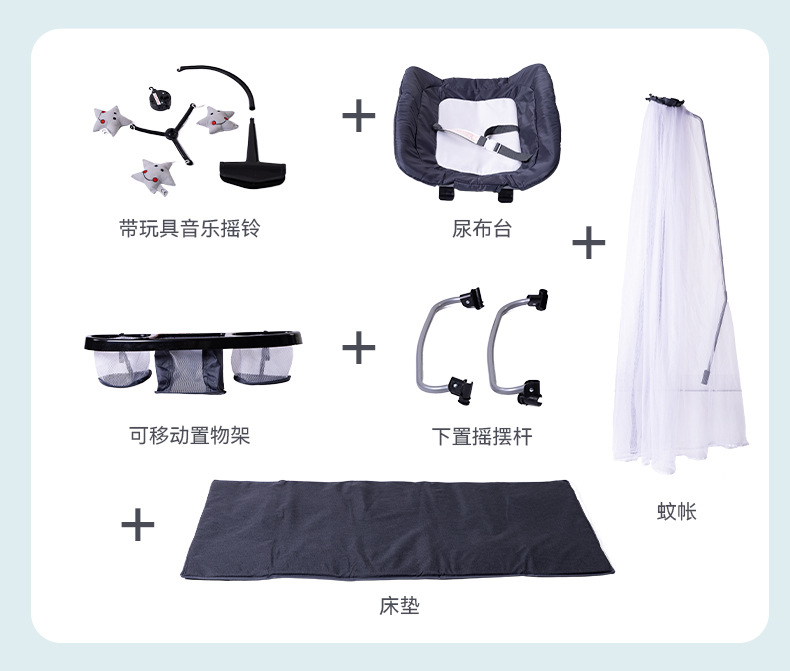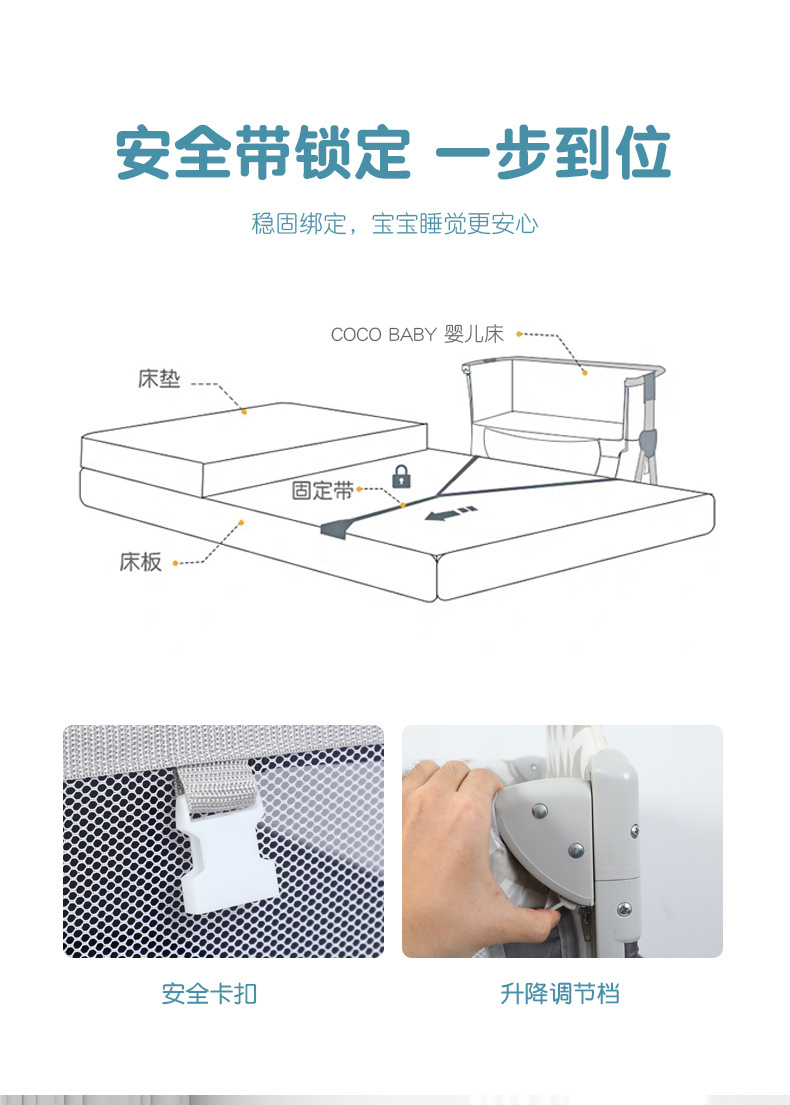 功能:可拼接大床,床边可五档升降,可移动,一键折叠,可收缩摇摆杆,游戏床、升降床边床、摇篮床三合一,360蚊帐包裹,收纳架,换洗尿布台