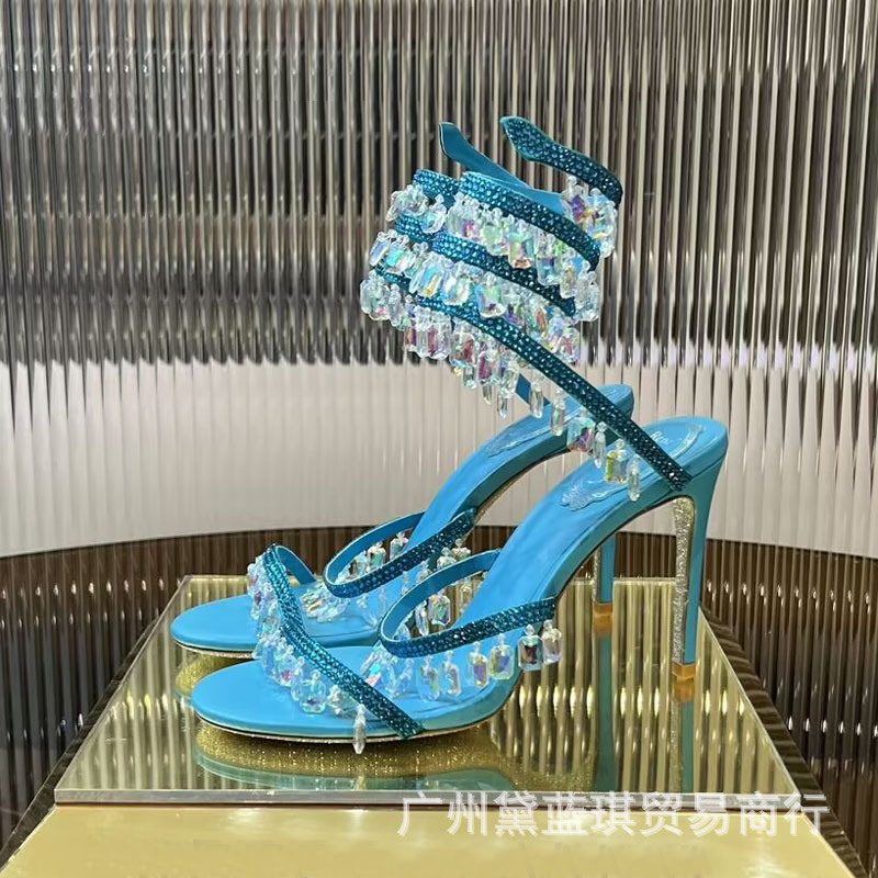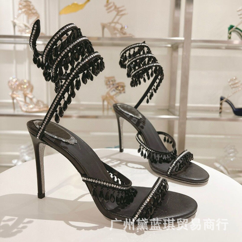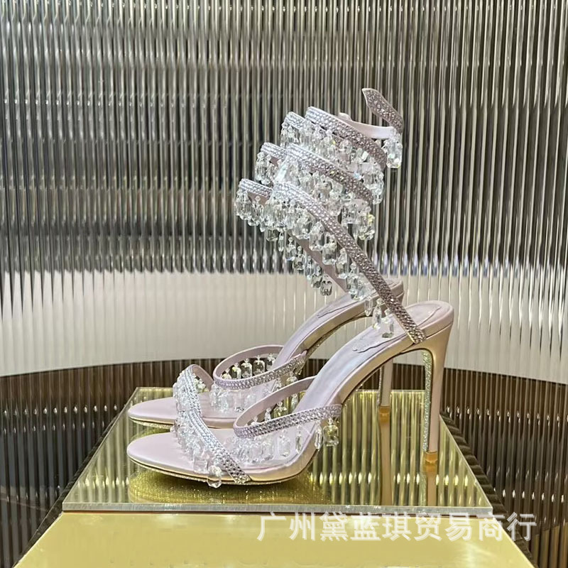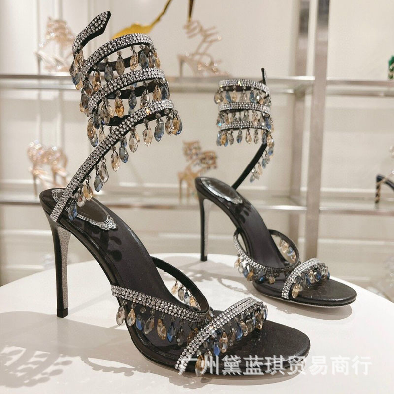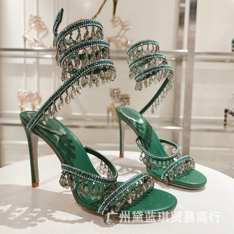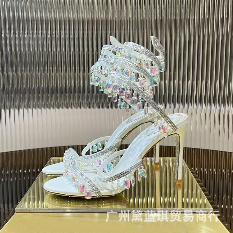 RC 실크 라인스톤 크리스탈 펜던트 뱀 랩 보헤미안 요정 하이힐 샌들 웨딩 슈즈 연회 에티켓