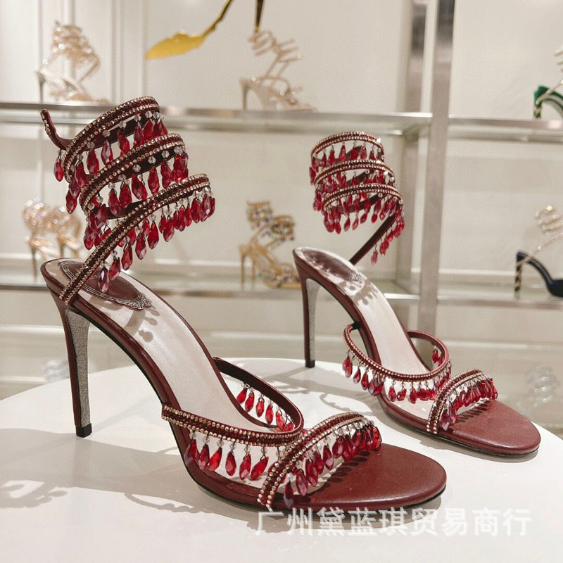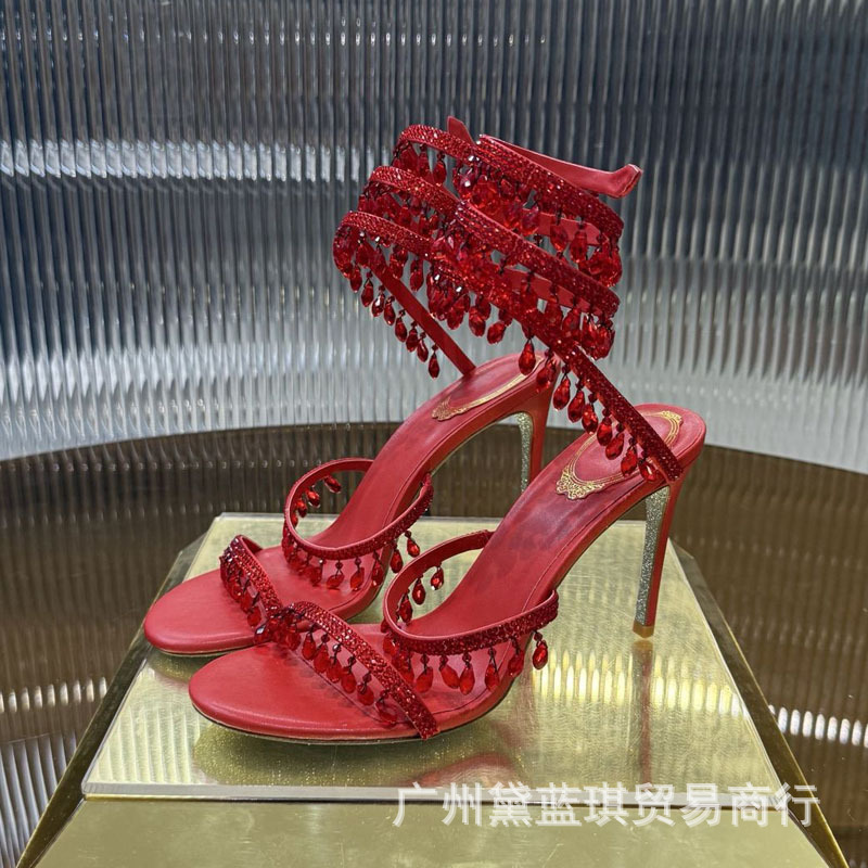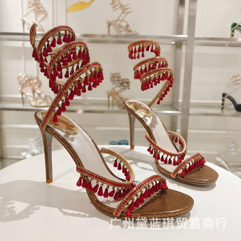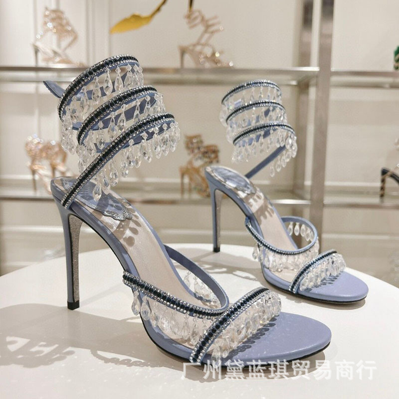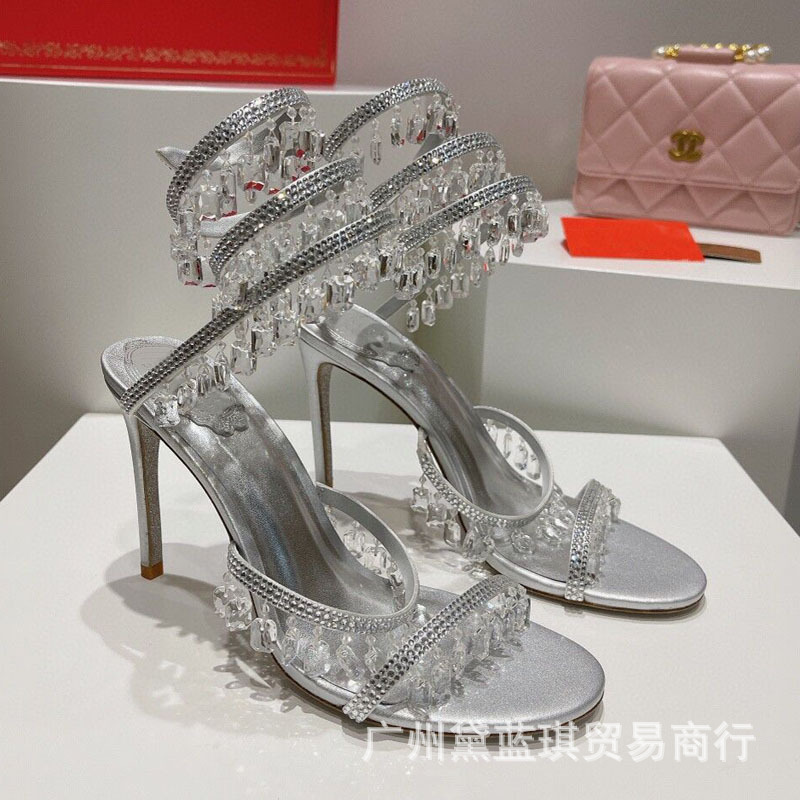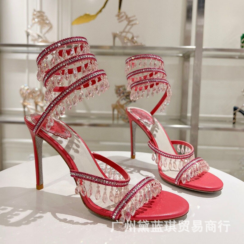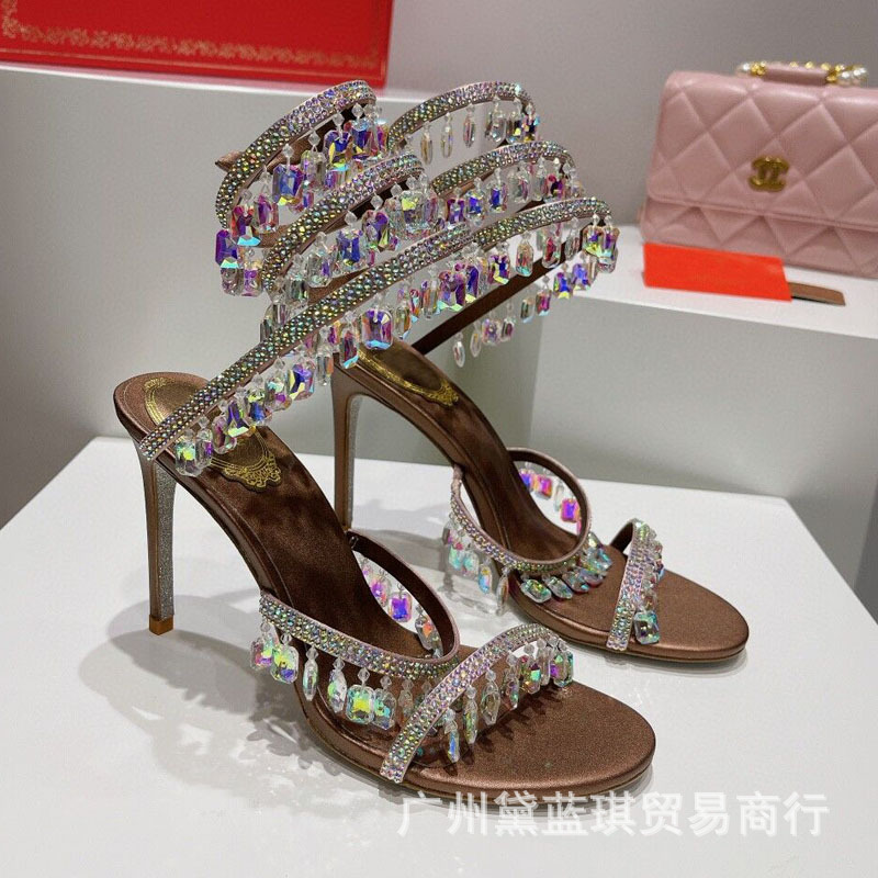 RC 실크 라인스톤 크리스탈 펜던트 뱀 랩 보헤미안 요정 하이힐 샌들 웨딩 슈즈 연회 에티켓