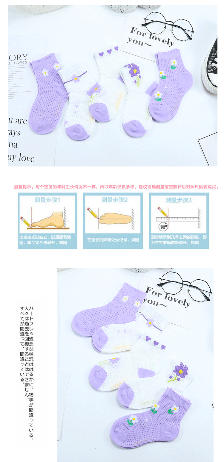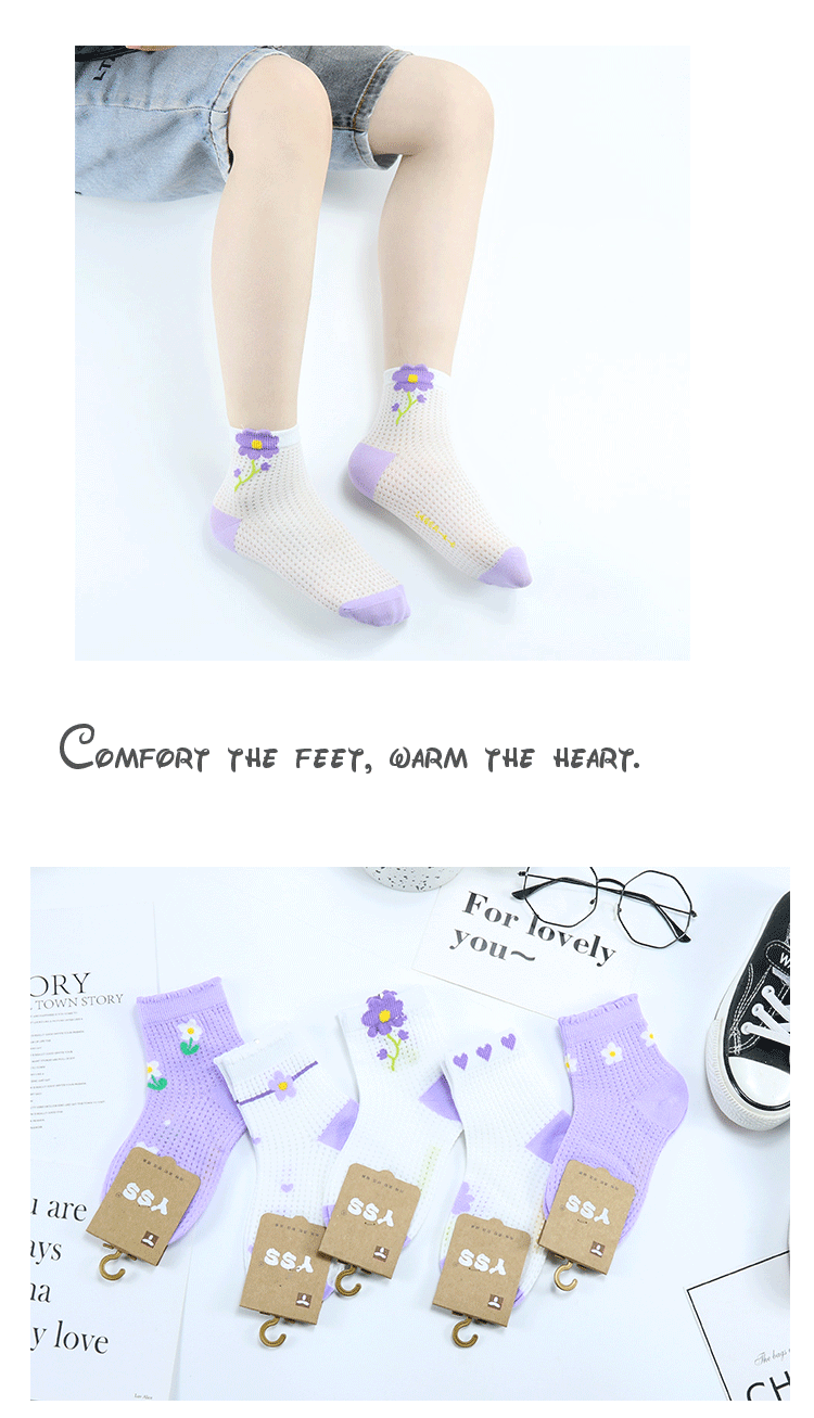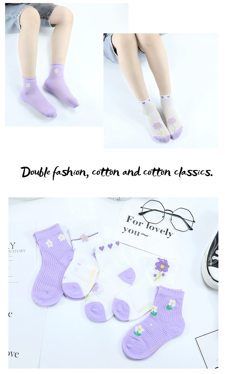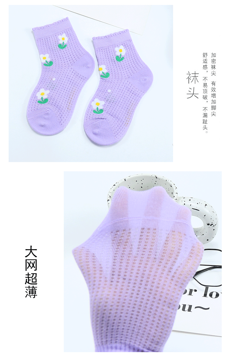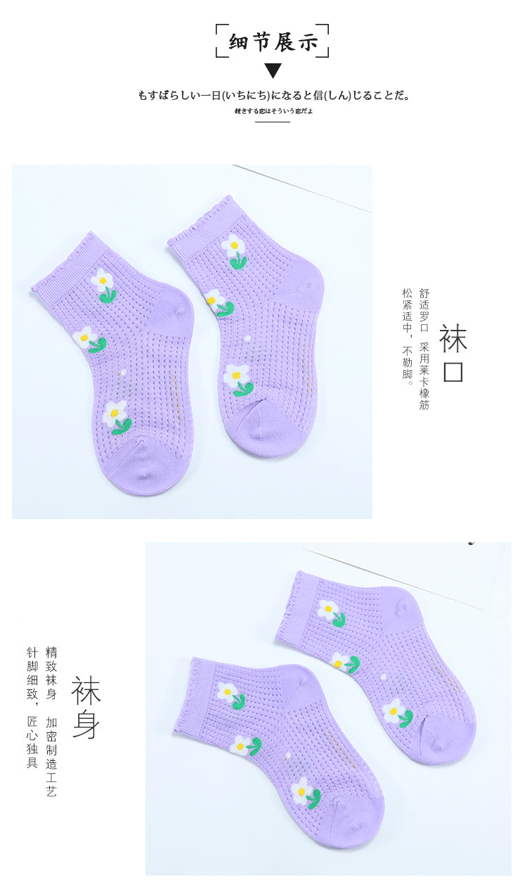 Yi Shuang 어린이 양말 여름 새로운 대형 그물 초박형 만화 작은 꽃 짧은 양말 빗질 된 면 소녀 한국 스타일 면 양말
