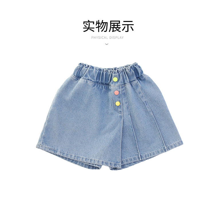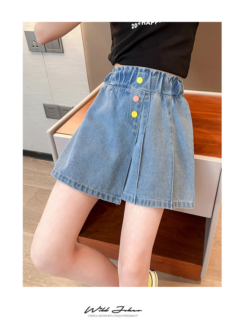 2023 여름 소녀 새로운 색상 버클 데님 치마 바지 큰 어린이 한국 높은 허리 슬림 반바지 엔티티 도매