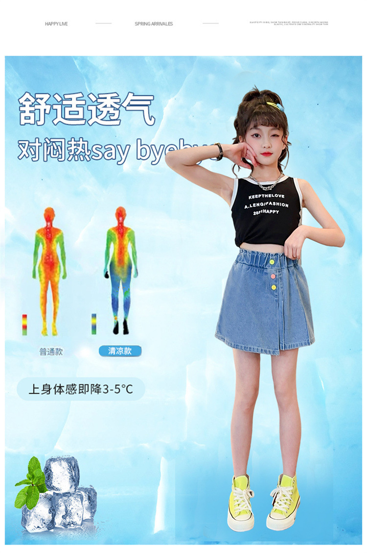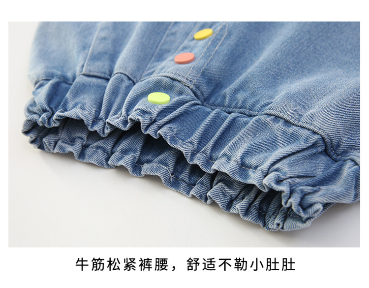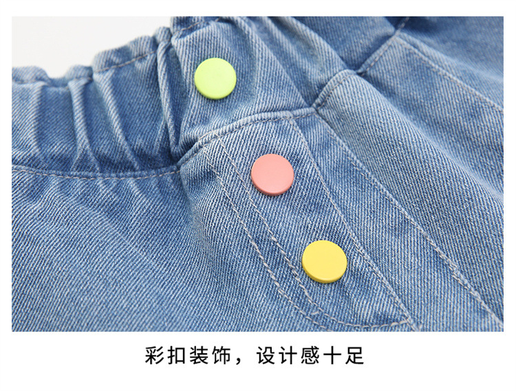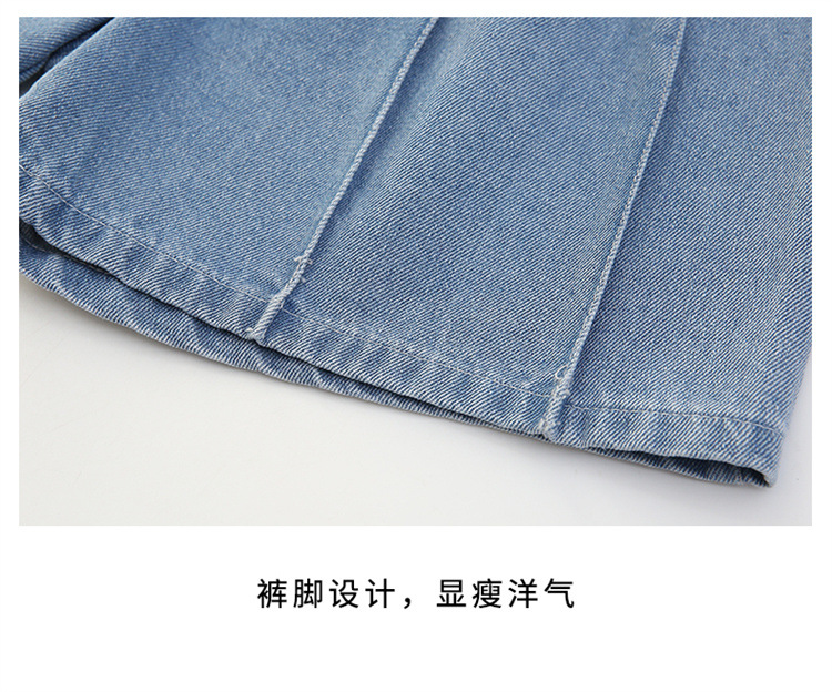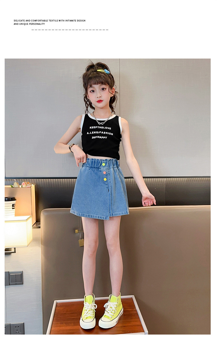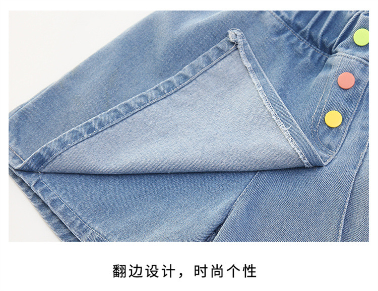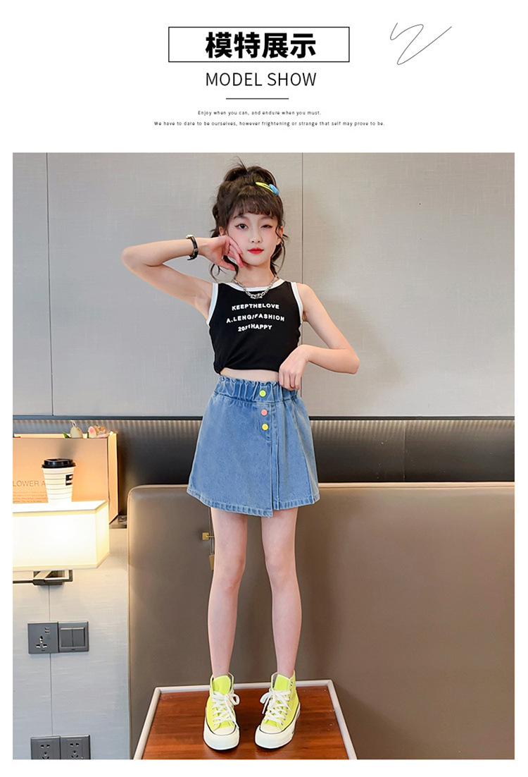2023 여름 소녀 새로운 색상 버클 데님 치마 바지 큰 어린이 한국 높은 허리 슬림 반바지 엔티티 도매스토어 가기