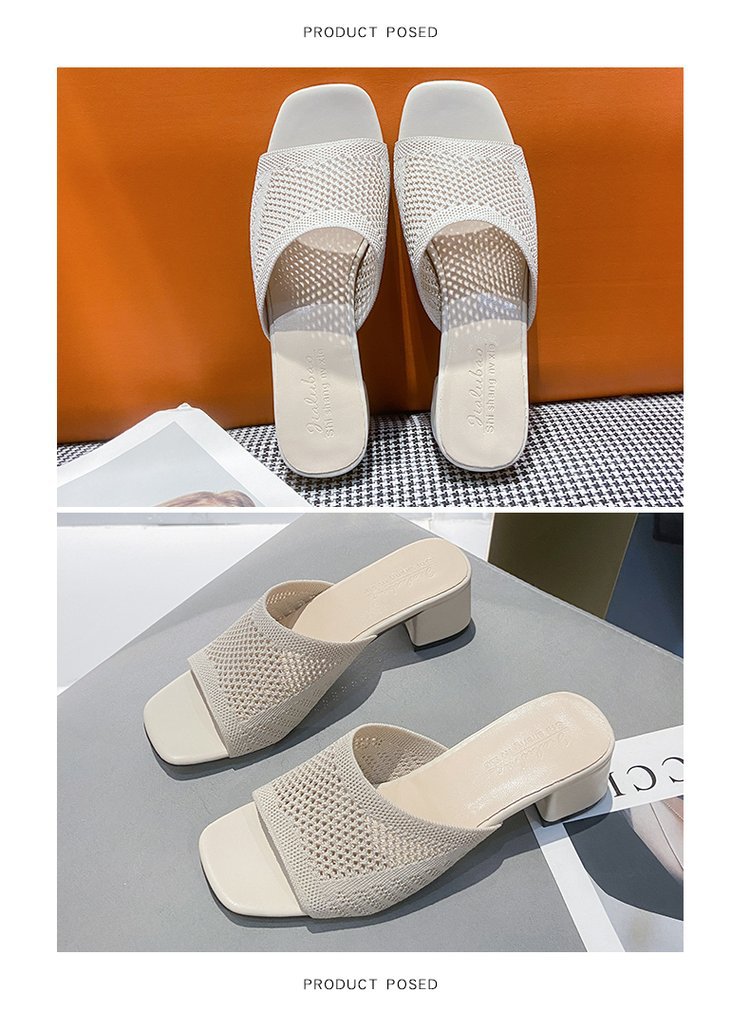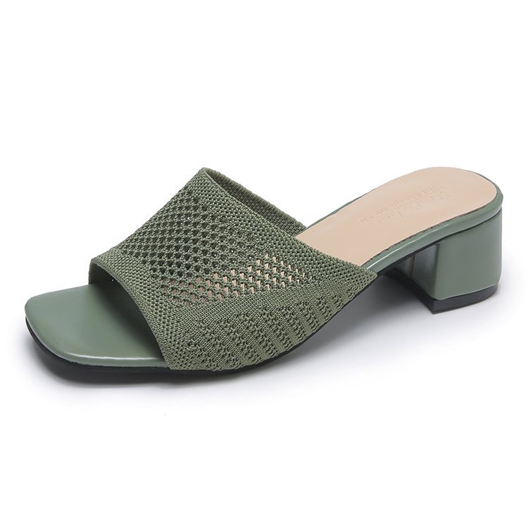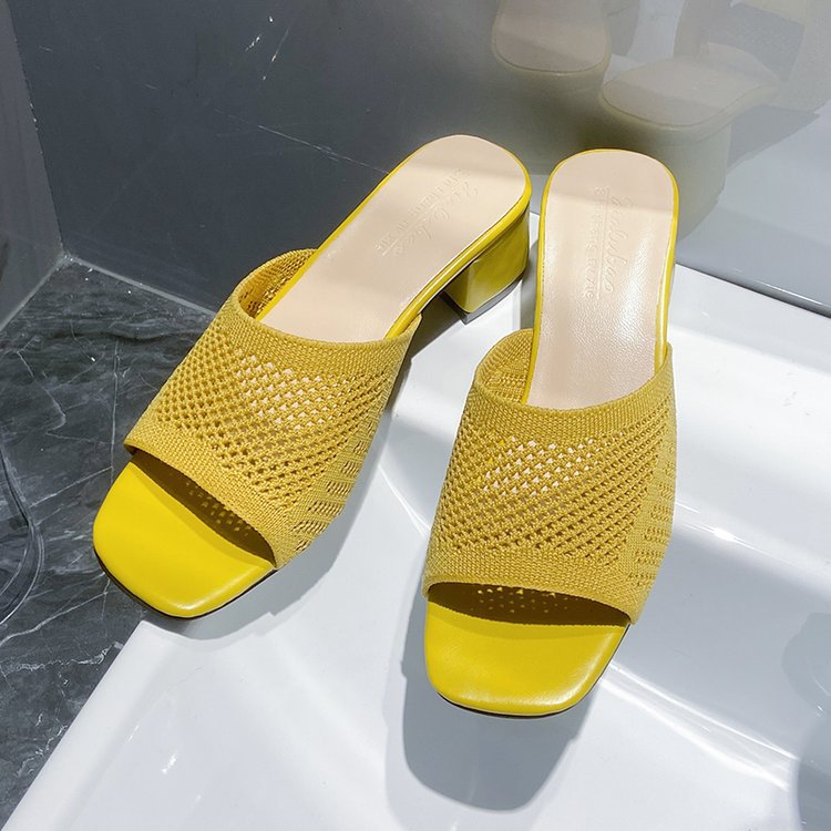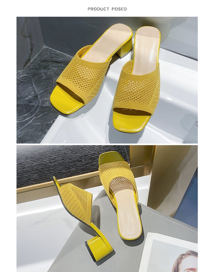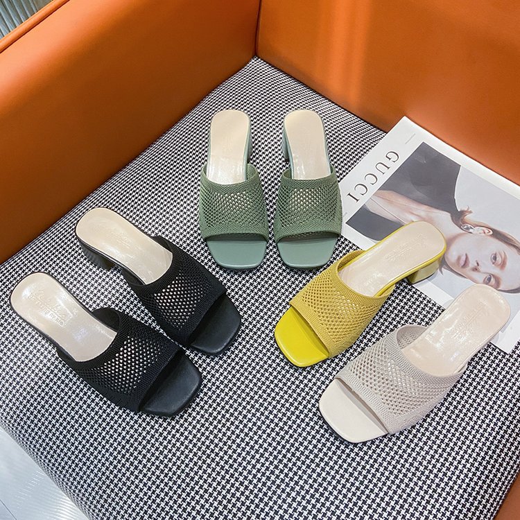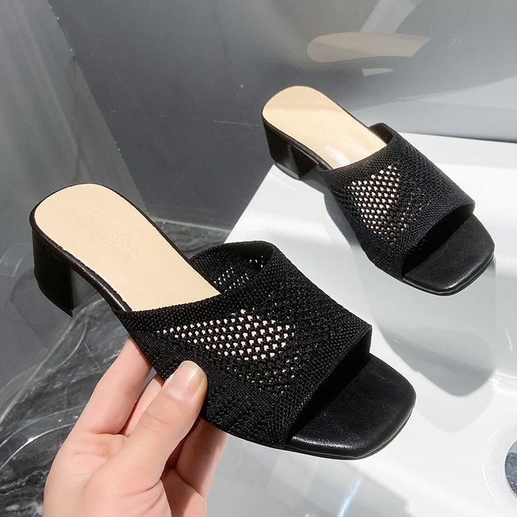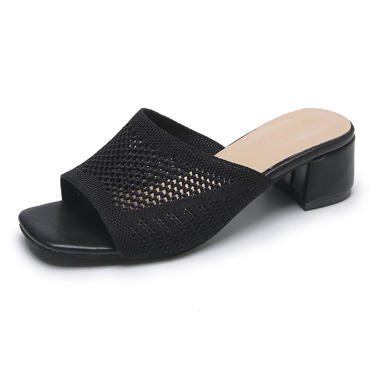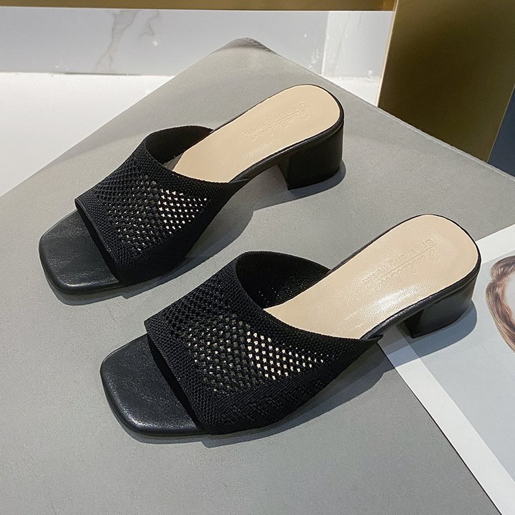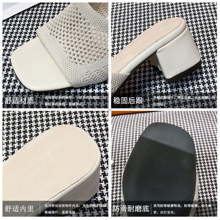 2023 여름 새로운 한국 스타일 플라이 짠 슬리퍼 여성용 두꺼운 굽 오픈 토 슬라이드 세련된 스퀘어 헤드 하이힐 샌들