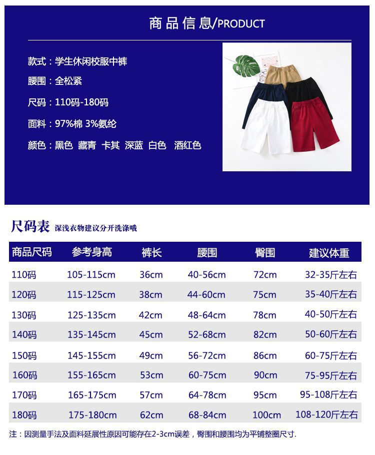 아동 여아 반바지 남아 빨간색 중간 바지 여름 초등학생 진한 파란색 남색 5점 흰색 교복 바지