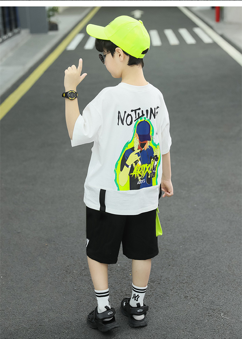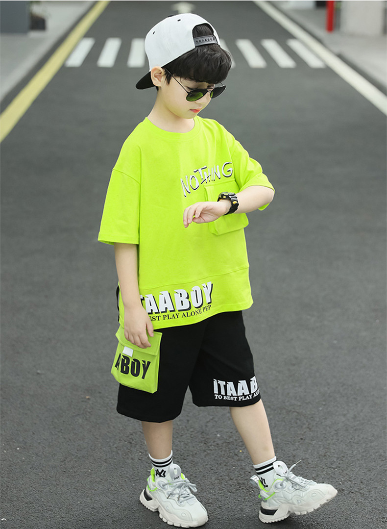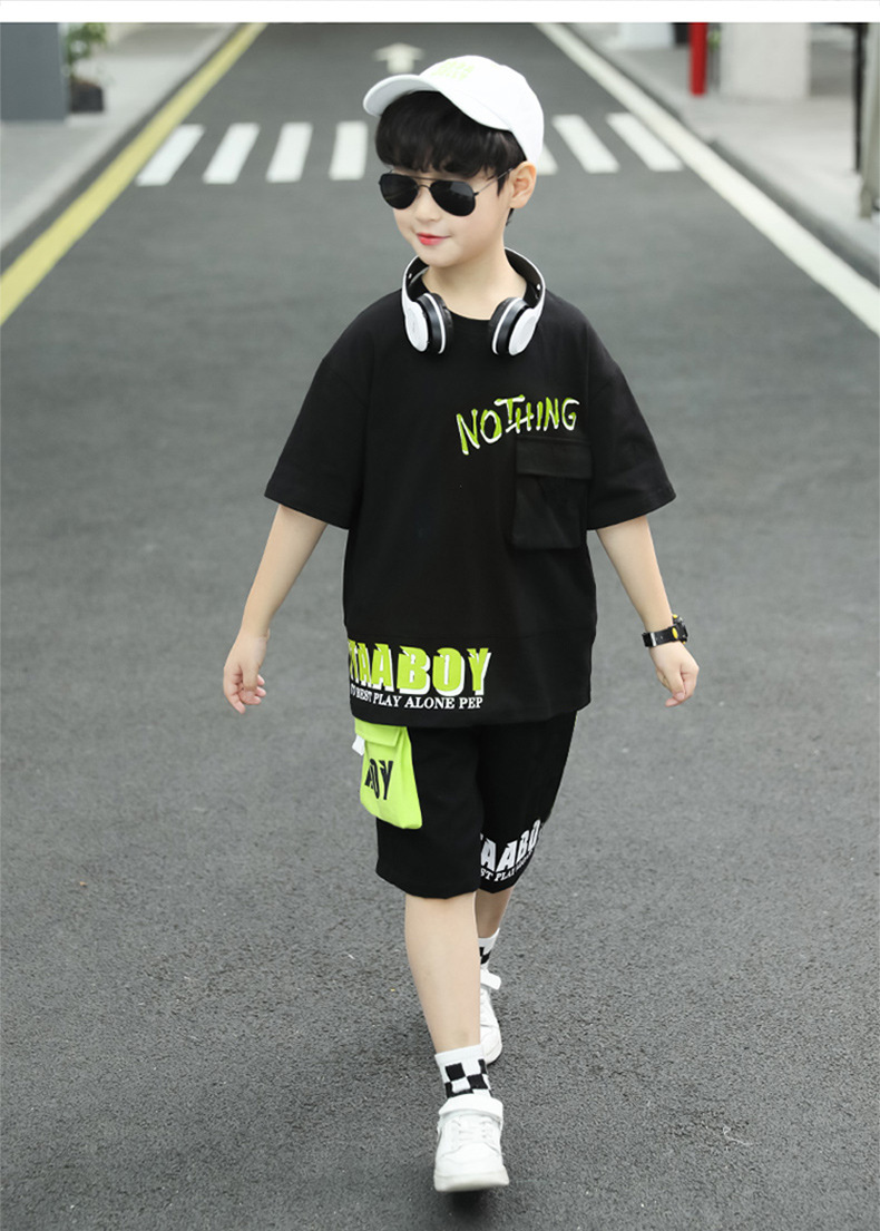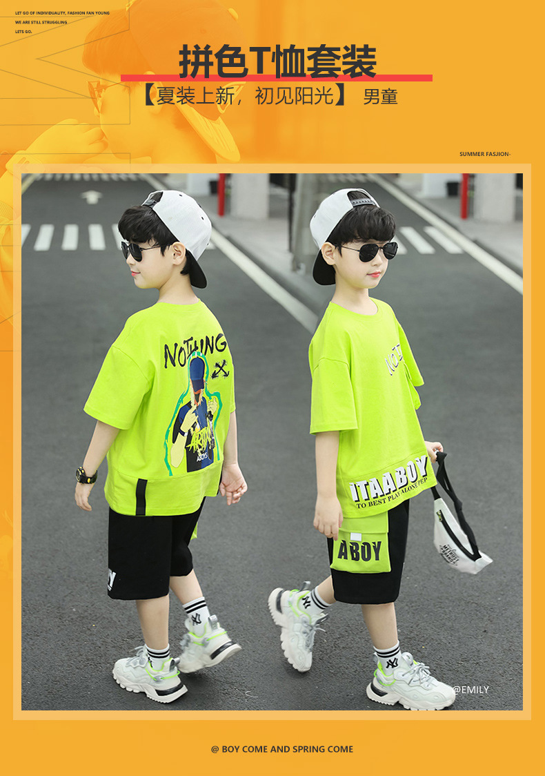 여름 얇은 소년 느슨한 컬러 블록 반팔 티셔츠 반 반바지 세트 학생 유행 캐주얼 투피스 세트스토어 가기