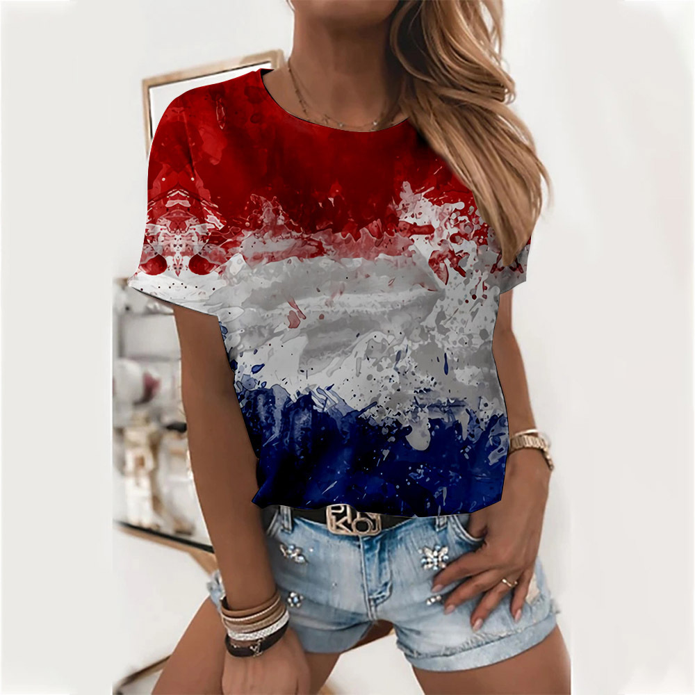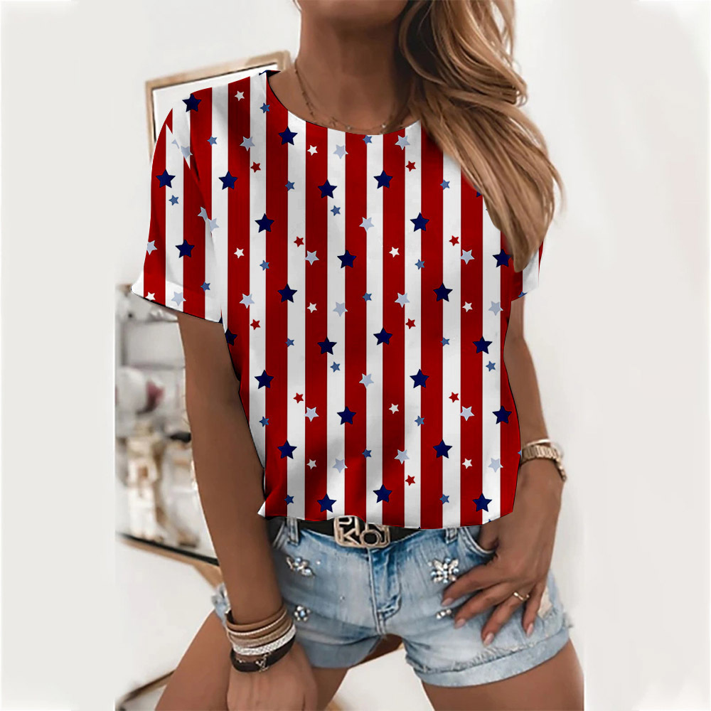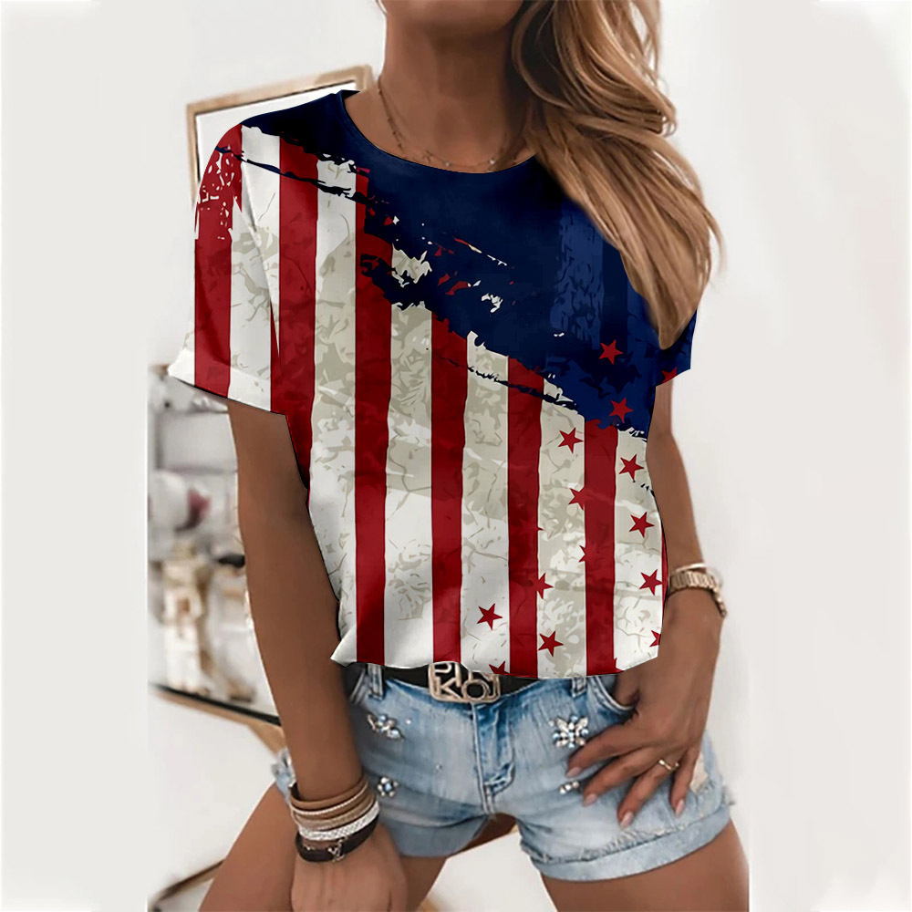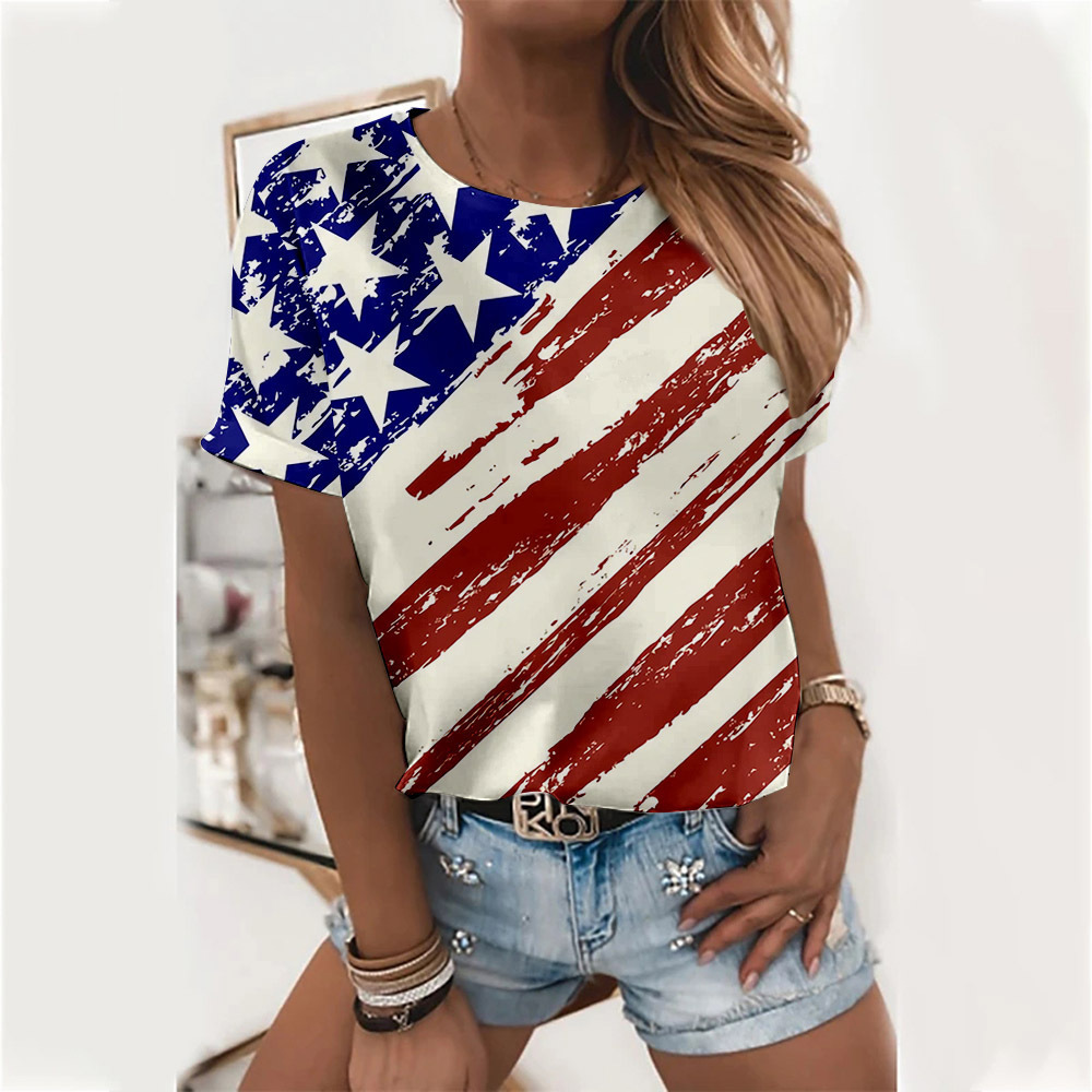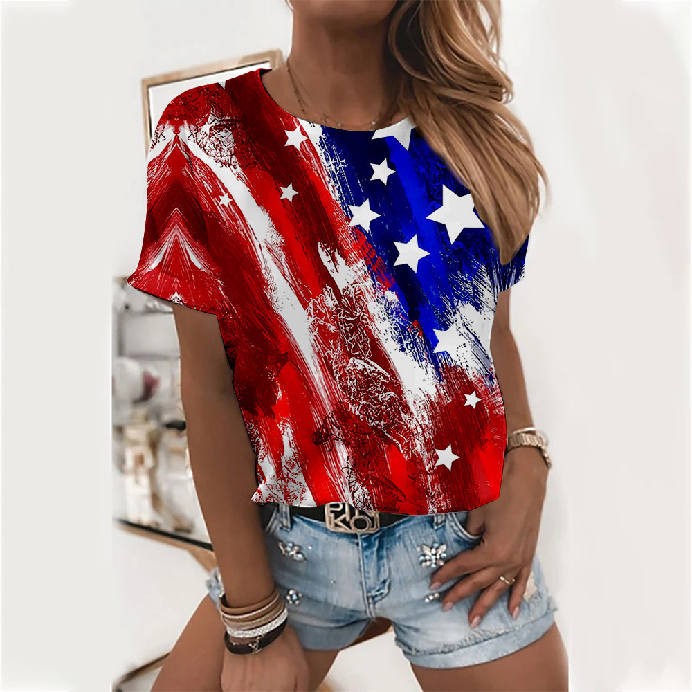 2023 새로운 아마존 국경 간 대외 무역 여성 의류 미국 독립 기념일 미국 디지털 인쇄 라운드 넥 여성 티셔츠스토어 가기