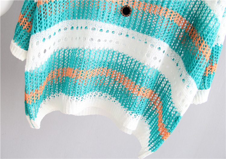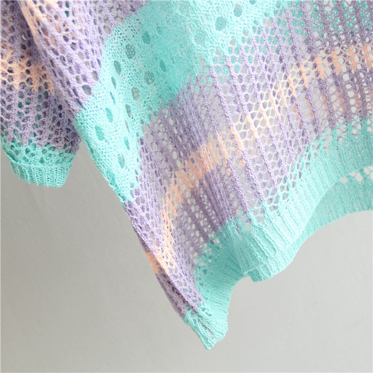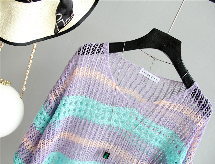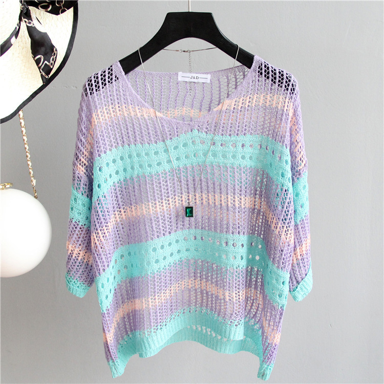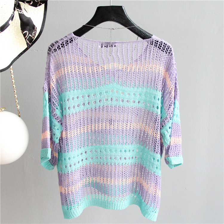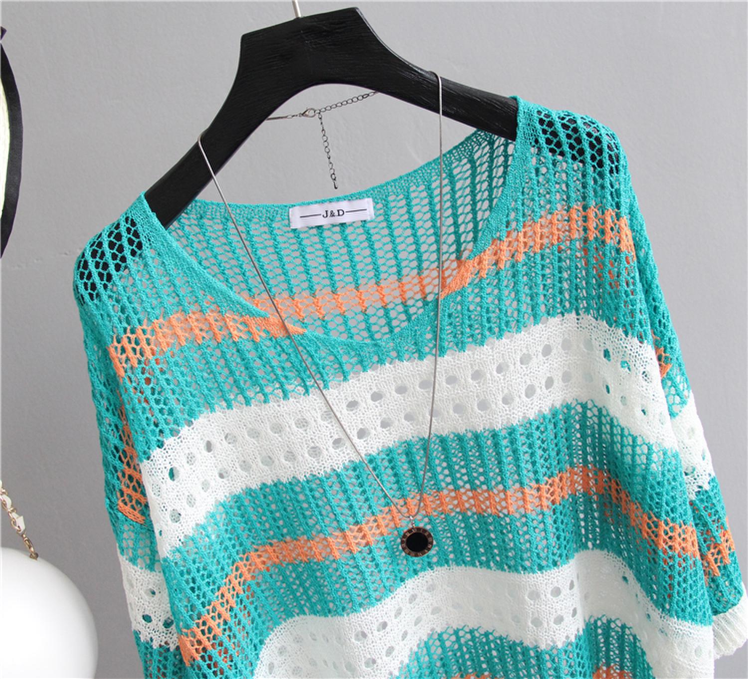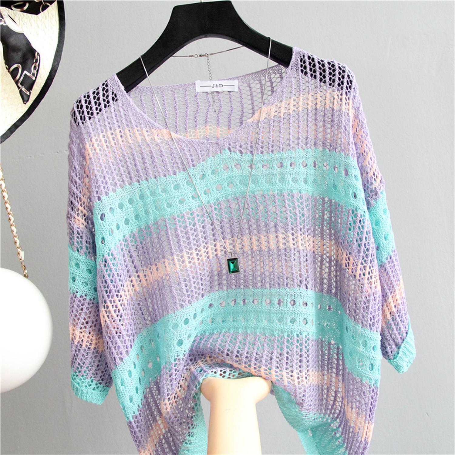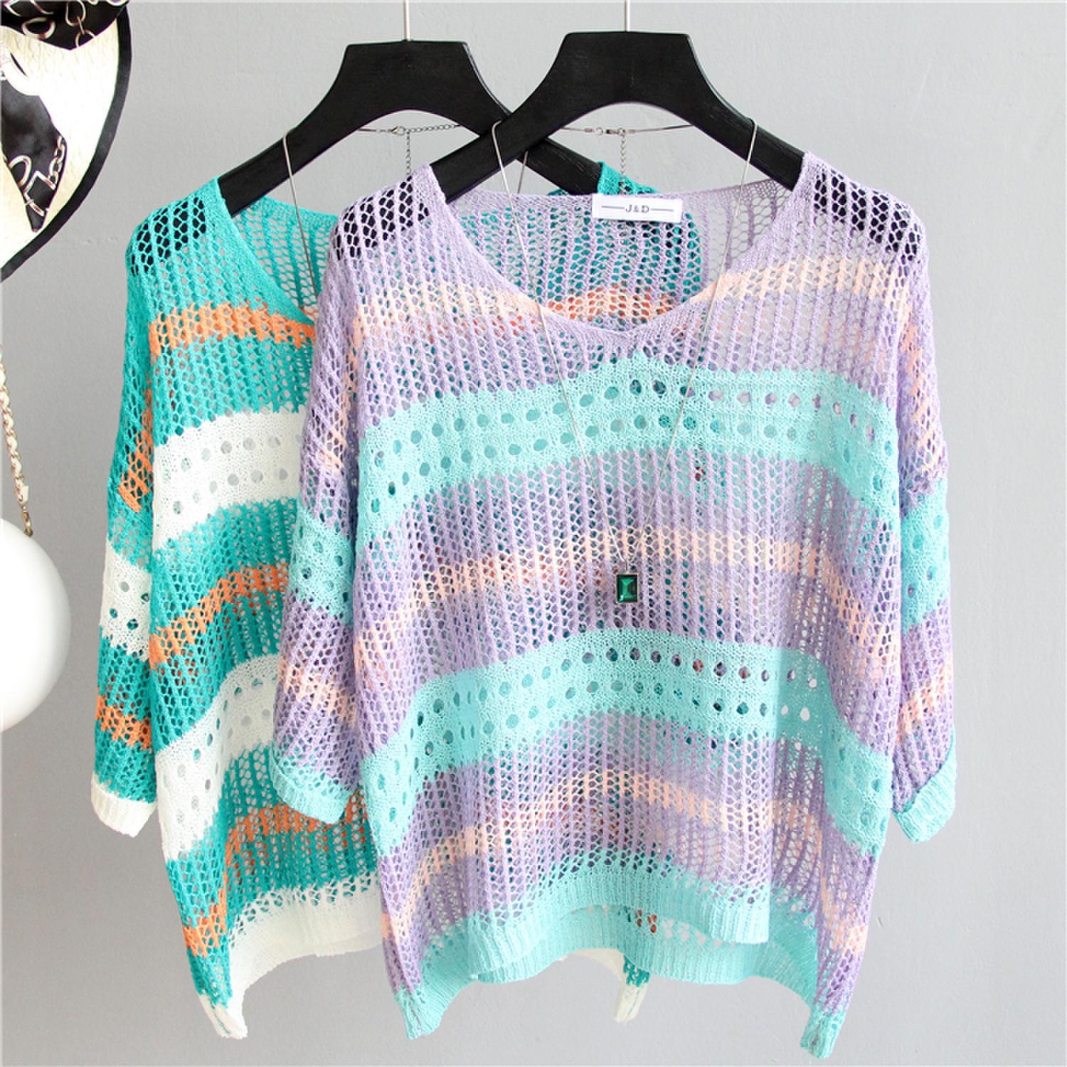 2025 여름 한국 스타일 여성용 속이 빈 탑, 얇은 니트 스웨터, 중간 소매, 루즈한 컬러풀 스트라이프 V넥 풀오버 블라우스
