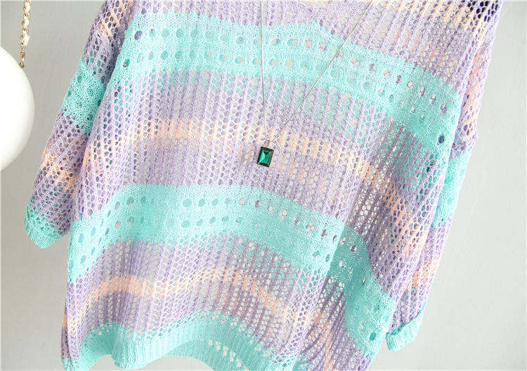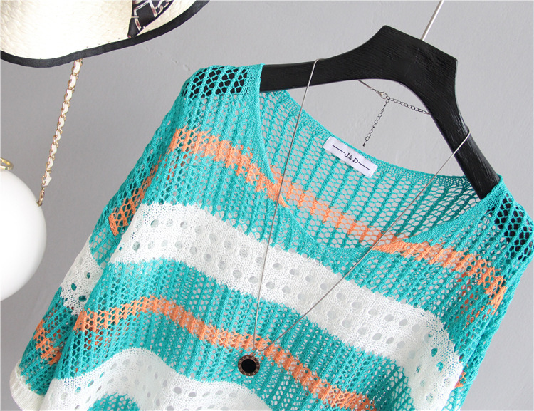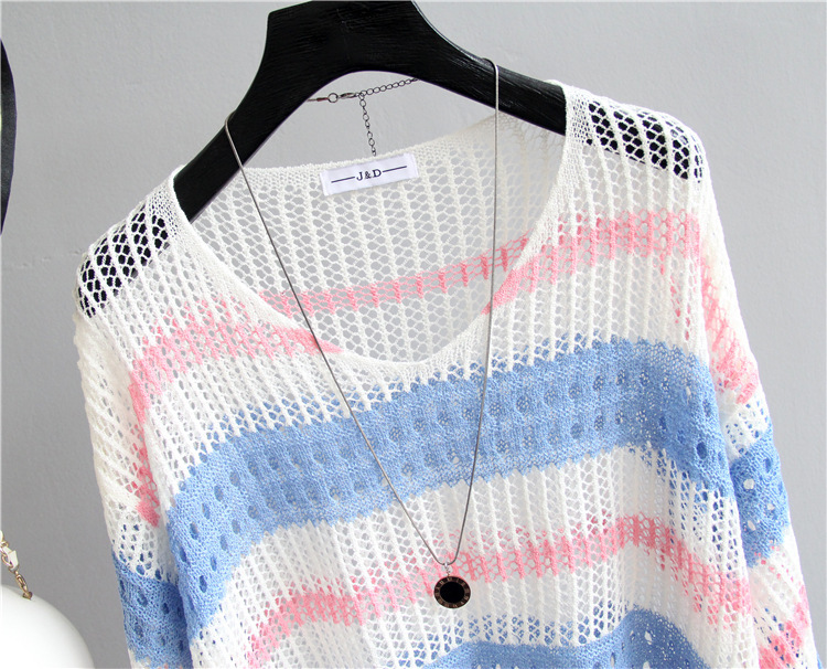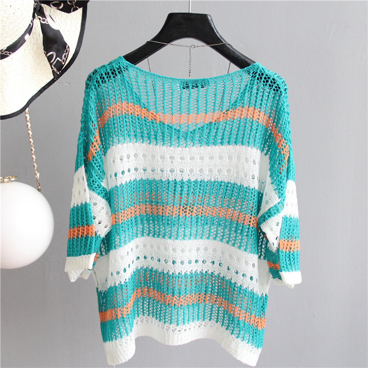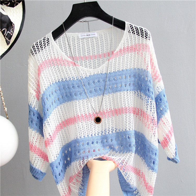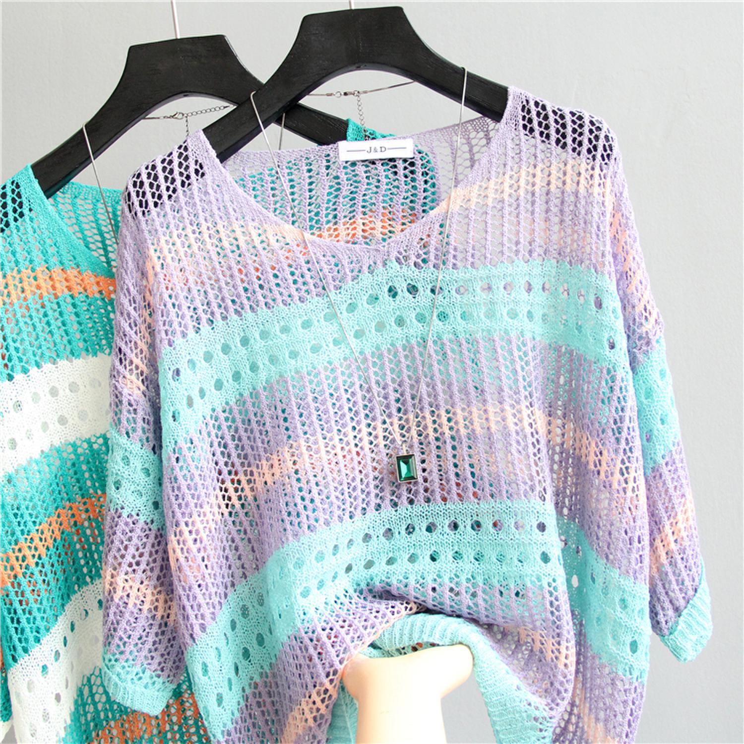 2025 여름 한국 스타일 여성용 속이 빈 탑, 얇은 니트 스웨터, 중간 소매, 루즈한 컬러풀 스트라이프 V넥 풀오버 블라우스스토어 가기