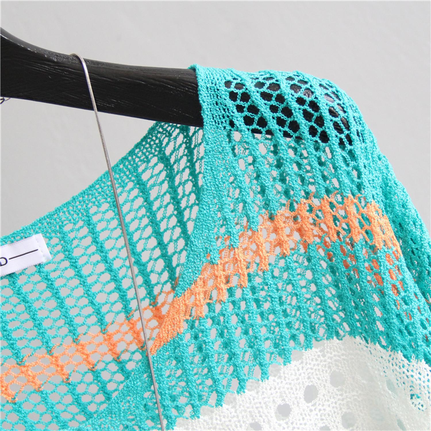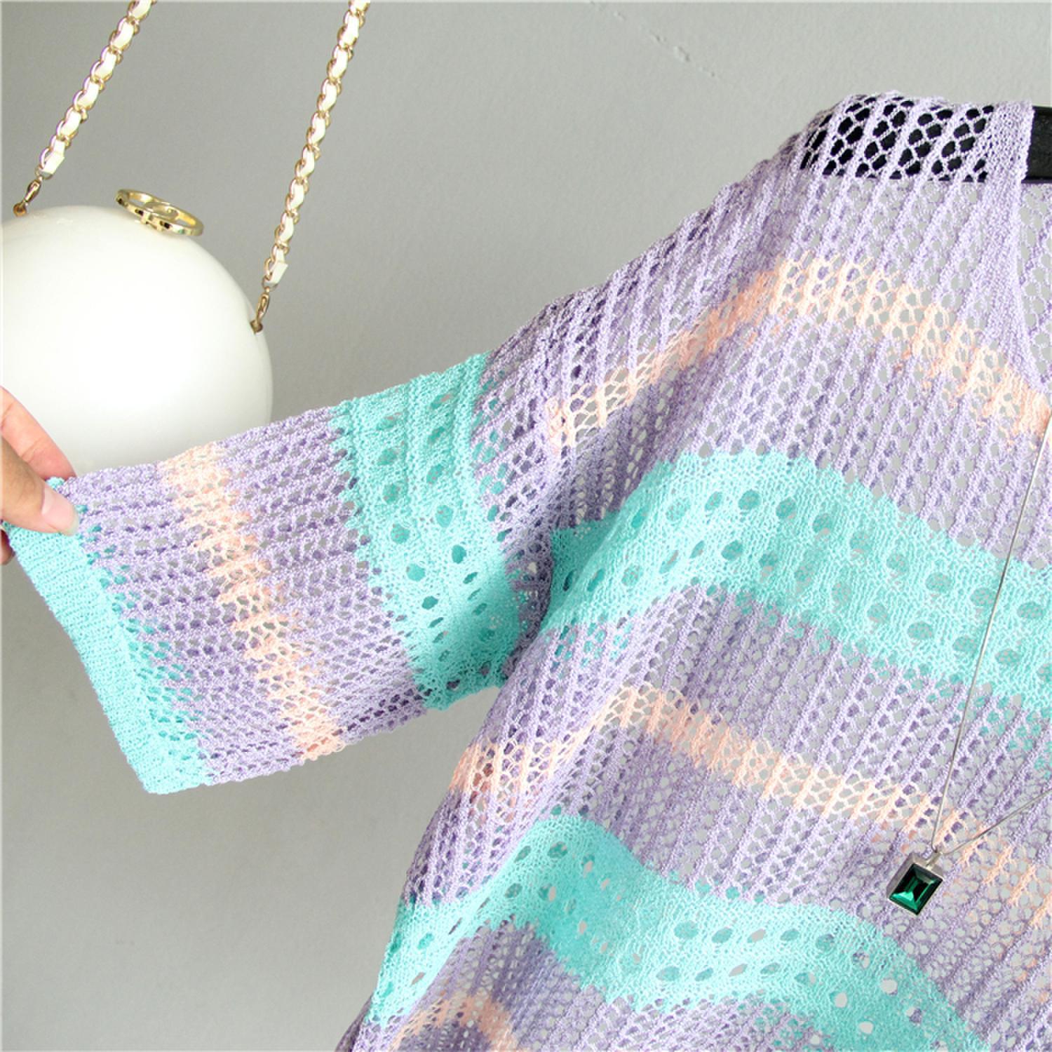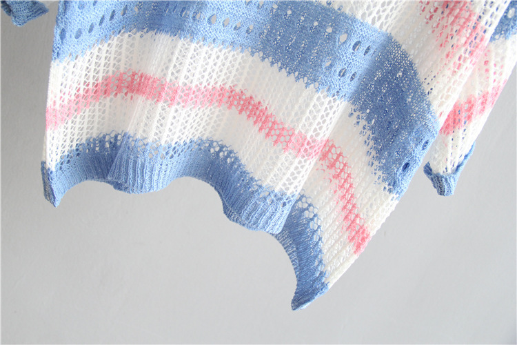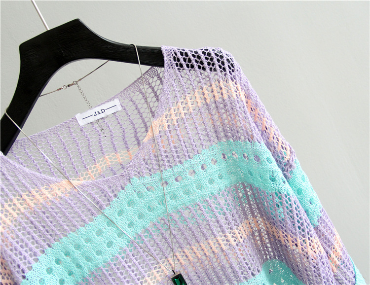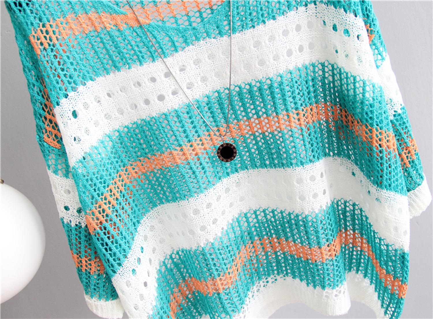 2025 여름 한국 스타일 여성용 속이 빈 탑, 얇은 니트 스웨터, 중간 소매, 루즈한 컬러풀 스트라이프 V넥 풀오버 블라우스스토어 가기