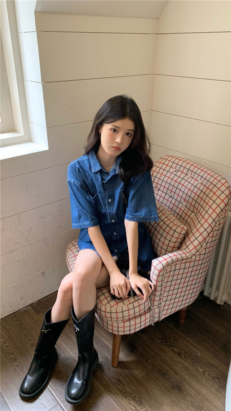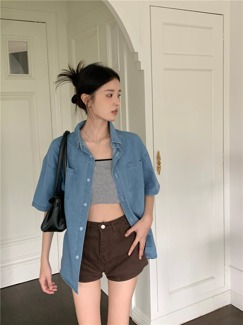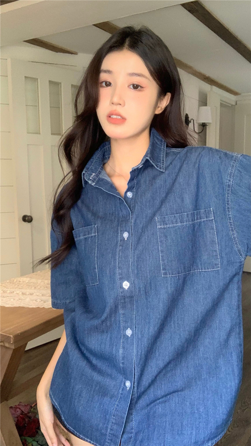 여성을위한 한국 스타일 느슨한 반팔 데님 셔츠 2025 봄, 여름 캐주얼 디자인 얇은 재킷 탑 공장 직접 판매스토어 가기