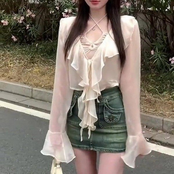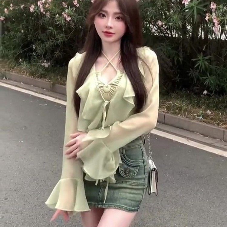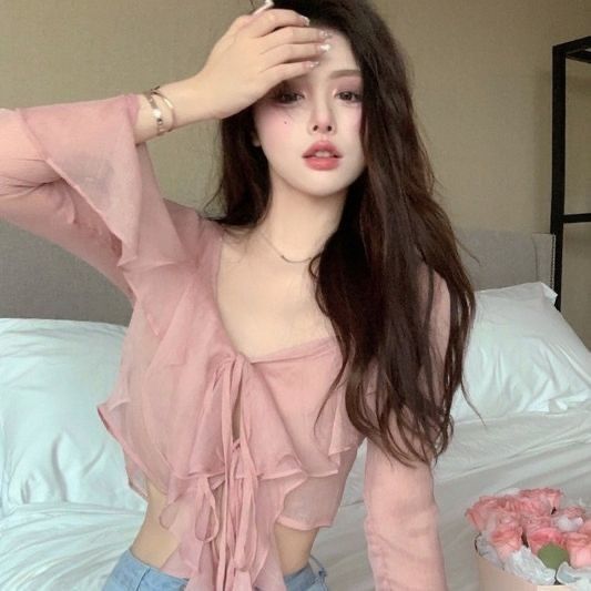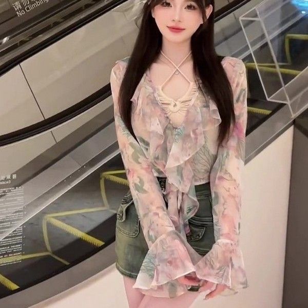 달콤한 나이 감소 프린트 쉬폰 자외선 차단제 가디건 여성용 패션 브이넥 슬림핏 슬리밍 짧은 외부 트럼펫 슬리브 티셔츠스토어 가기