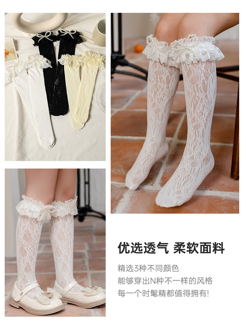 무료 배송 새로운 봄과 여름 얇은 면 중공 레이스 어린이 중간 길이 양말 진주 활 귀여운 레이스 여아 긴 양말