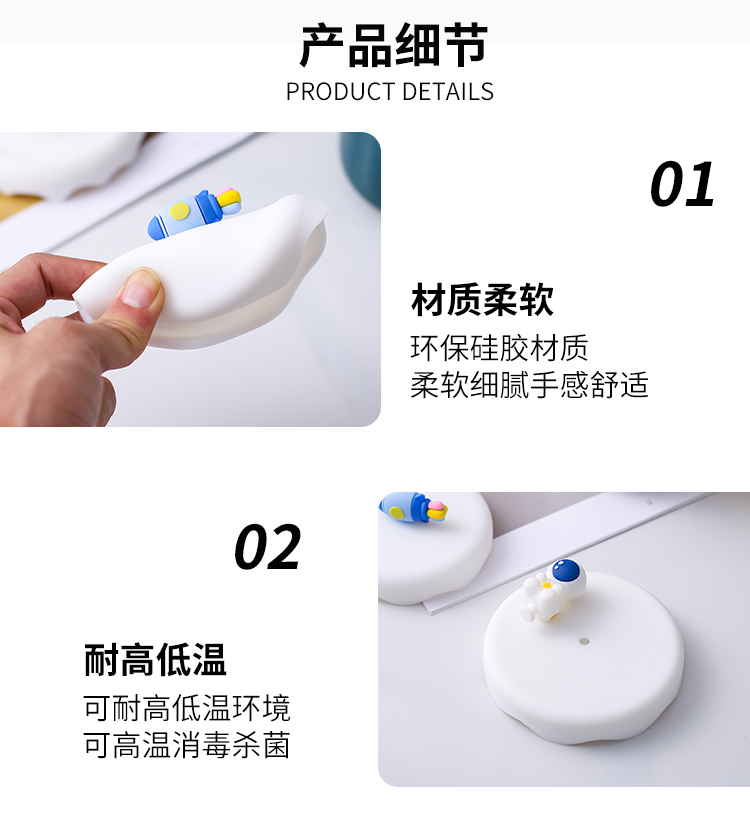 • 产品效果: 3D立体卡通提手,100%食品级硅胶材质