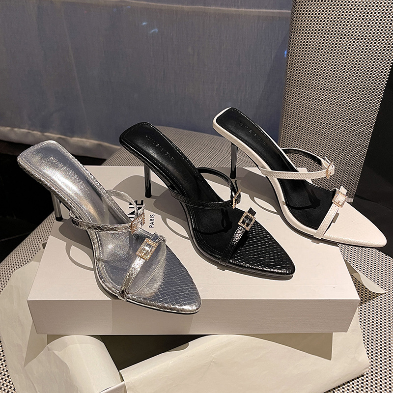 섹시한 포인티드 토 하이힐, 여름 신상품, 라인스톤 슬림힐 로만 샌들, 사각 버클 오픈토 여성 슬리퍼스토어 가기