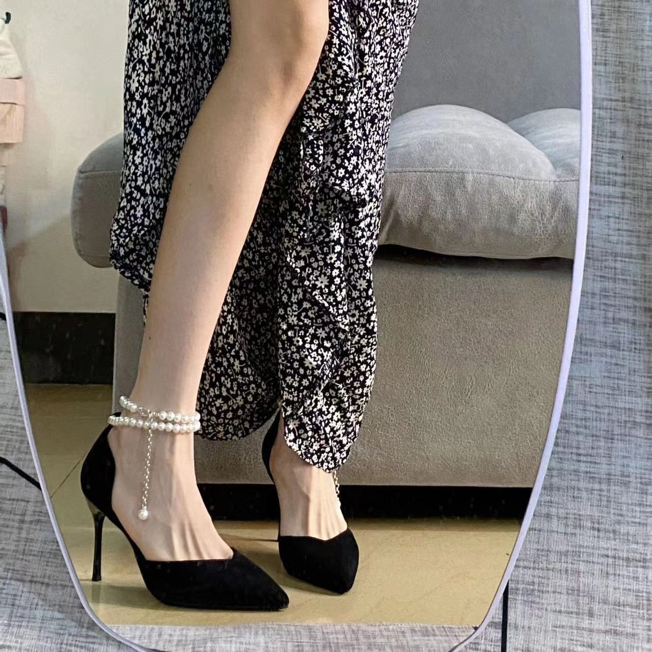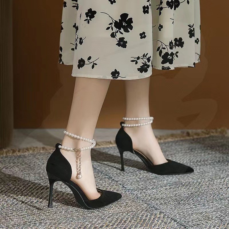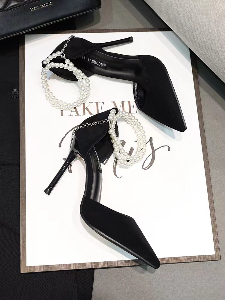 2023 여름 새로운 들러리 신발 진주 활 블랙 스틸레토 프랑스 우아한 하이힐 뾰족한 발가락 신발 여성스토어 가기