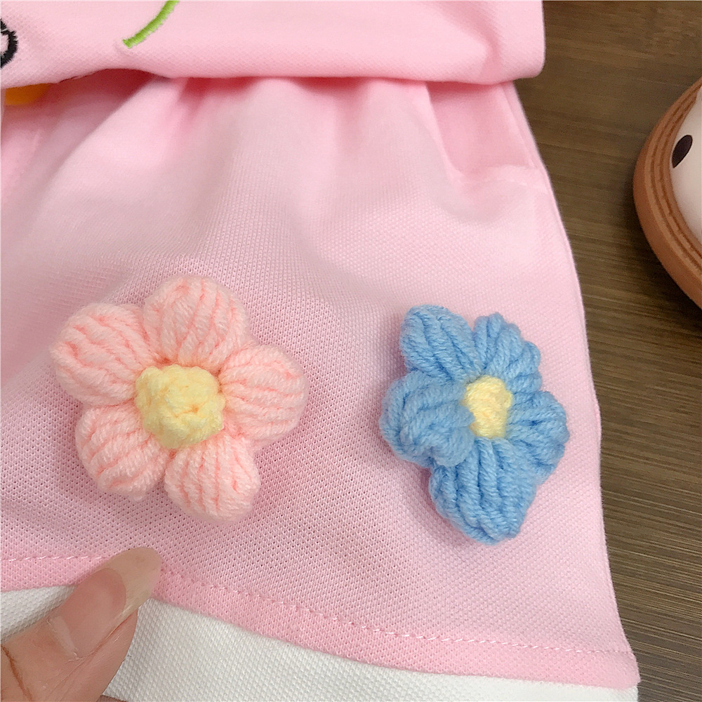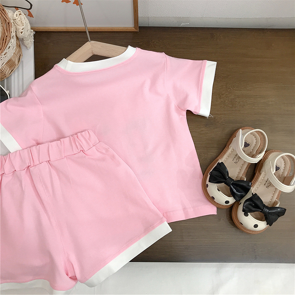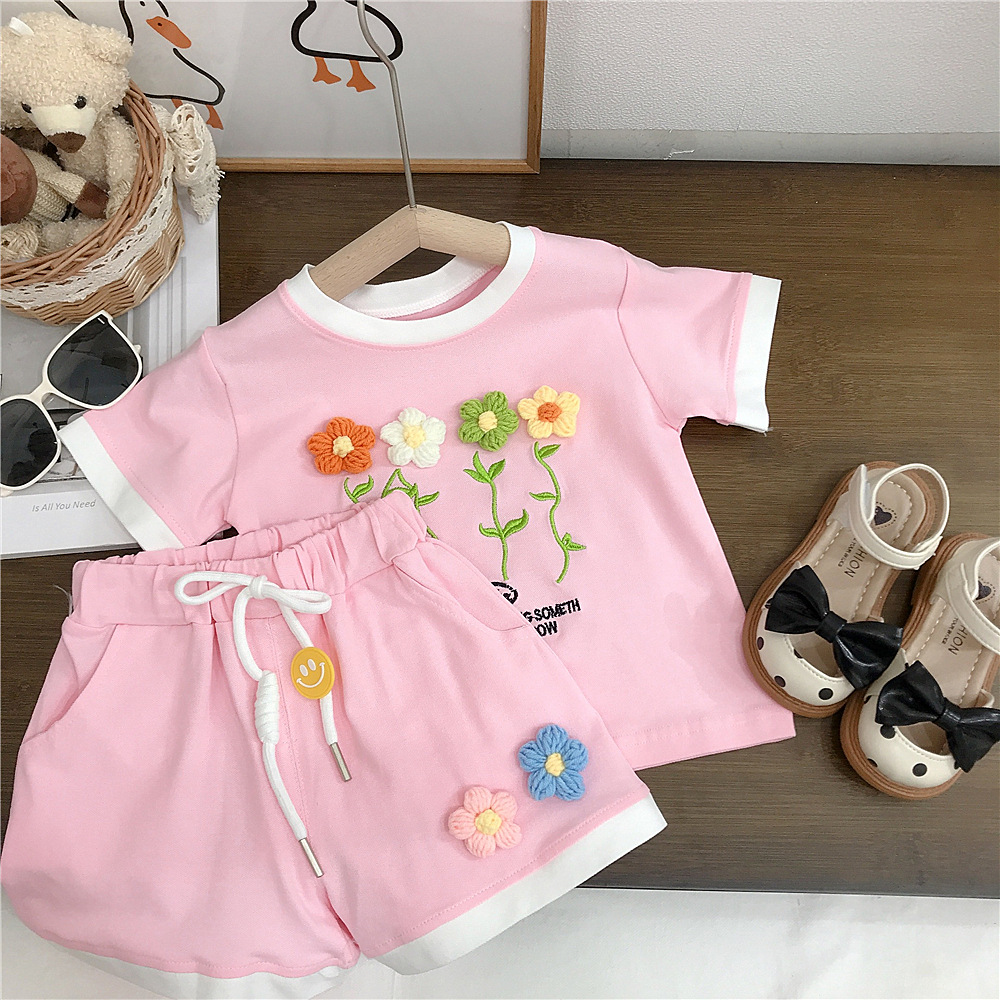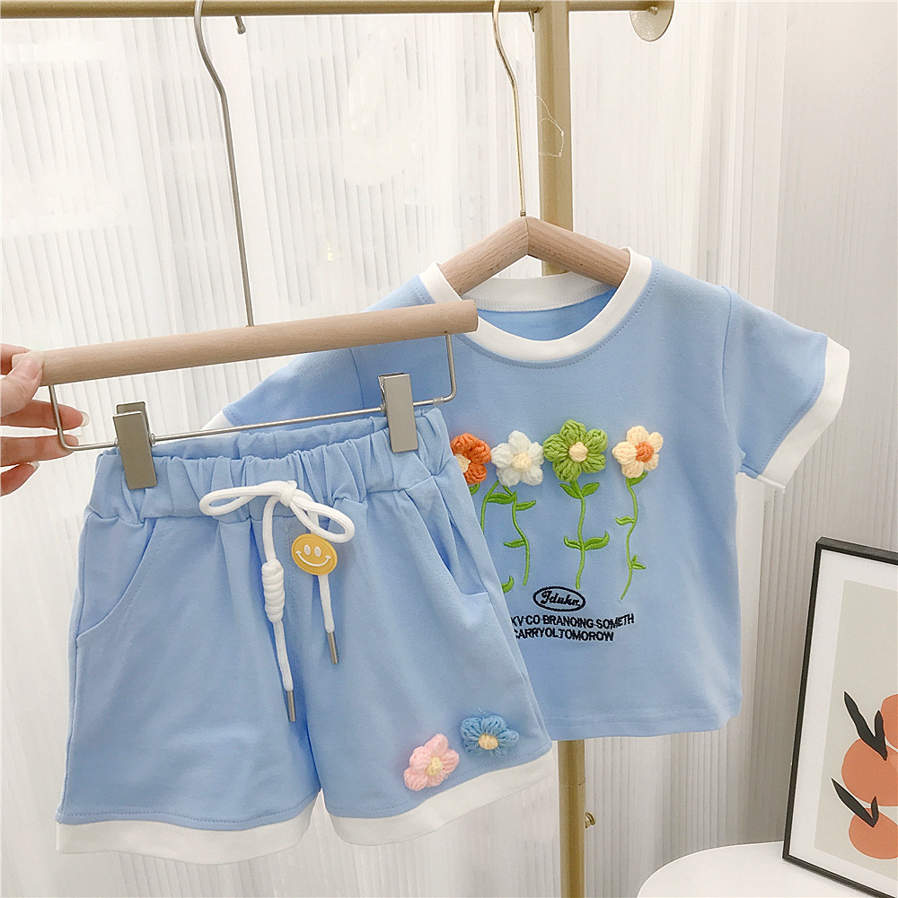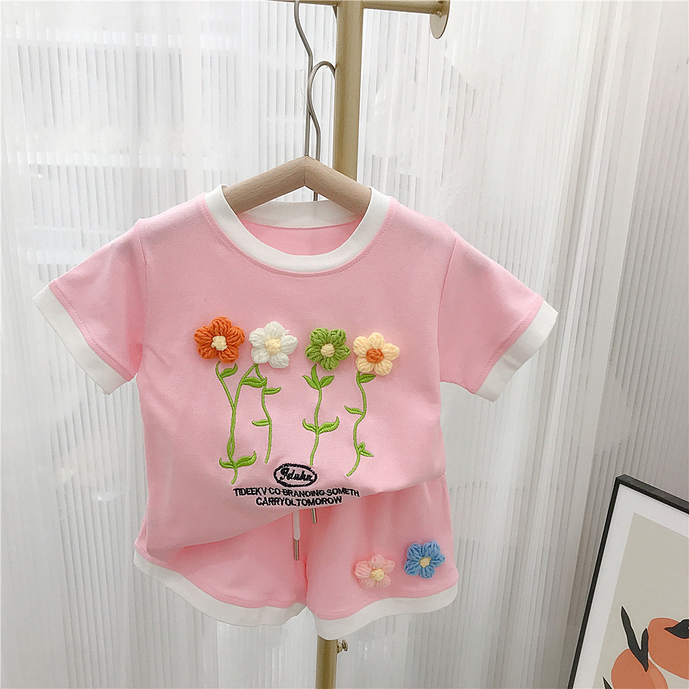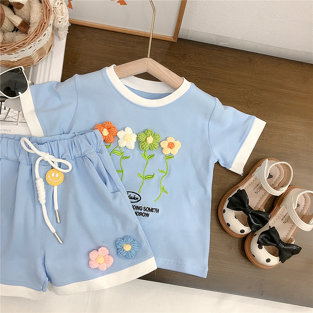 한국 여자 여름 세트 2023 새로운 여성 아기 작은 꽃 짧은 소매 캐주얼 반바지 어린이 대외 무역의 한국어 버전