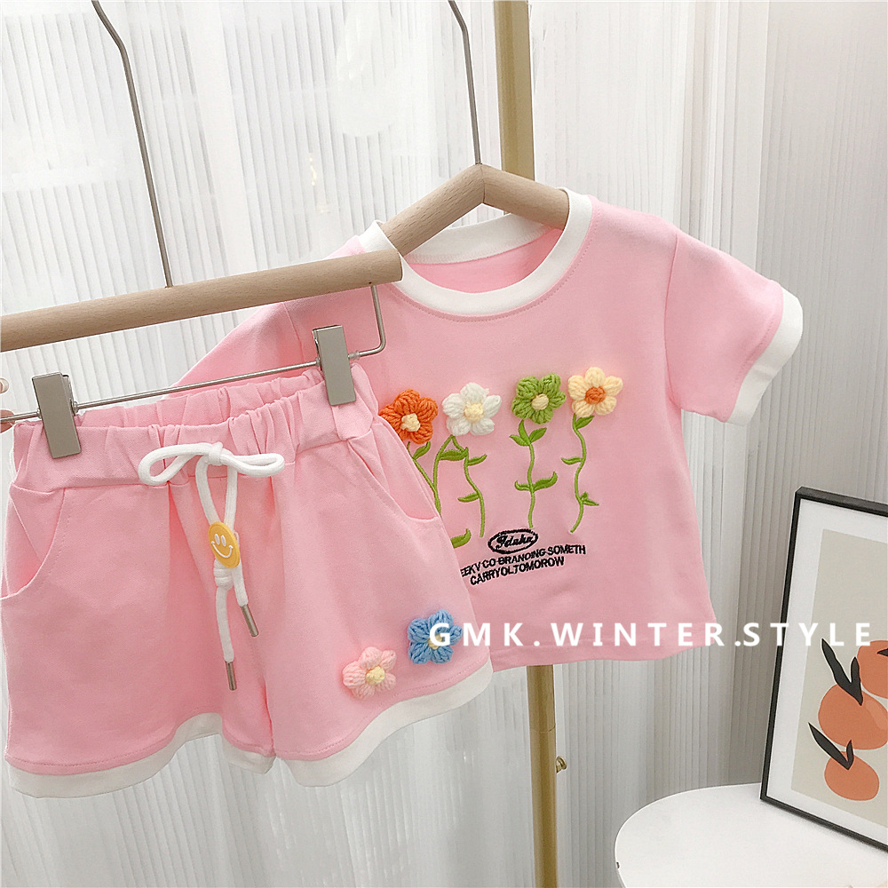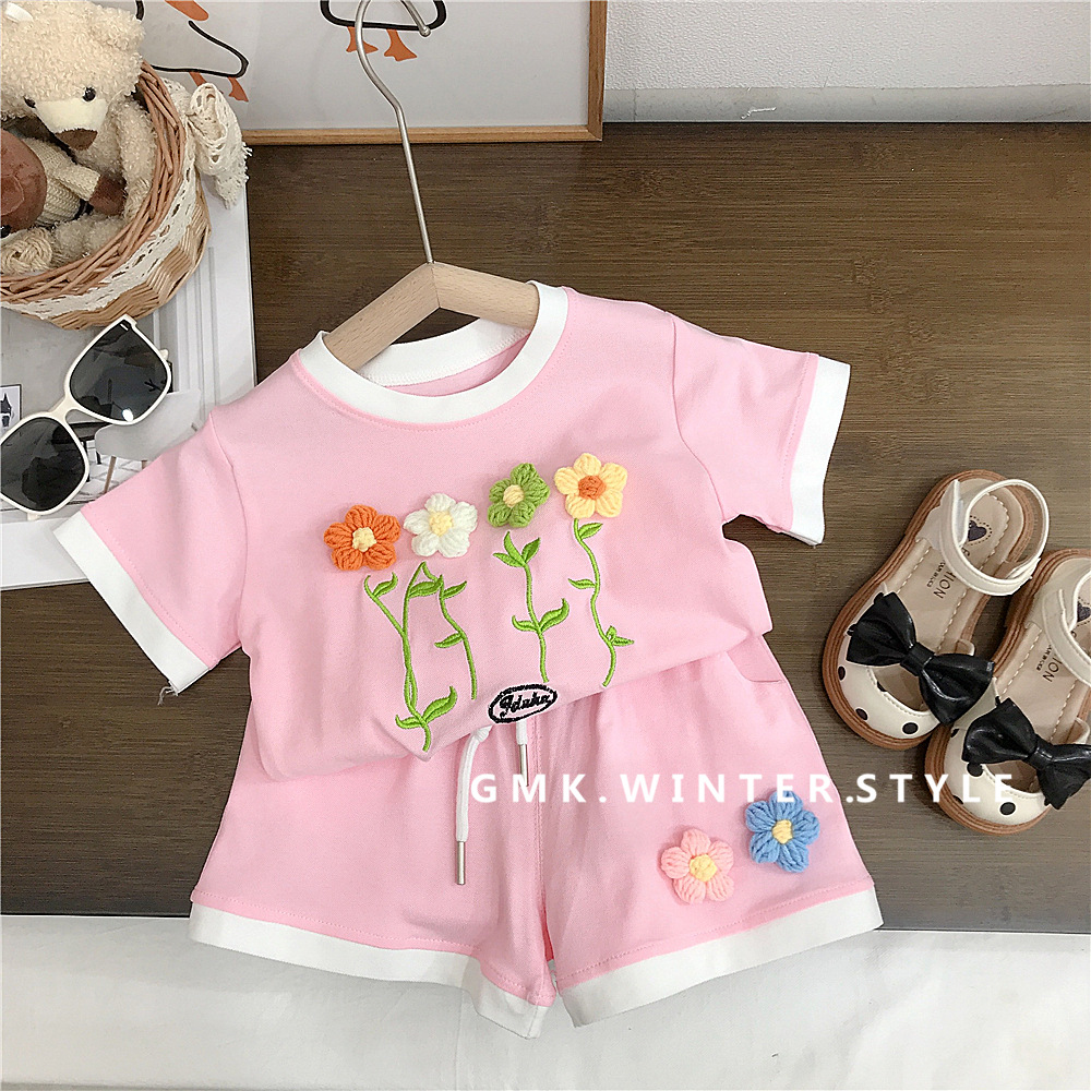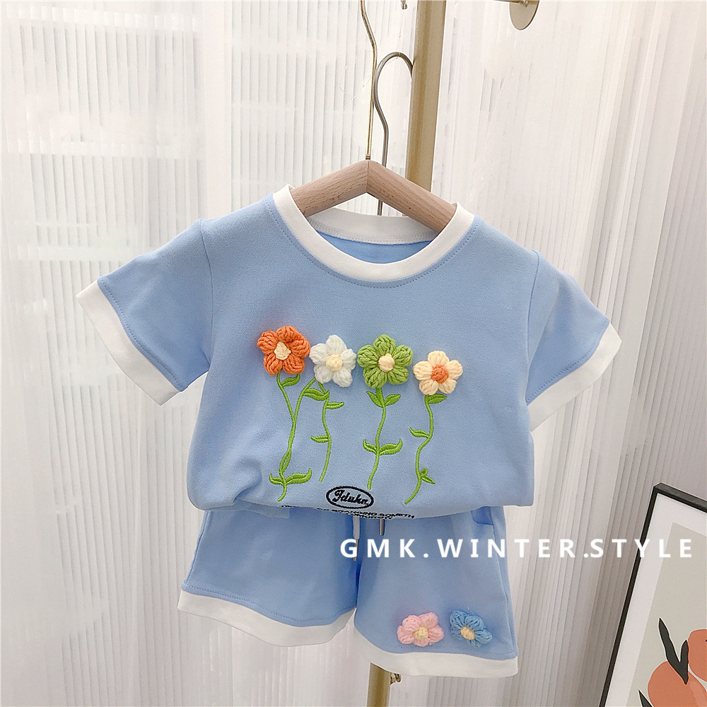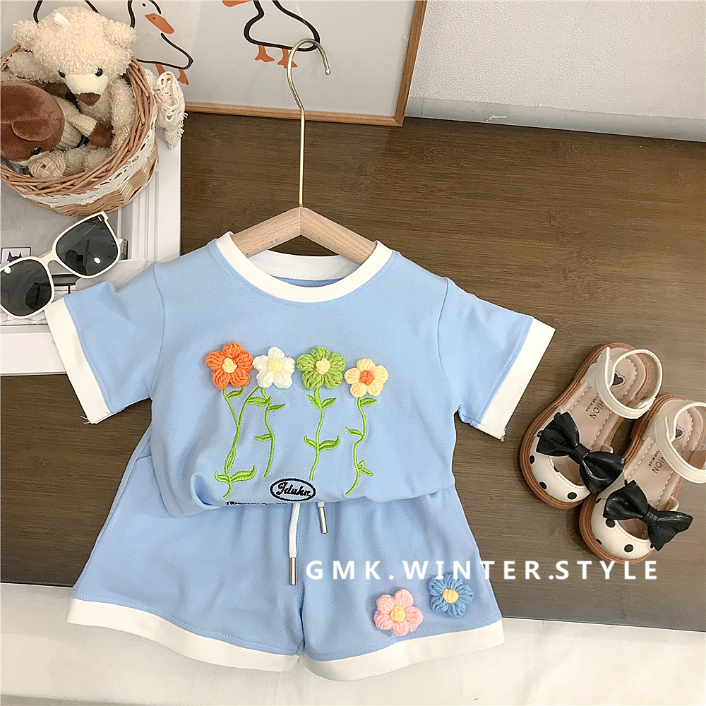 한국 여자 여름 세트 2023 새로운 여성 아기 작은 꽃 짧은 소매 캐주얼 반바지 어린이 대외 무역의 한국어 버전스토어 가기