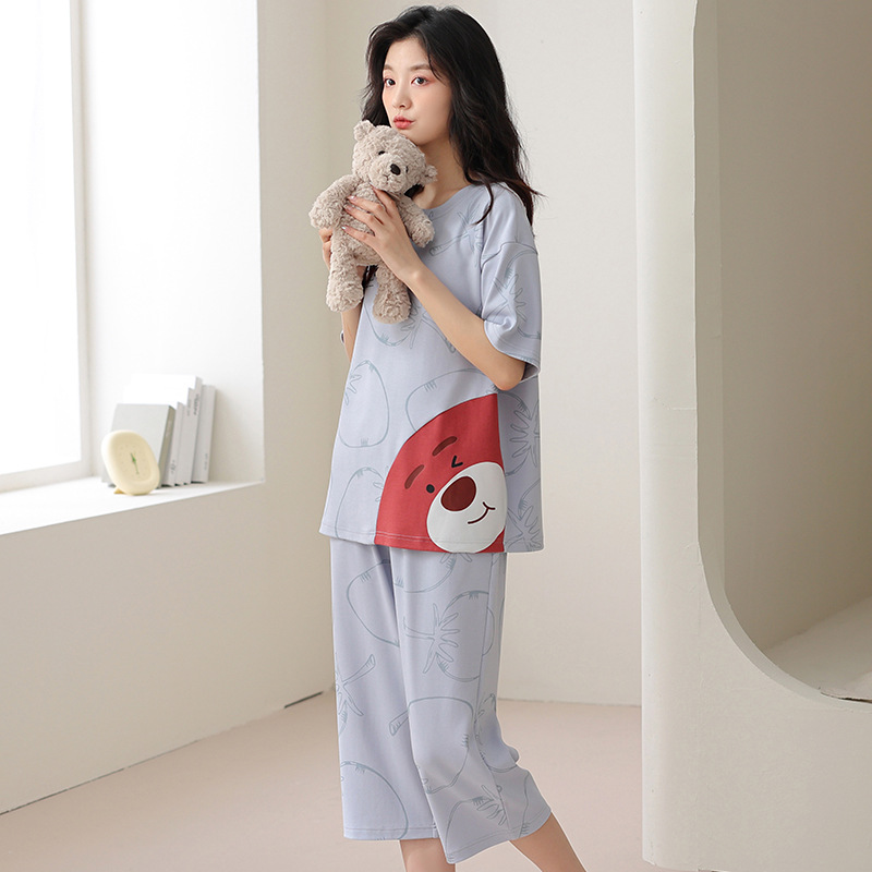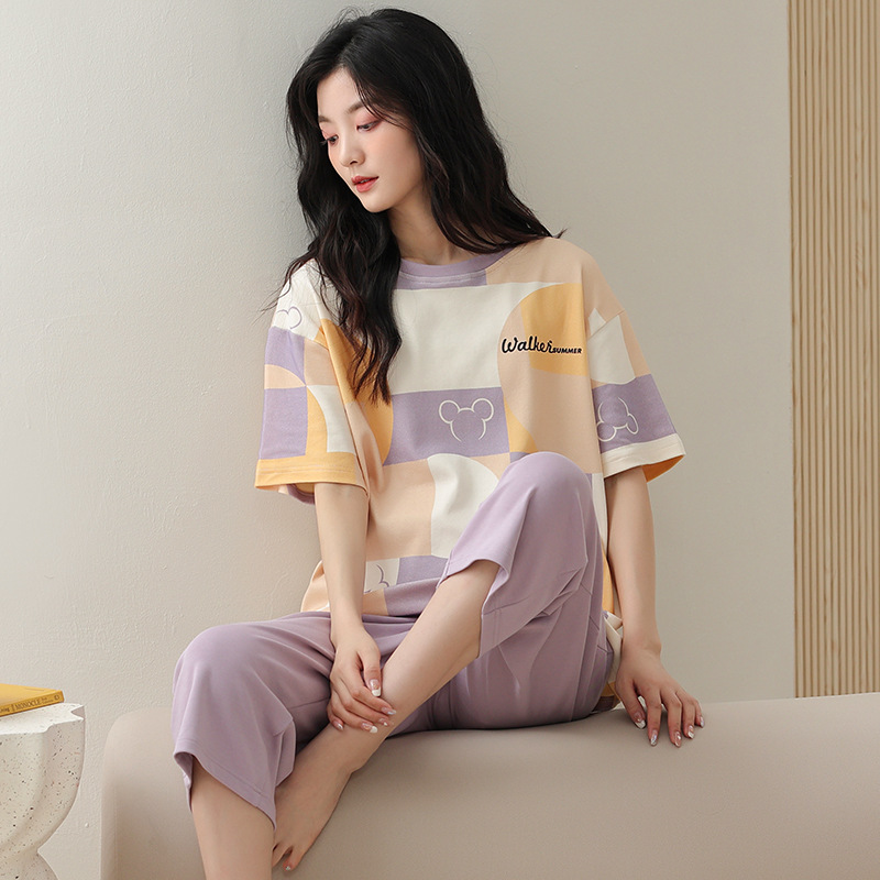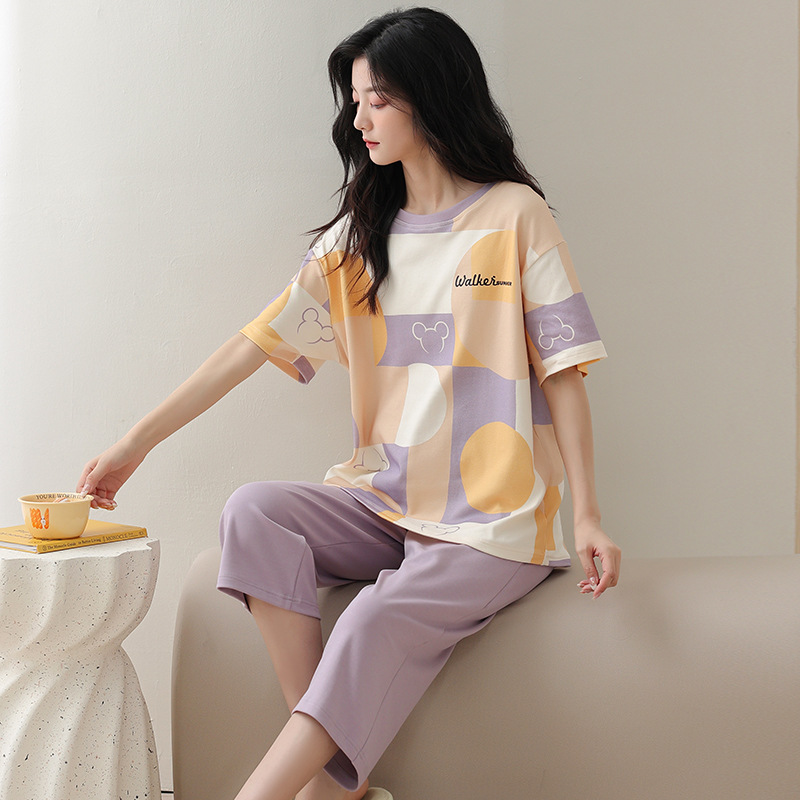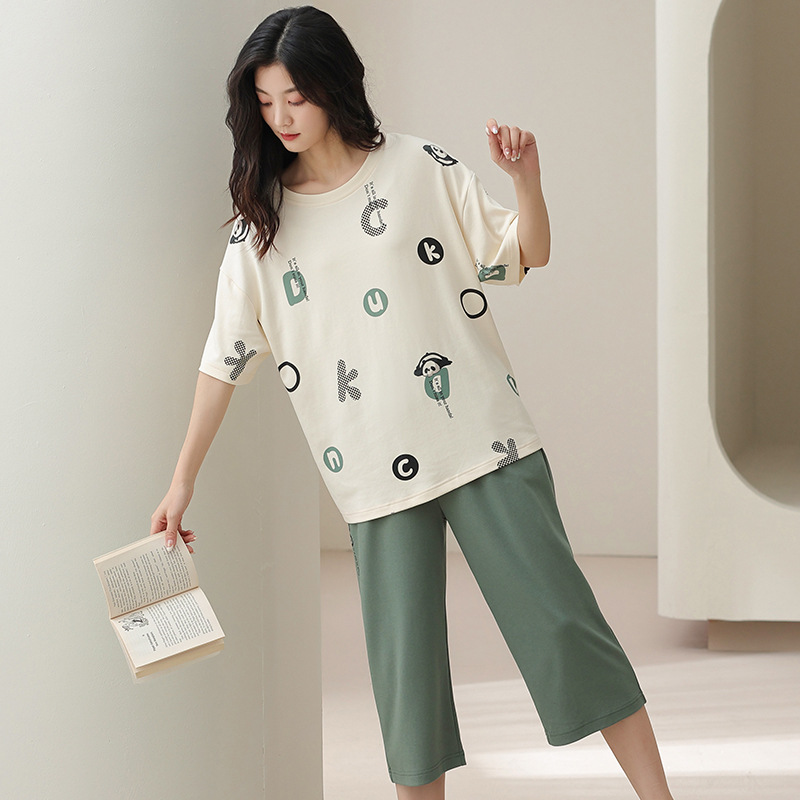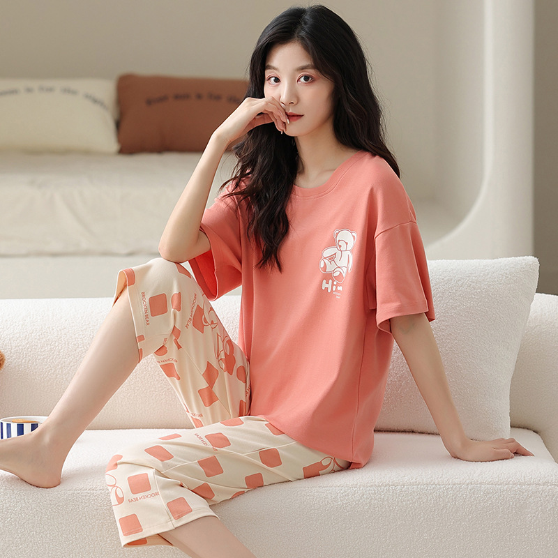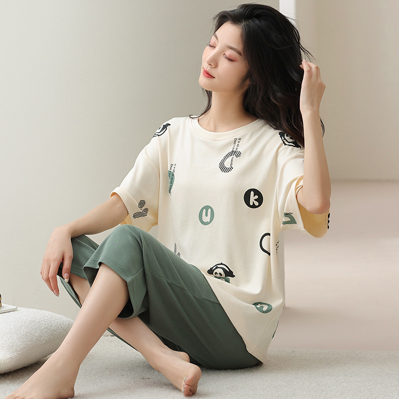 Mulong 귀족 가족 잠옷 여자의 봄과 여름 2023 새로운 면 반팔 카프리 바지 캐주얼 심플 가정복 세트스토어 가기