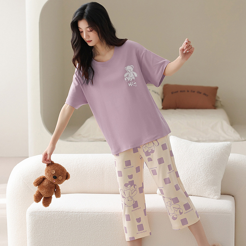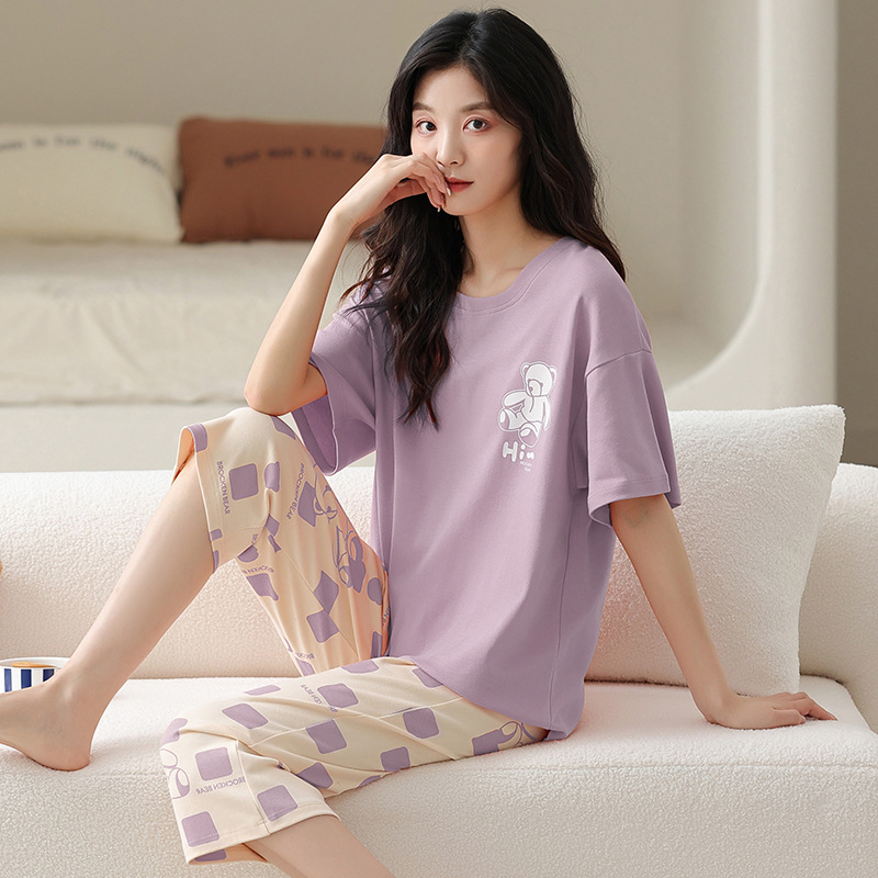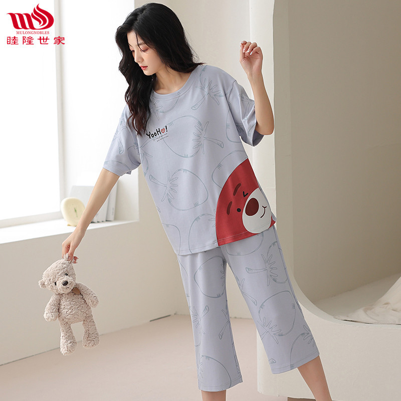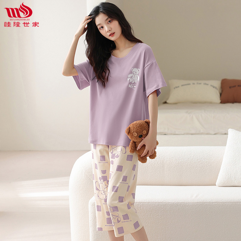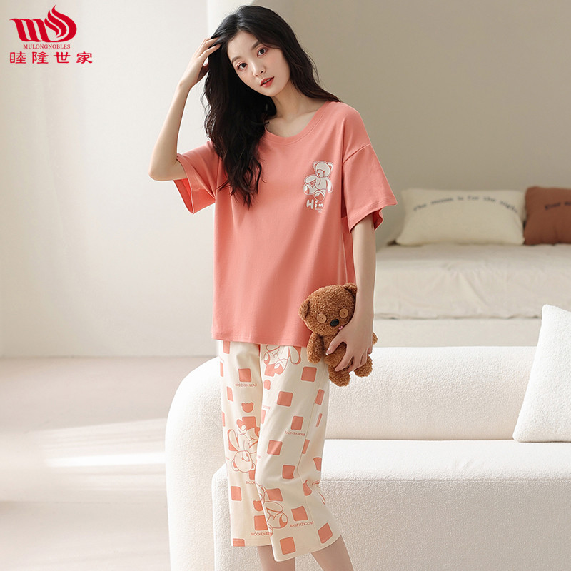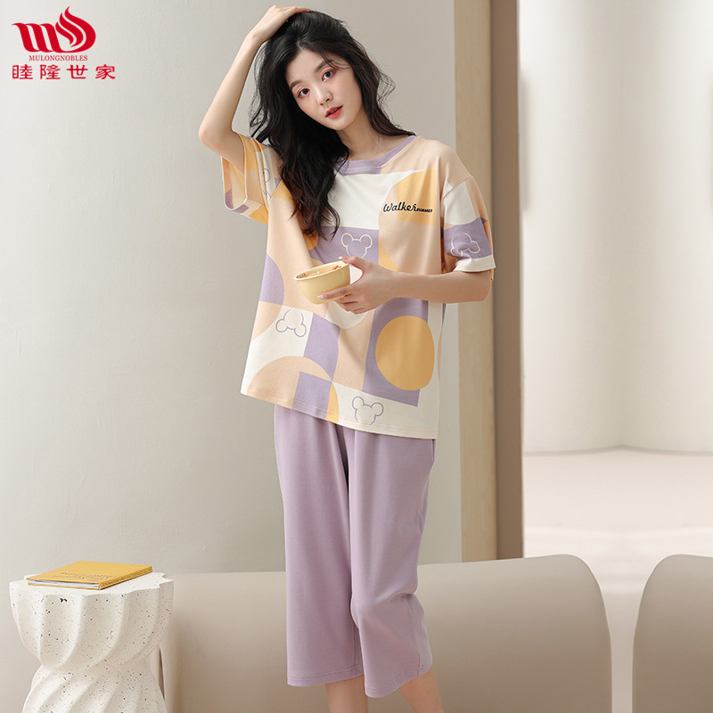Mulong 귀족 가족 잠옷 여자의 봄과 여름 2023 새로운 면 반팔 카프리 바지 캐주얼 심플 가정복 세트