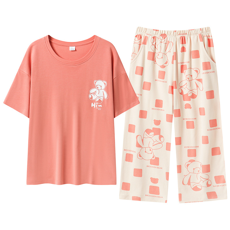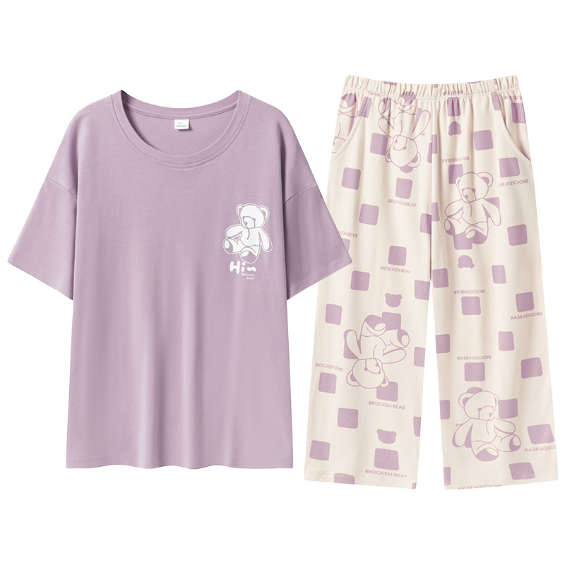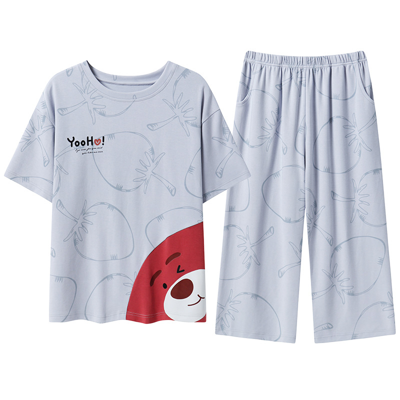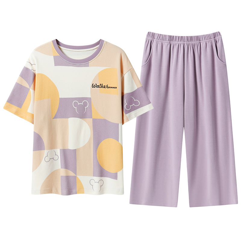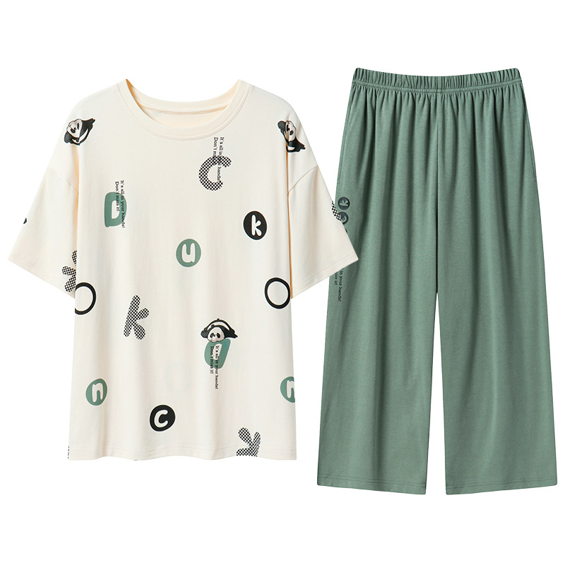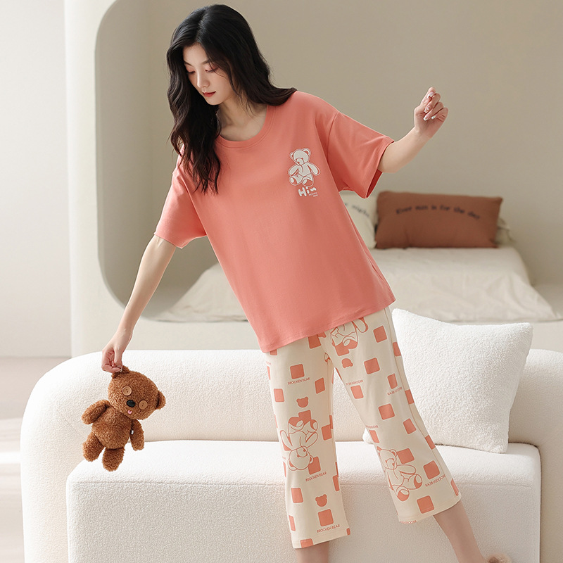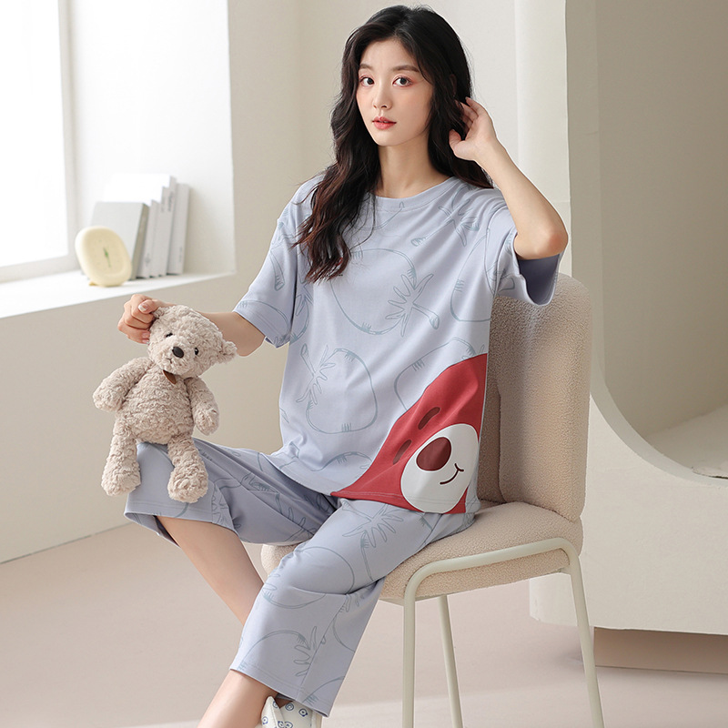 Mulong 귀족 가족 잠옷 여자의 봄과 여름 2023 새로운 면 반팔 카프리 바지 캐주얼 심플 가정복 세트