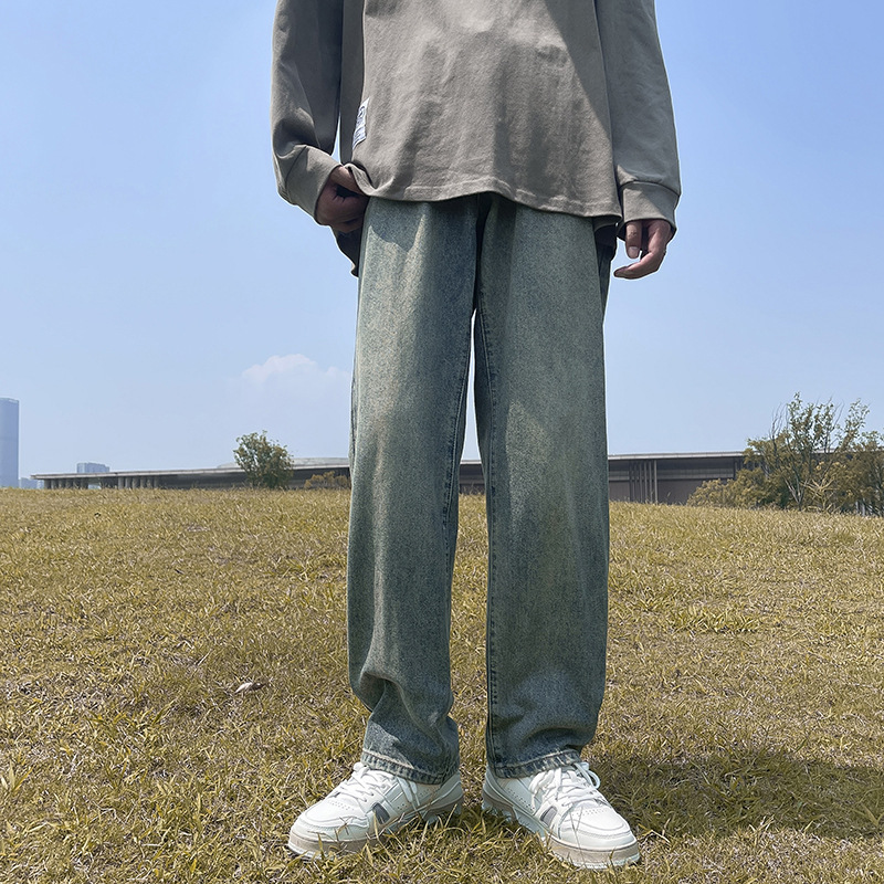 美式高街复古水洗做旧五角星刺绣牛仔裤男潮牌宽松休闲直筒阔腿裤