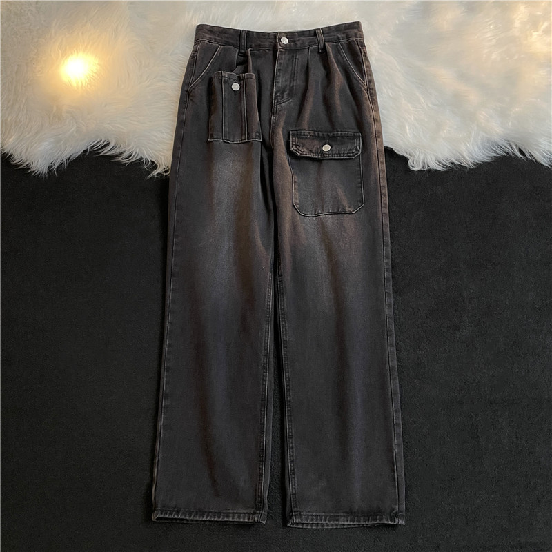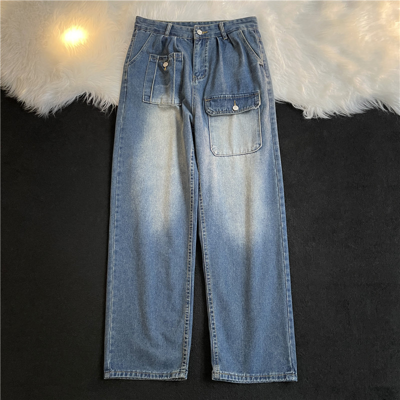 멀티 포켓 칵테일 청바지 가을과 겨울 일본식 워싱 스트레이트 팬츠 루즈한 와이드 팬츠 남성용 트렌디 브랜드스토어 가기
