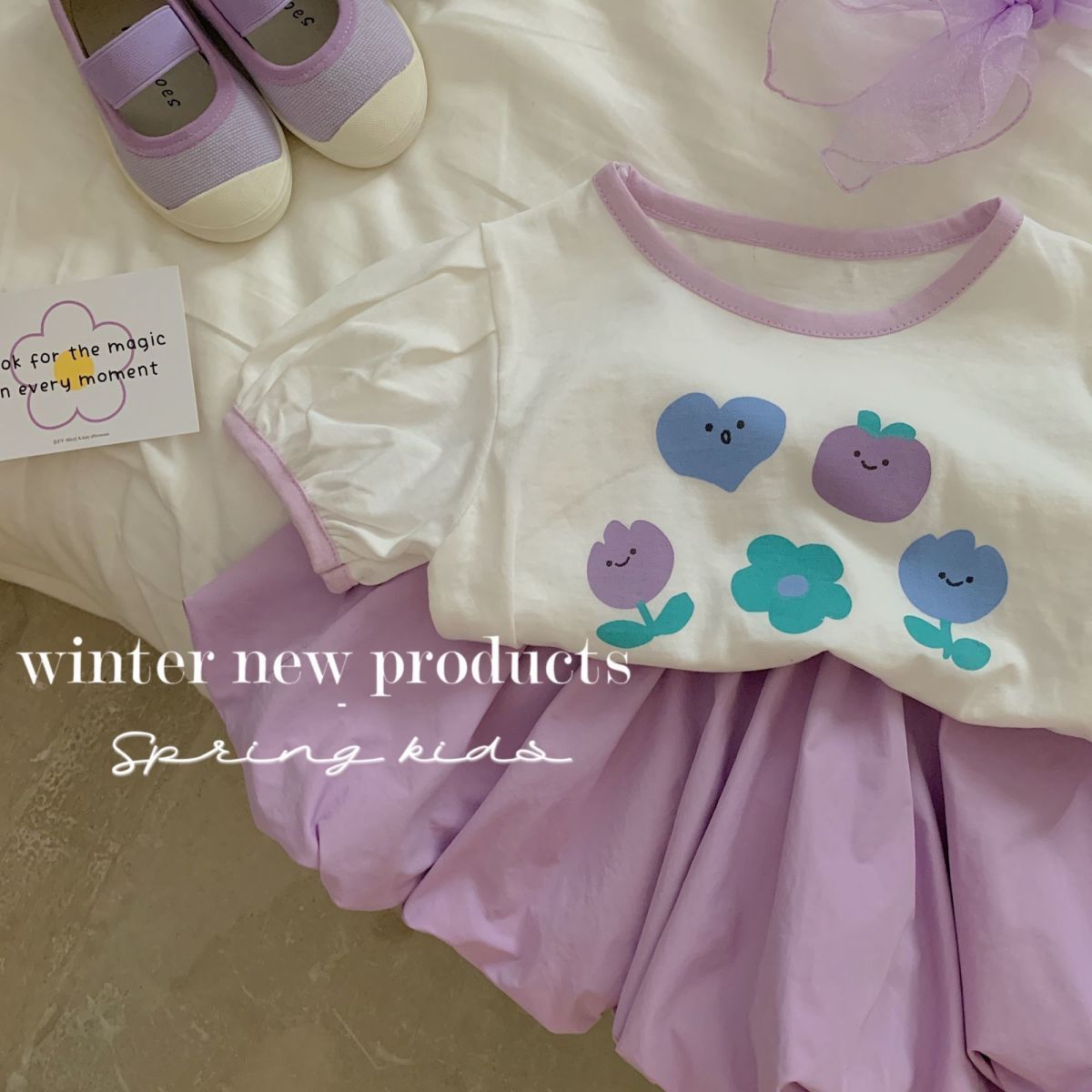 여자 여름 세트 2025 새로운 한국식 아기 소녀의 보라색 짧은 T-버드 반바지 소녀 투피스 세트스토어 가기