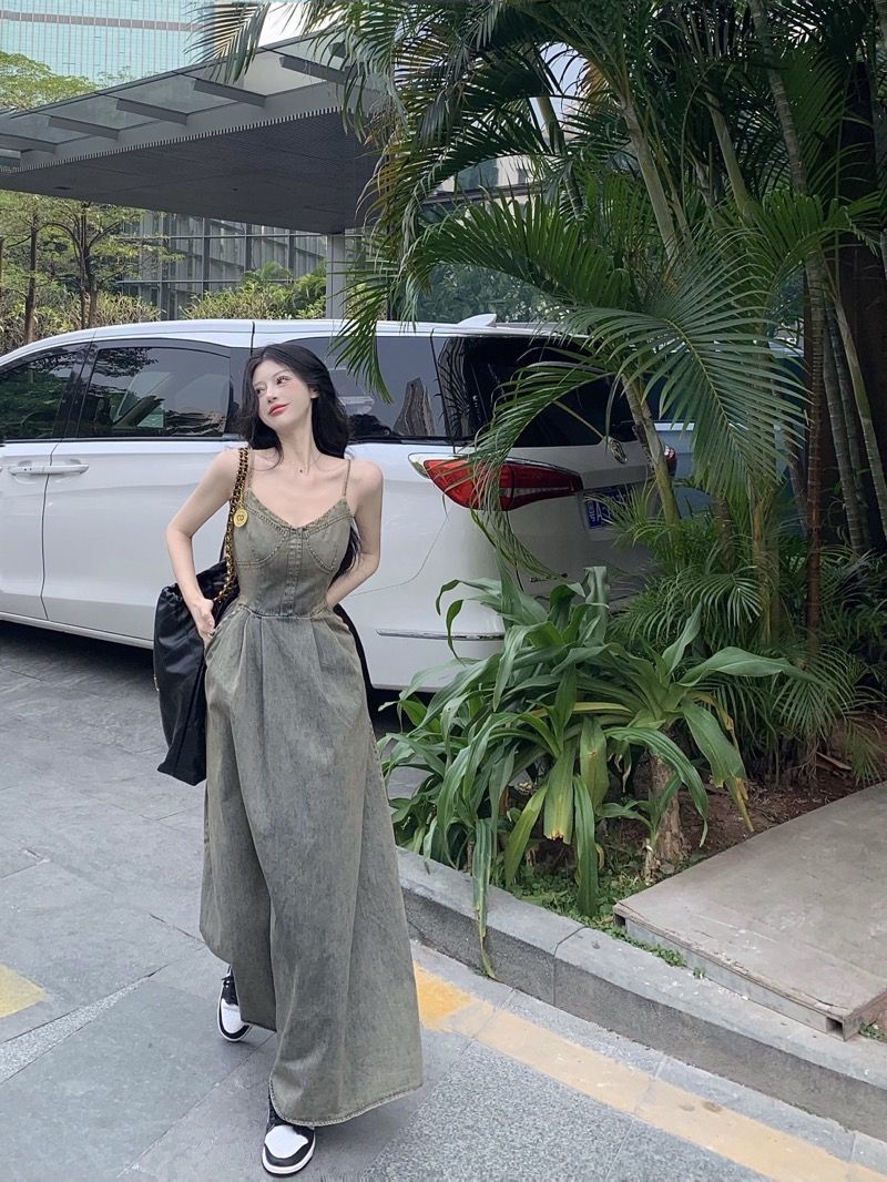 ~ 민소매 스타일로 허리를 잘록하게 잡아주는 롱 레트로 빈티지 데님 멜빵 원피스, 슬림하고 우아합니다스토어 가기