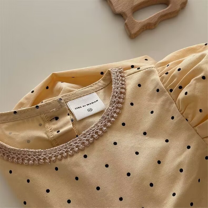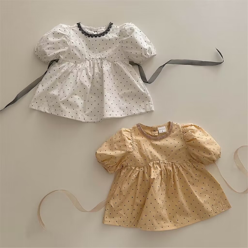 In2023 한국 스타일 아동복 아기 여름 라운드 넥 여아 물방울 무늬 레이스 아웃 외국 스타일 원피스스토어 가기