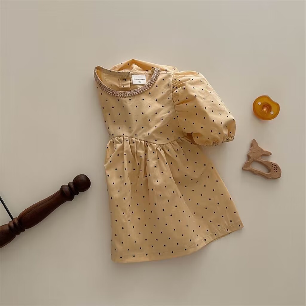 In2023 한국 스타일 아동복 아기 여름 라운드 넥 여아 물방울 무늬 레이스 아웃 외국 스타일 원피스