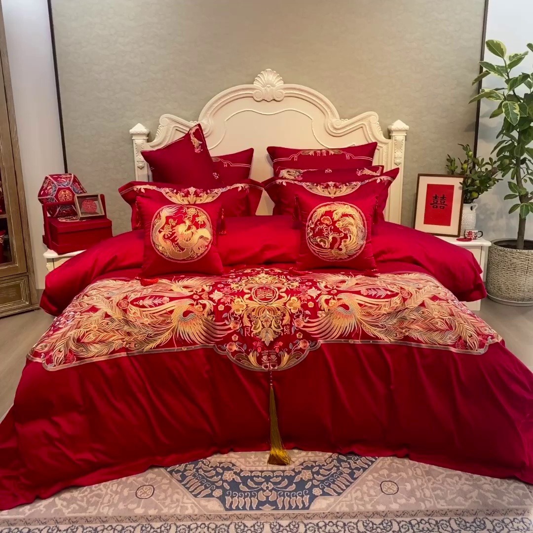 새로운 중국 스타일 고급 분위기 레드 웨딩 순면 면 자카드 세트 웨딩 신혼 부부 이불 커버 사이 이불 침구스토어 가기