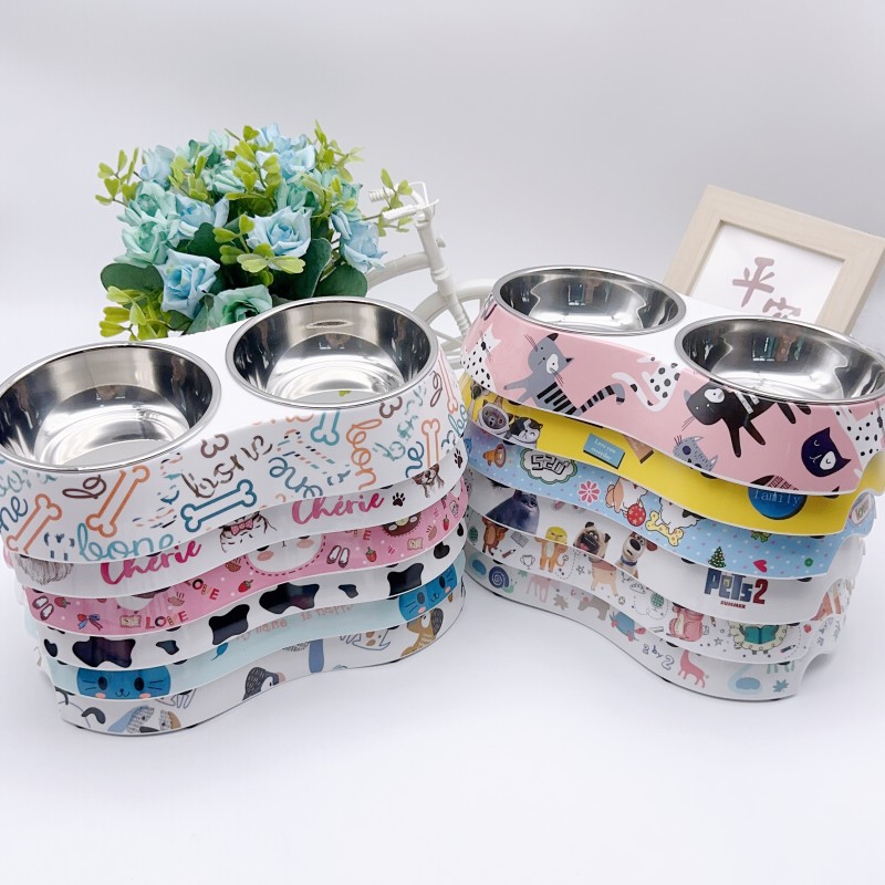만화 멜라민 스테인레스 스틸 더블 그릇 고양이 그릇 개 그릇 개 사료 분지 안티 노크 쉬운 청소 고양이와 개를위한 범용 애완 동물 용품스토어 가기