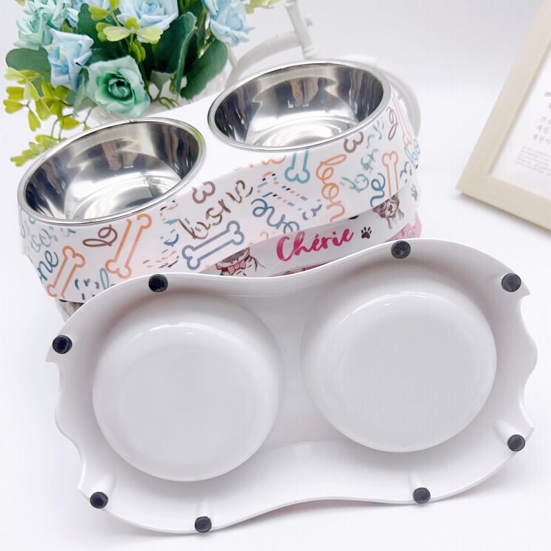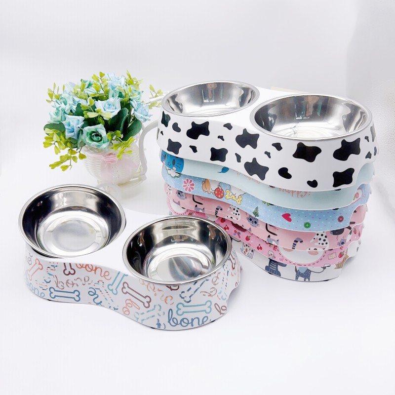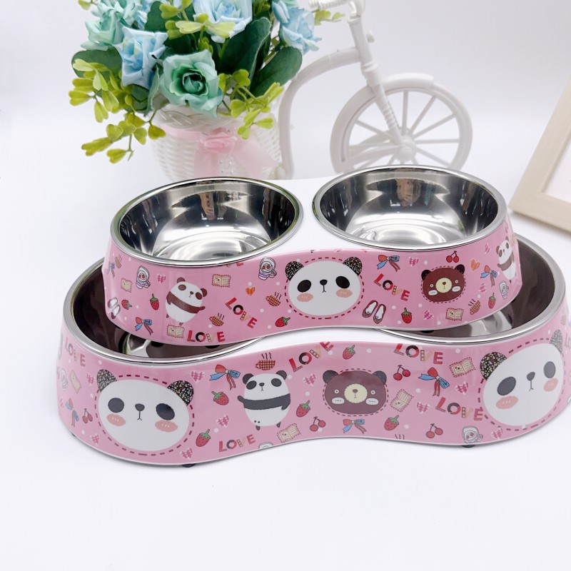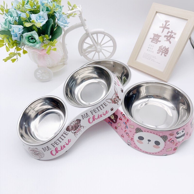 만화 멜라민 스테인레스 스틸 더블 그릇 고양이 그릇 개 그릇 개 사료 분지 안티 노크 쉬운 청소 고양이와 개를위한 범용 애완 동물 용품