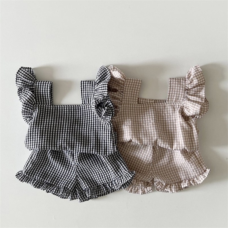 여름 아기 소녀의 귀 민소매 조끼 셔츠 반바지 투피스 세트 어린이 격자 무늬 세트 한국스토어 가기