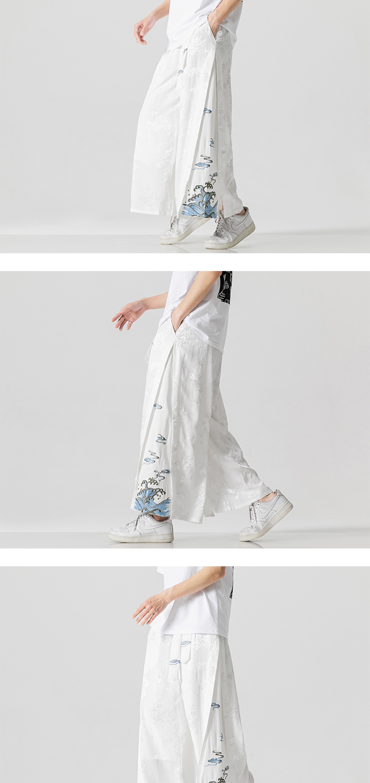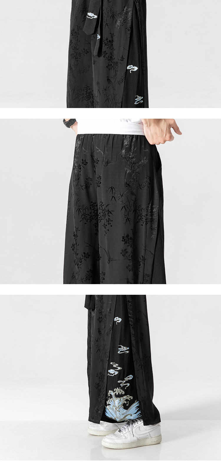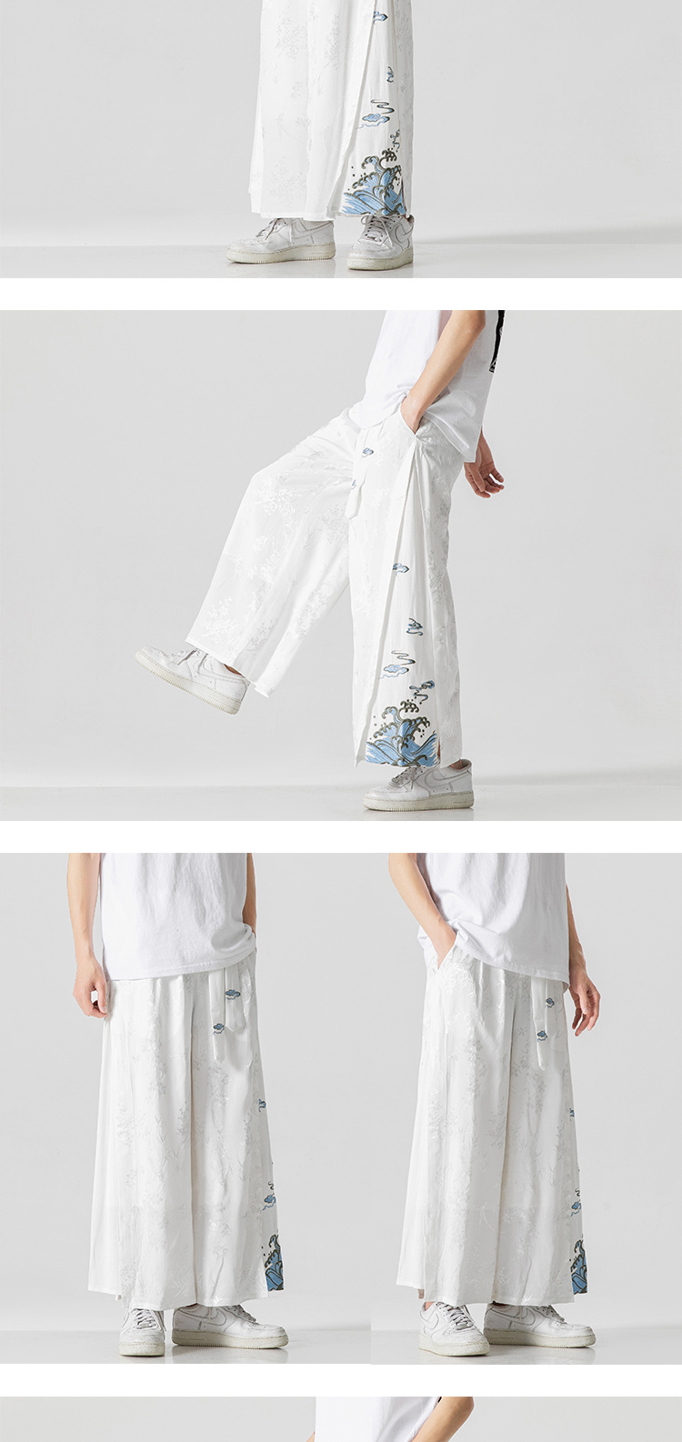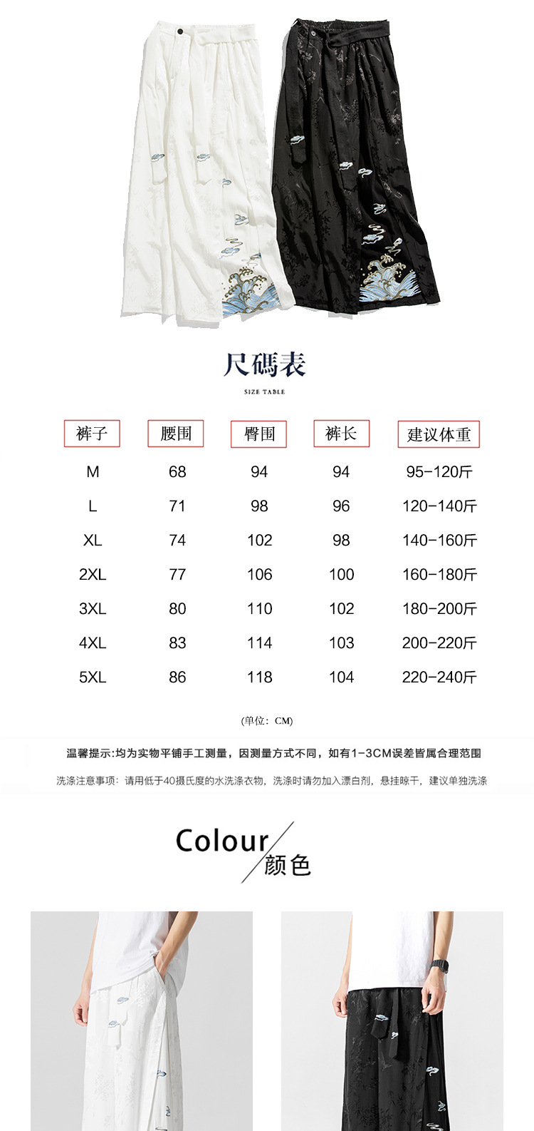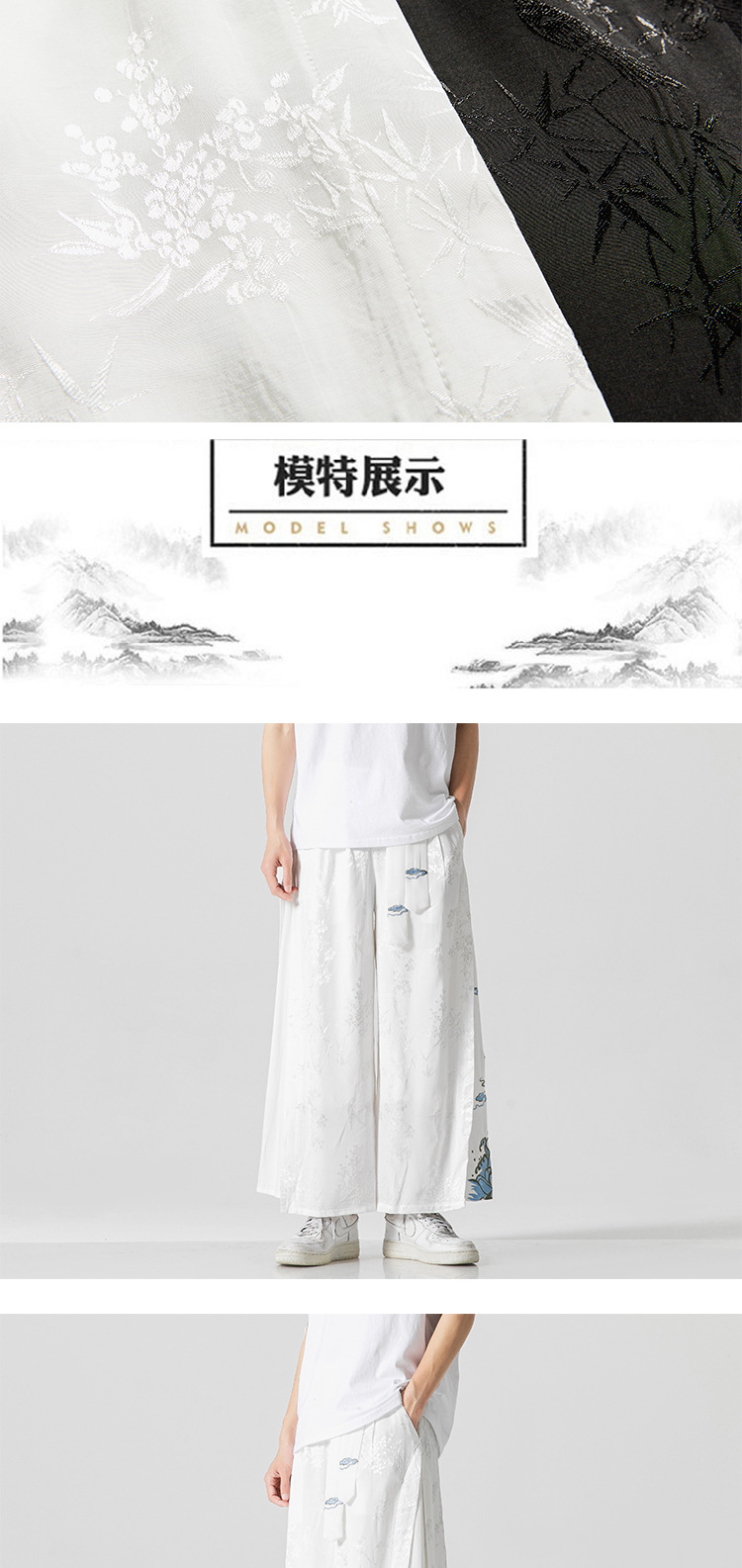 2023 새로운 여름 중국 스타일 면 및 대마 바지 유행 민족 스타일 중공업 자수 와이드 다리 바지 Hanfu Tang 세트 고대 의상