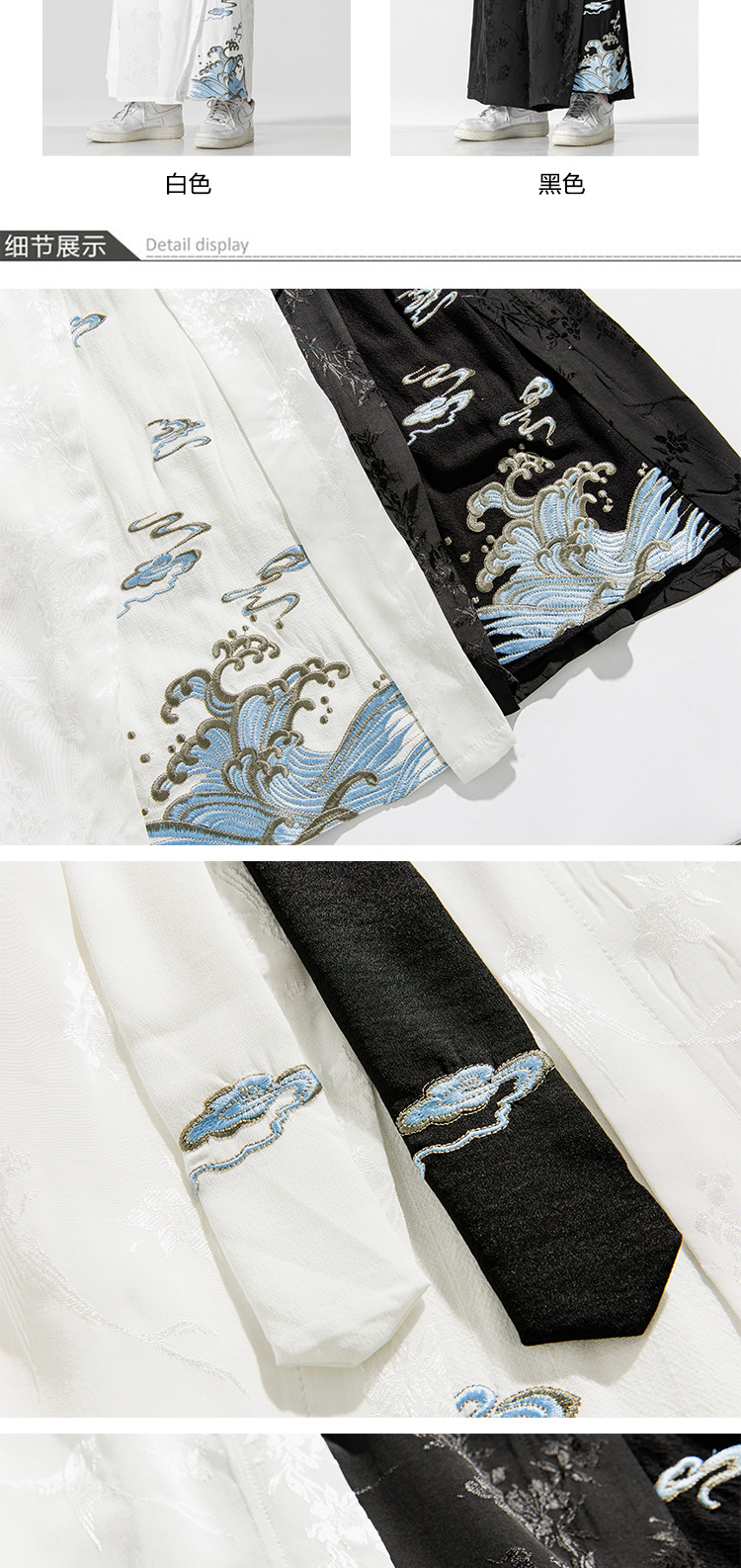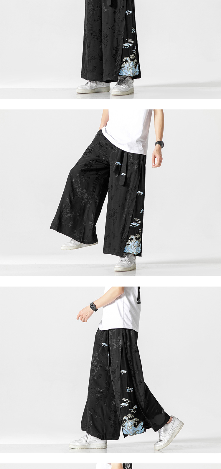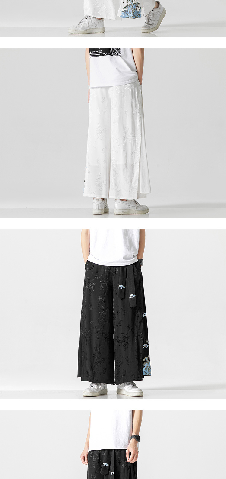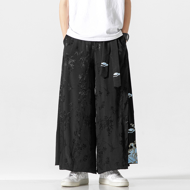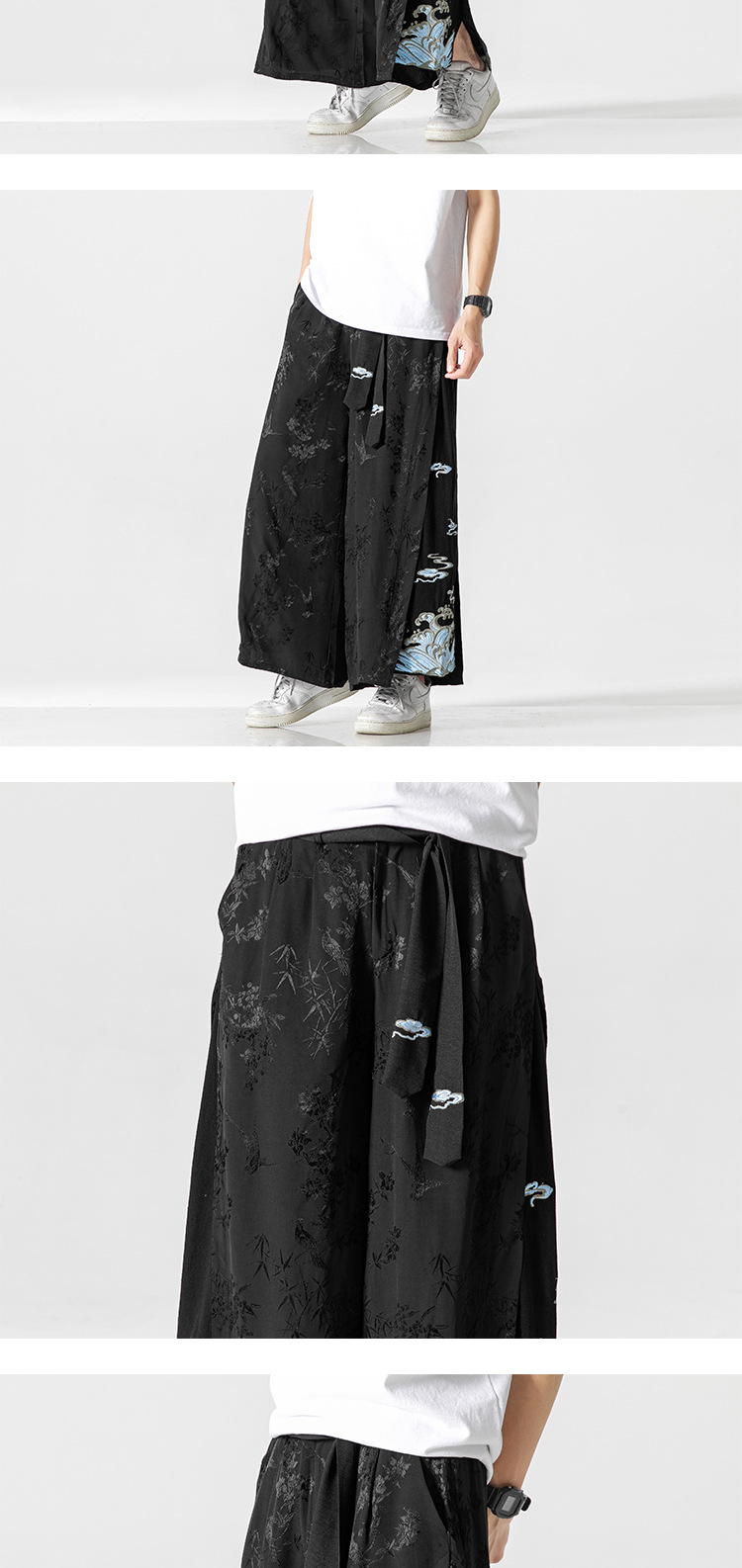 2023 새로운 여름 중국 스타일 면 및 대마 바지 유행 민족 스타일 중공업 자수 와이드 다리 바지 Hanfu Tang 세트 고대 의상
