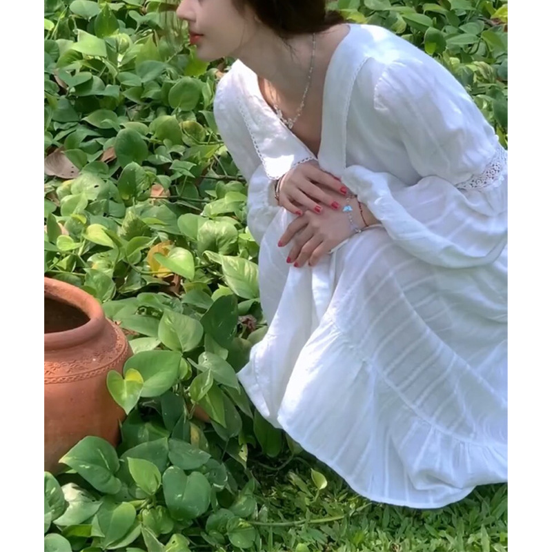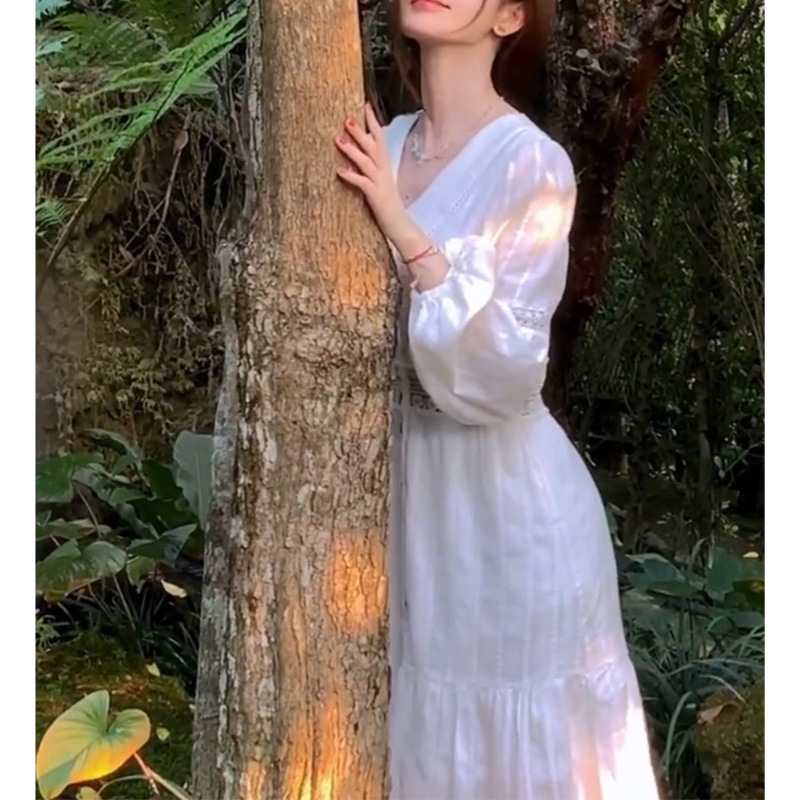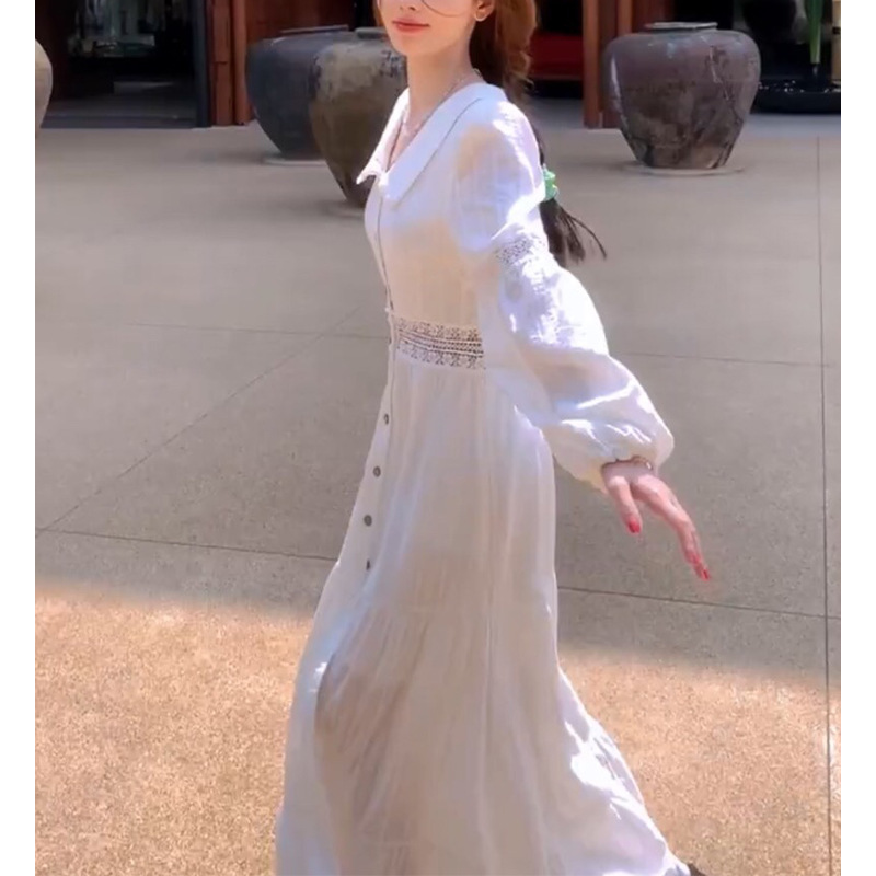 Jingyi 같은 스타일 부드러운 스타일 차 휴식 프랑스어 화이트 원피스 질감 고급 여성의 여름 새로운 긴 원피스스토어 가기