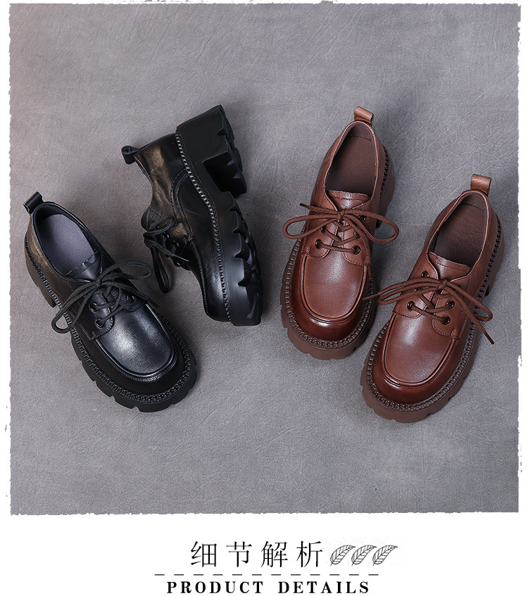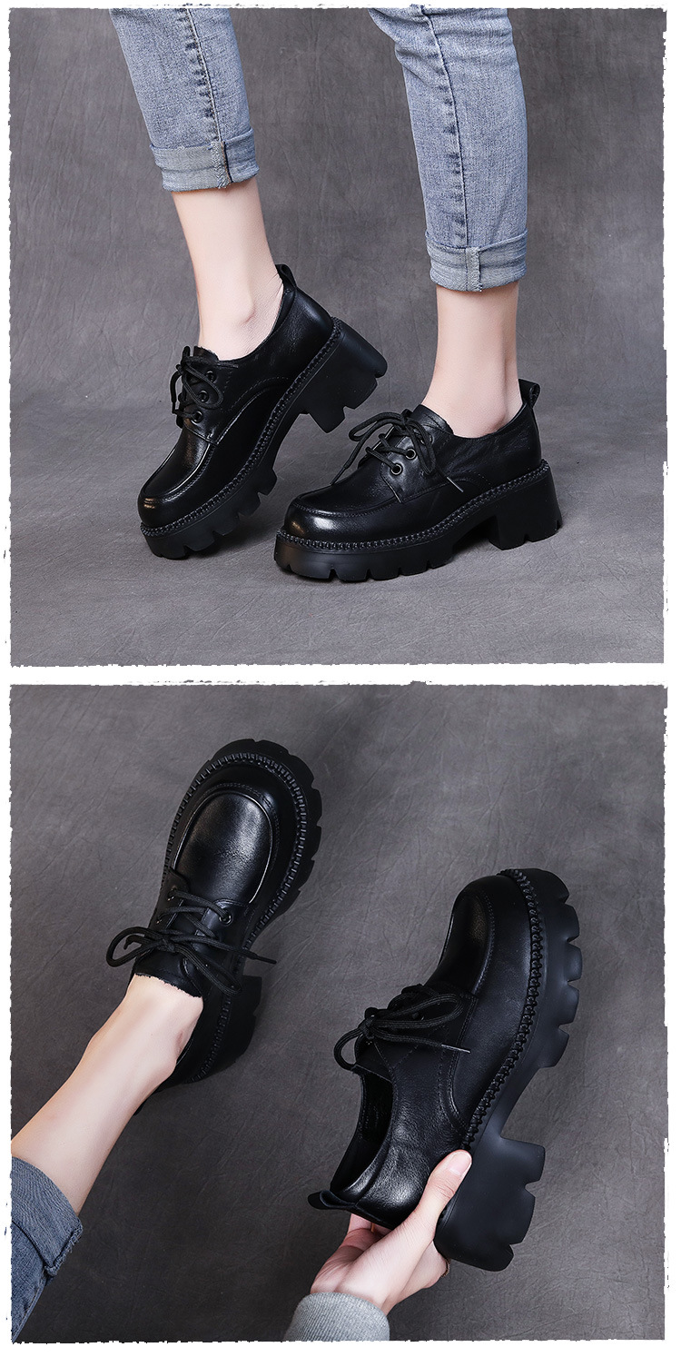 6cm 굽 높은 1층 소가죽 레이스업 여성용 두꺼운 굽 로퍼, 두꺼운 밑창, 사계절 초경량 천연가죽 싱글 슈즈, 캐주얼하고 다용도스토어 가기