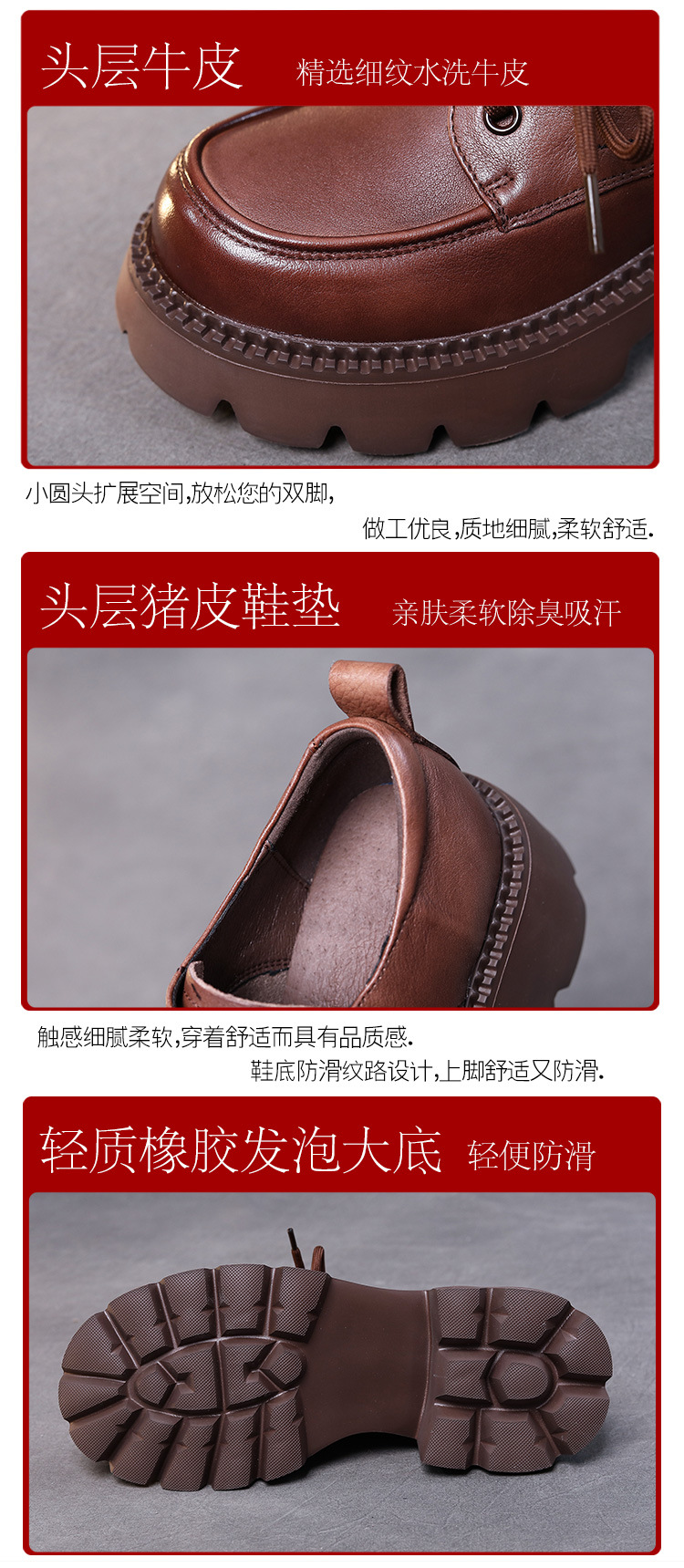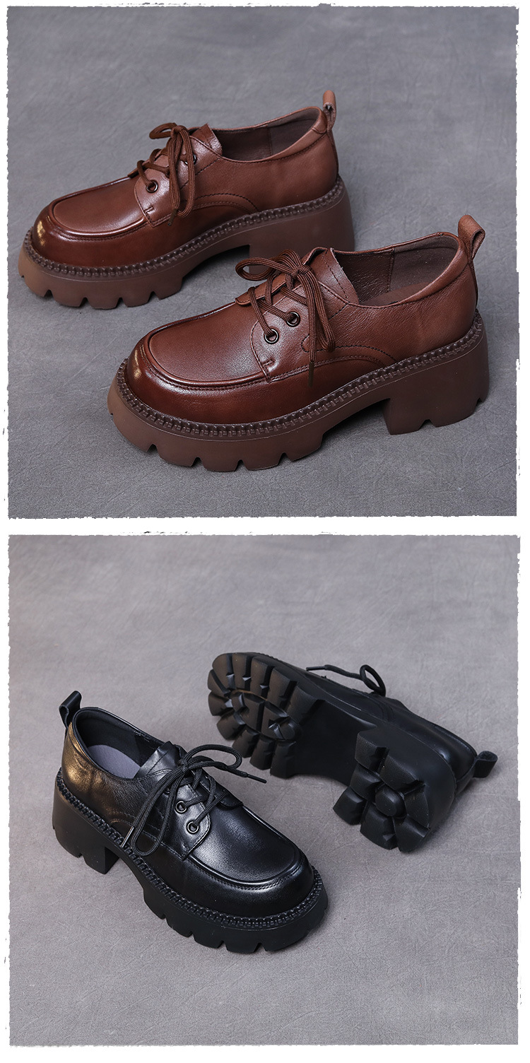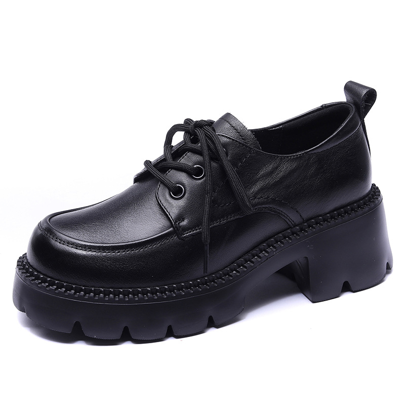 6cm 굽 높은 1층 소가죽 레이스업 여성용 두꺼운 굽 로퍼, 두꺼운 밑창, 사계절 초경량 천연가죽 싱글 슈즈, 캐주얼하고 다용도