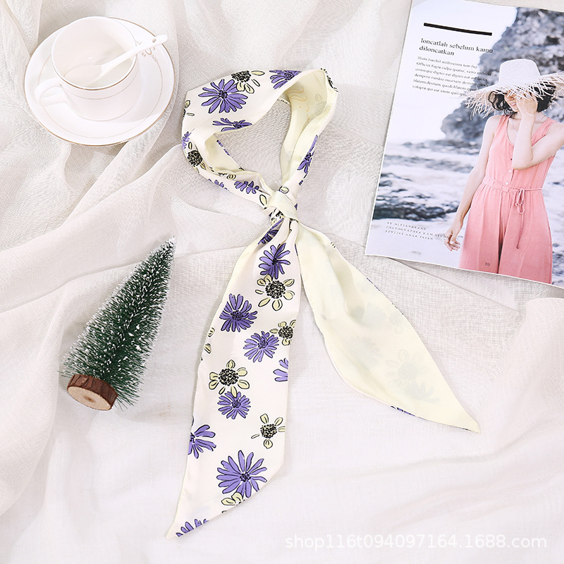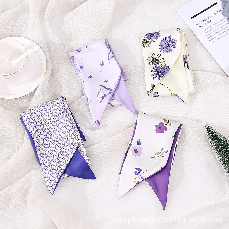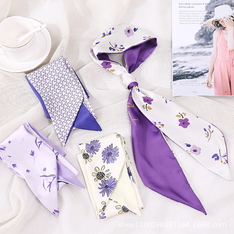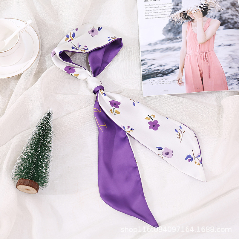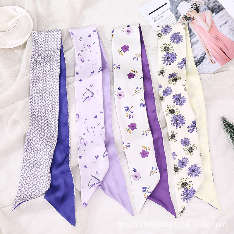 프랑스 로맨틱 작은 실크 스카프 보라색 좁은 리본 넥타이 천 스트랩 헤어 타이 모든 매치 헤어 밴드 긴 인쇄 헤어 액세서리